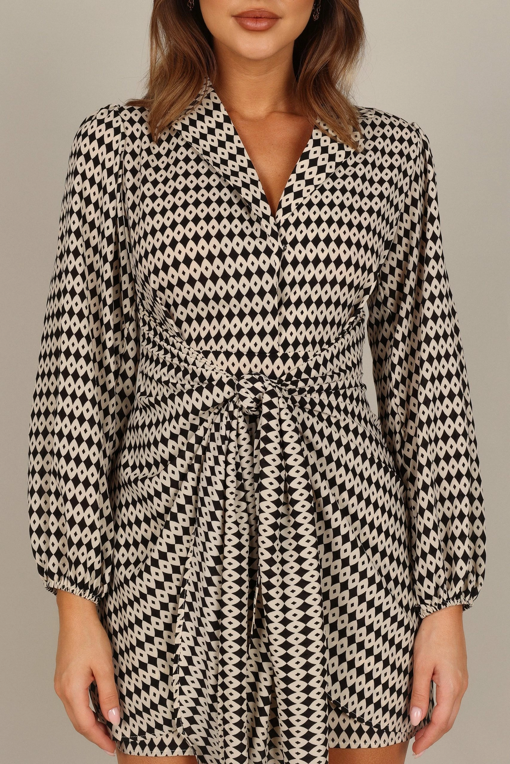 | DETAILS Bring the fun to your wardrobe with this wrap style mini dress! Featuring an above knee length, a spread collar, and a v neckline with snap buttons, it’s easy to slip into for any occasion. An attached faux wrap skirt design is complete with a tie close for added detail to this abstract print piece. Show off your inner fashionista and flaunt your style in this wrap dress!