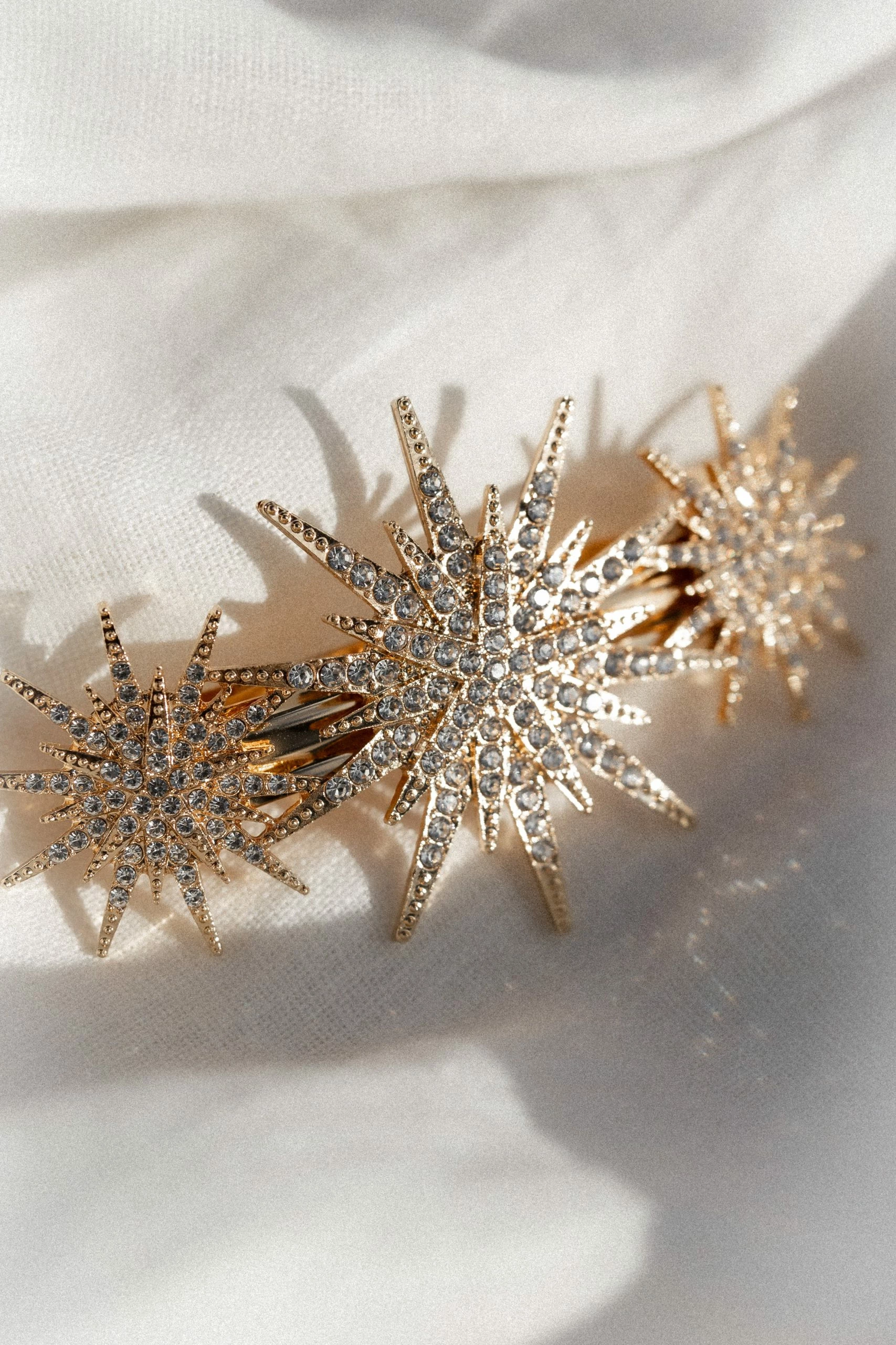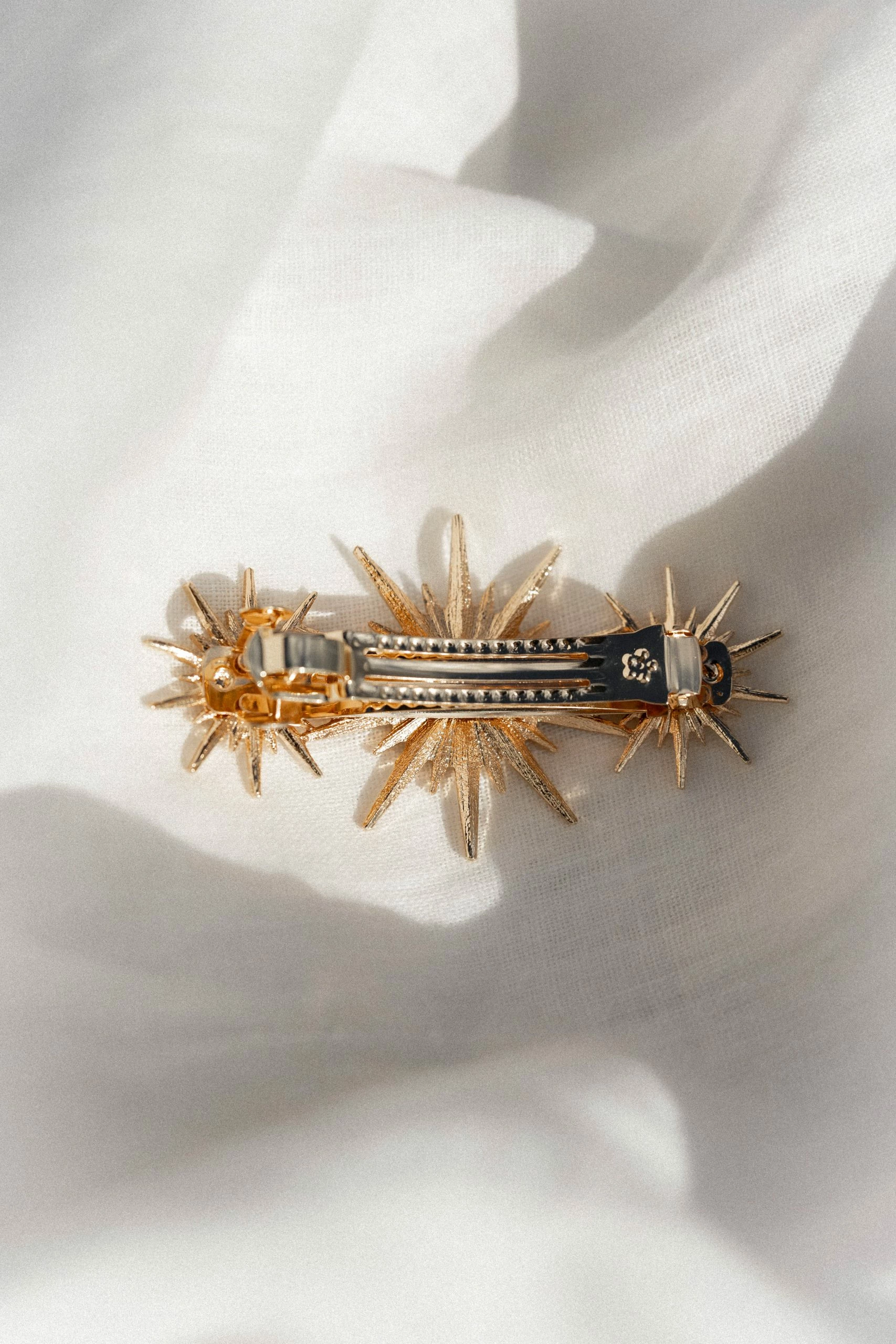 | DETAILS This hair clip is the perfect accessory to complete your look. The star design, set with a crystal detail, will add an element of sparkle and shine. Crafted from gold metal hardware, this piece has a secure push pin fastening for easy styling and comfort all day long.