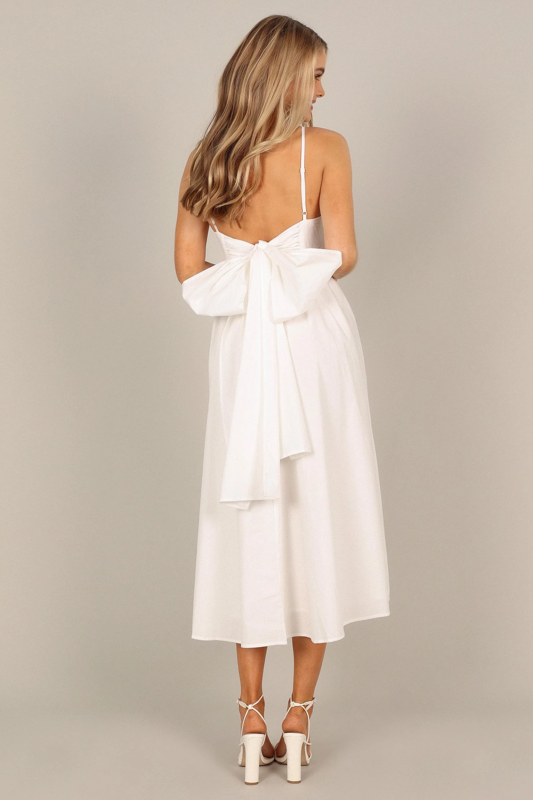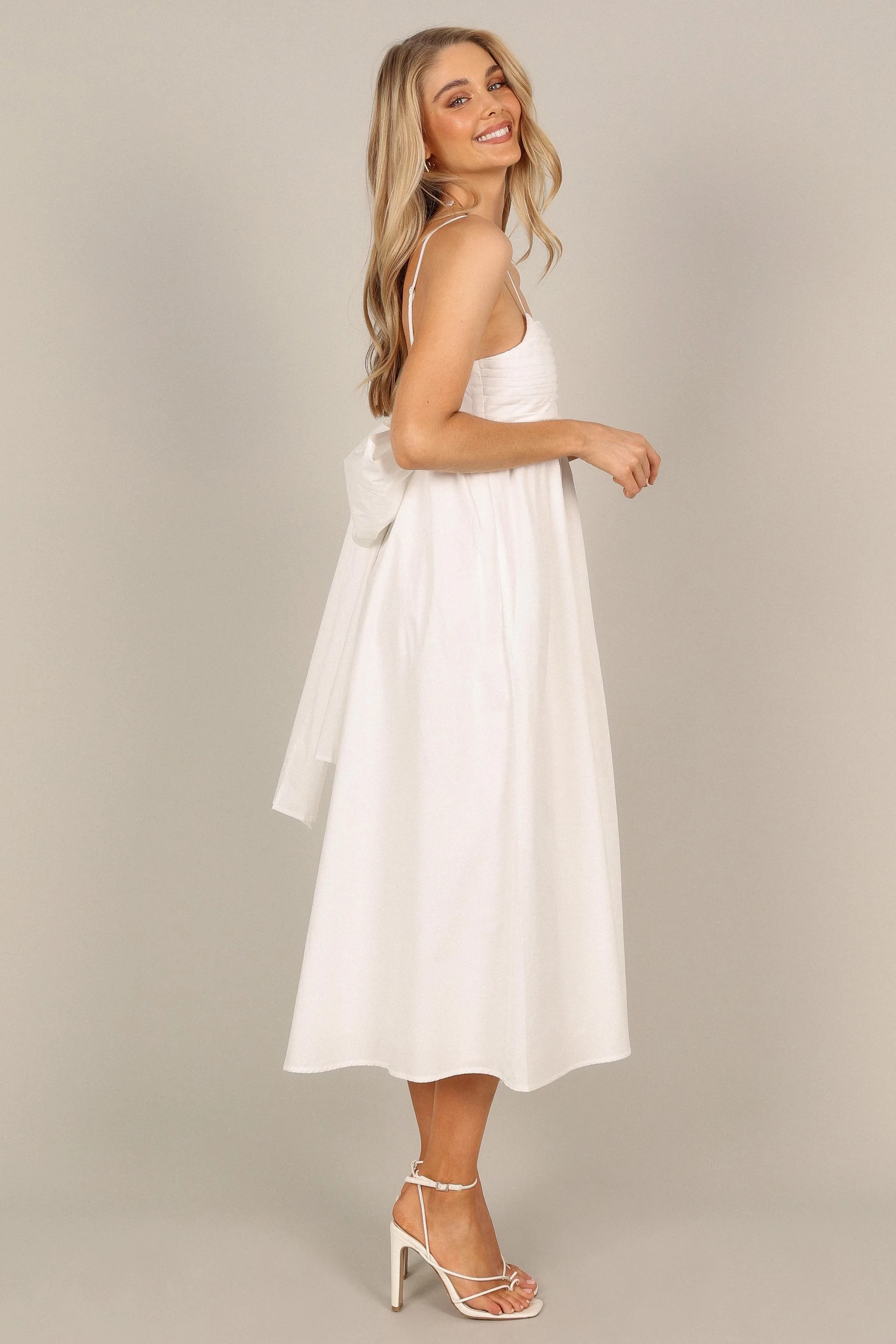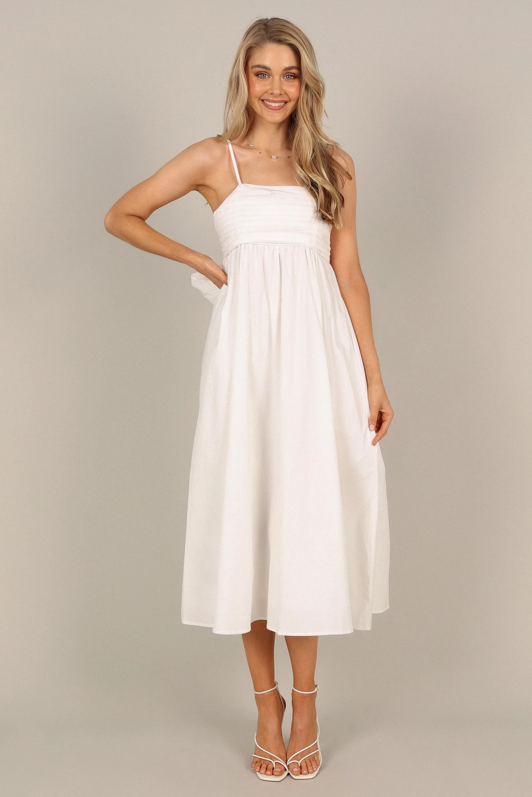 | DETAILS This midi length dress is the perfect balance of fun and elegance! With a straight neckline, thin adjustable straps, pleated bust detail and an adorable back bow tie feature, you’ll feel totally glamorous.