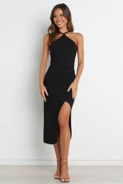 | DETAILS This midi length dress is perfect for all your special occasions! Its square neckline and wide adjustable shoulder straps with button close give it a classic look, while the back tie detail adds just the right touch of femininity.