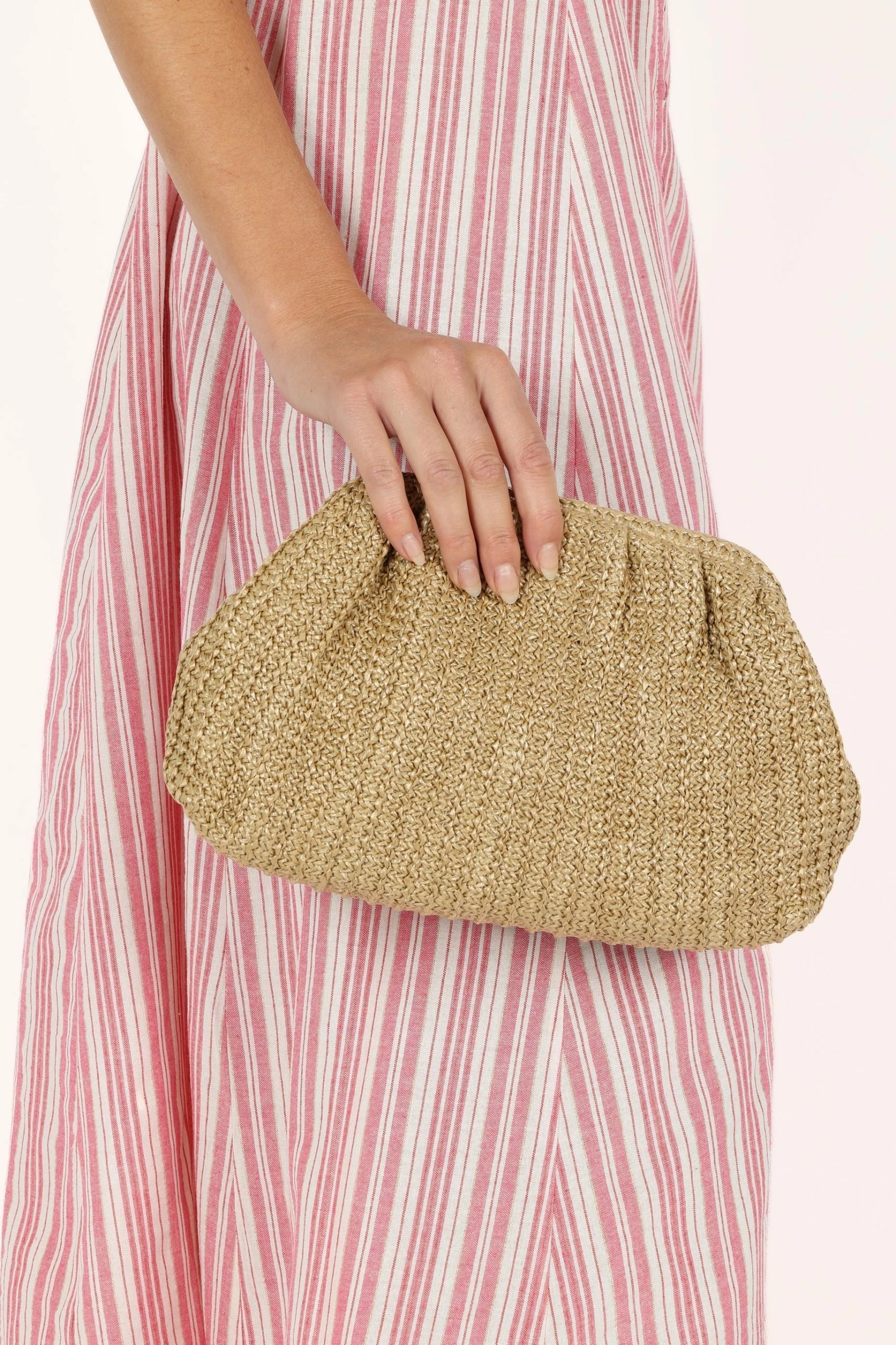 | DETAILS This straw clutch has been crafted with a unique woven design and is the perfect piece for your next outing. The hinge closure makes sure that all of your belongings stay secure all night long!