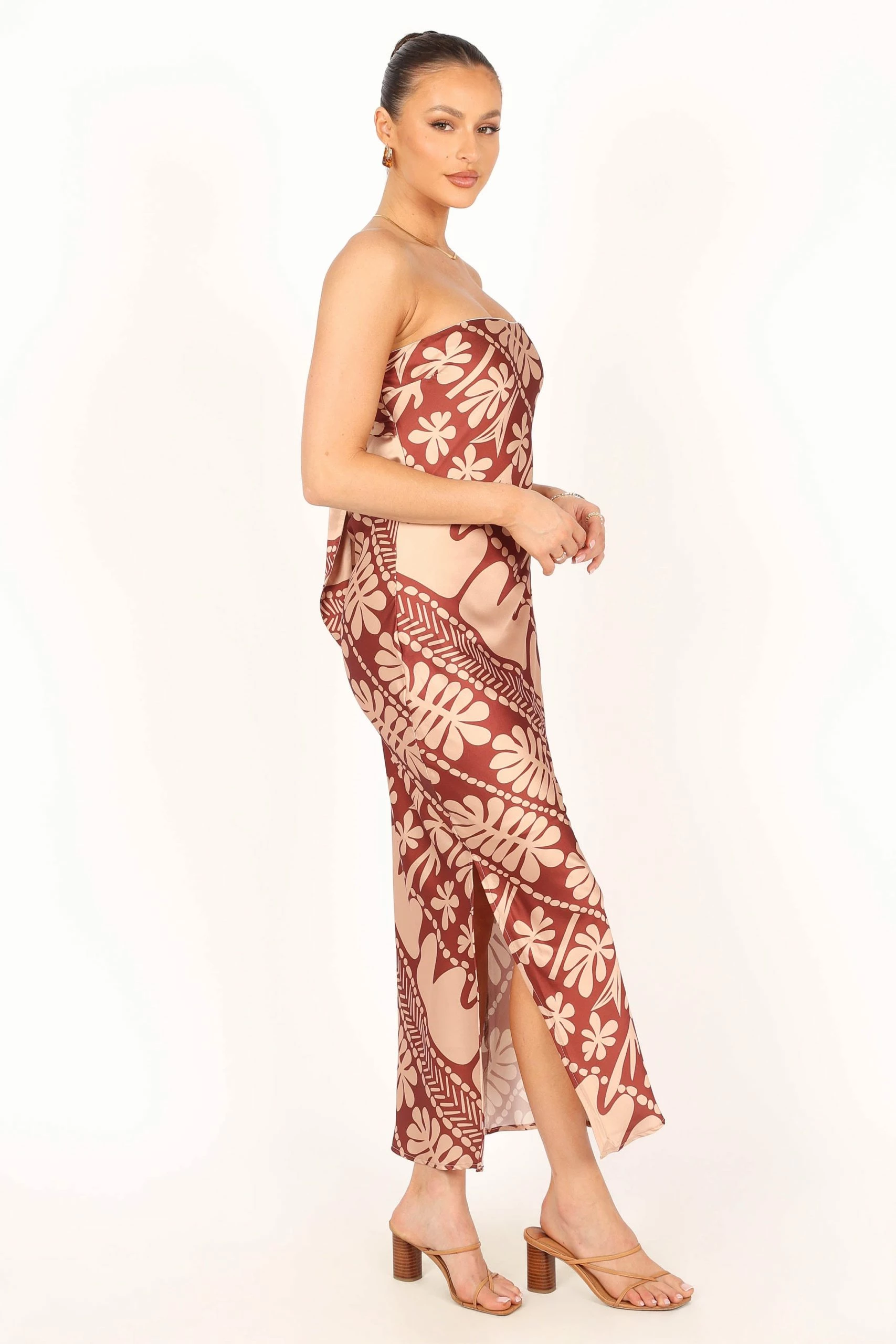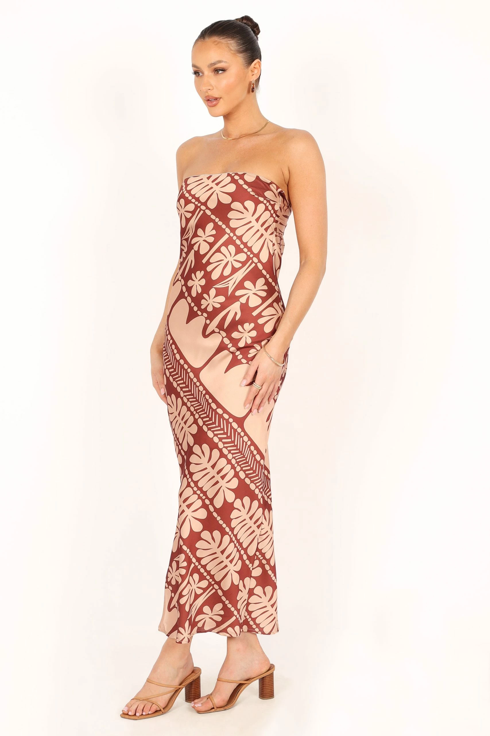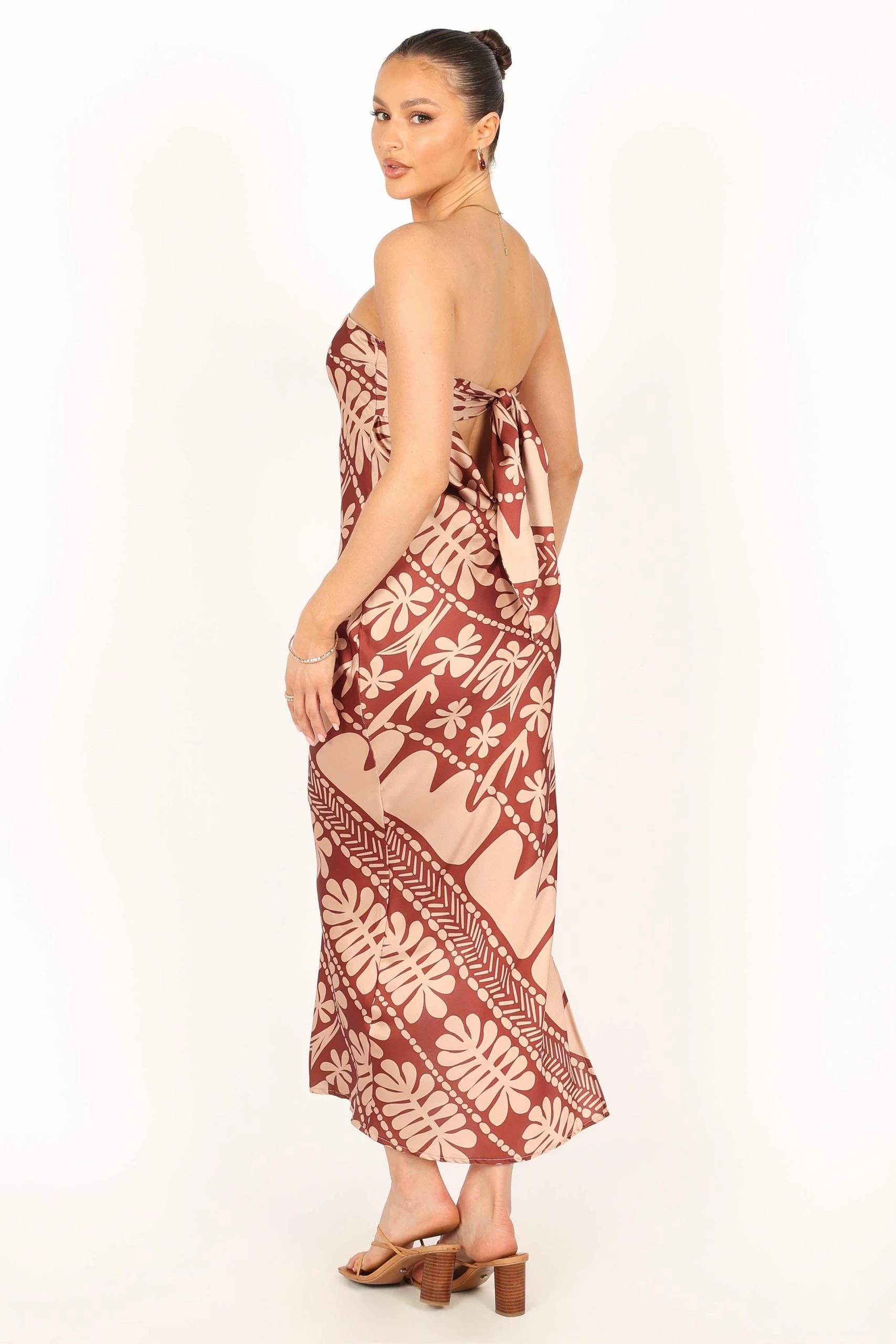| DETAILS This season, make a statement in our beautiful strapless maxi dress! The perfect combination of sweet and sassy, this eye-catching piece features a straight neckline and an open cowl back with tie closure.