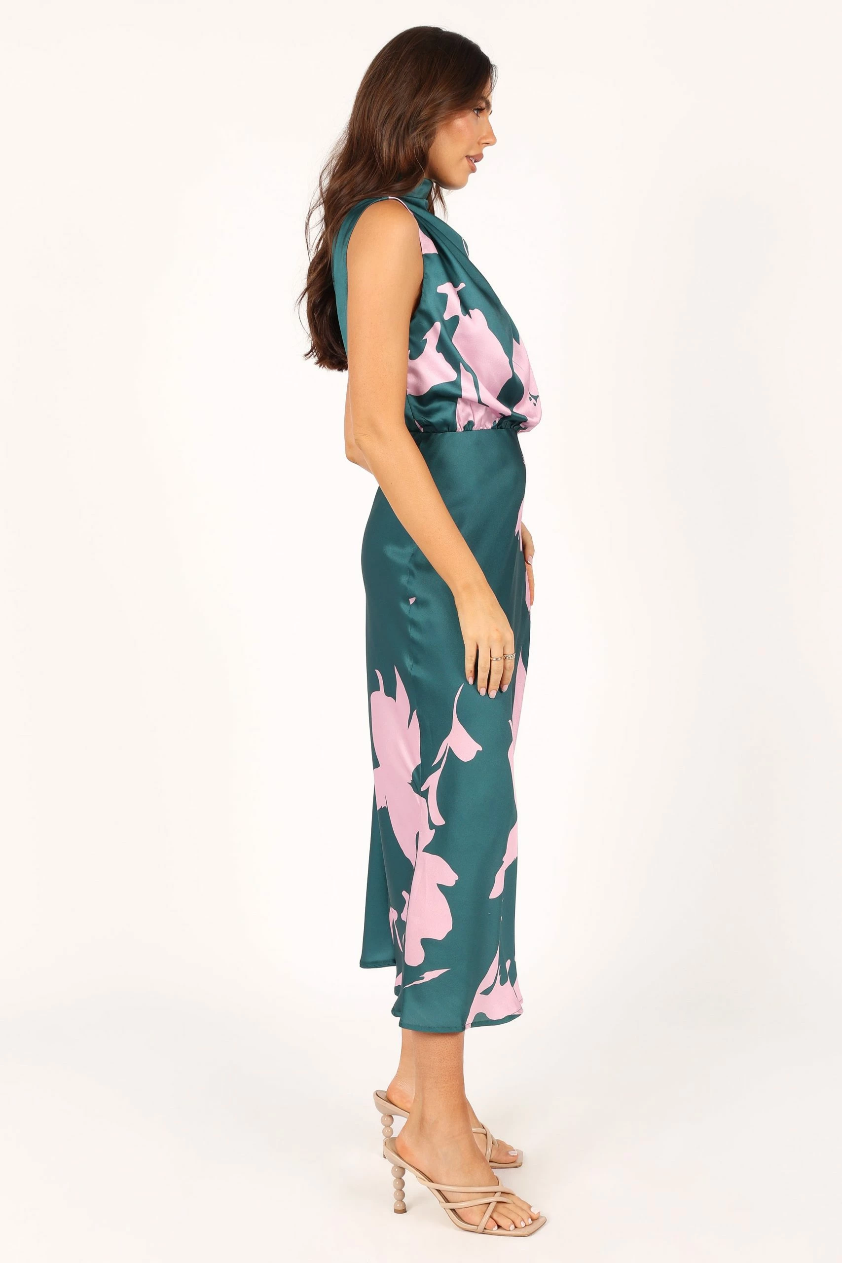 | DETAILS Look and feel your best in this stunning event wear dress! Featuring a midi length, an asymmetric high round neckline with gathered pleat detail, plus a back neck opening with button close, it’s the perfect party dress for any special occasion. Not only does it look fabulous, but it feels as good as it looks too ‚Äî crafted from a soft satin feel just for extra comfort.