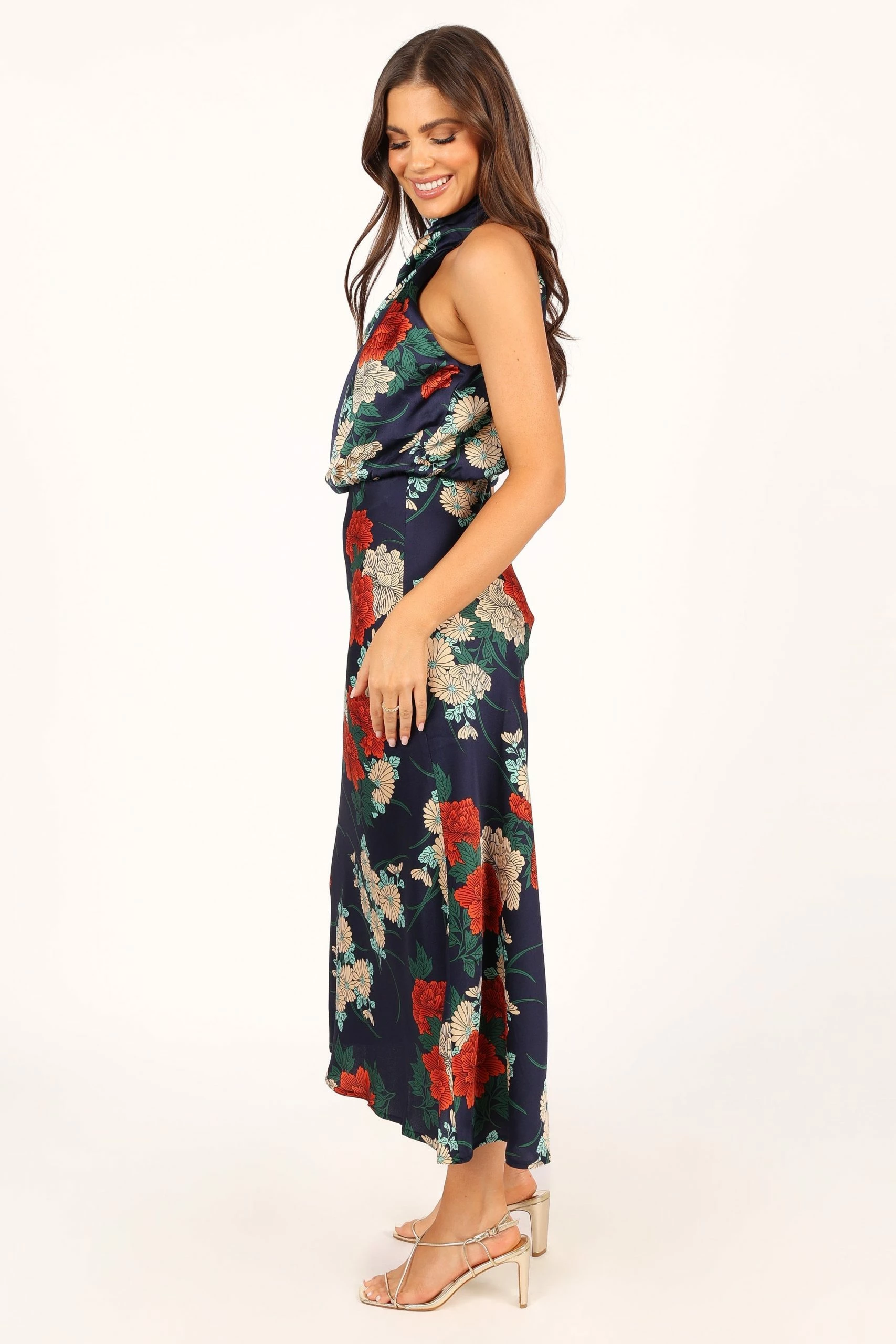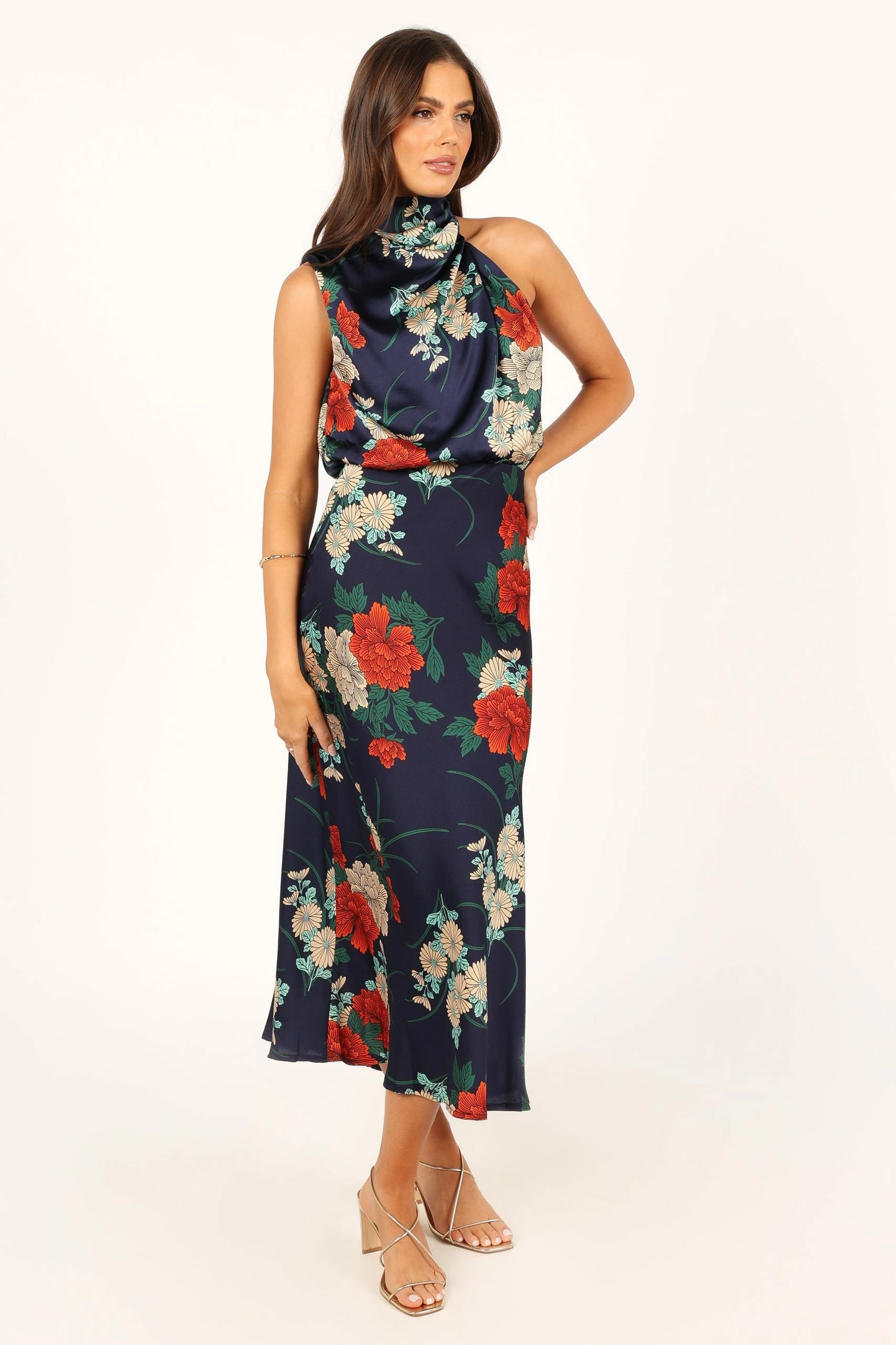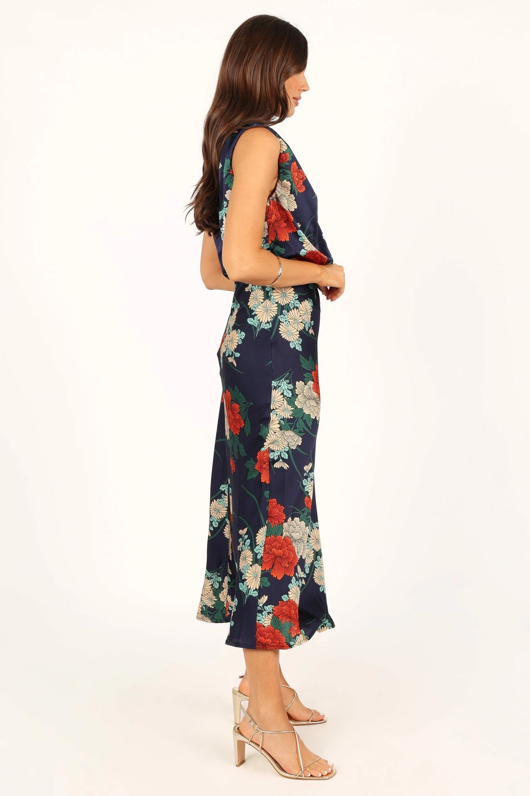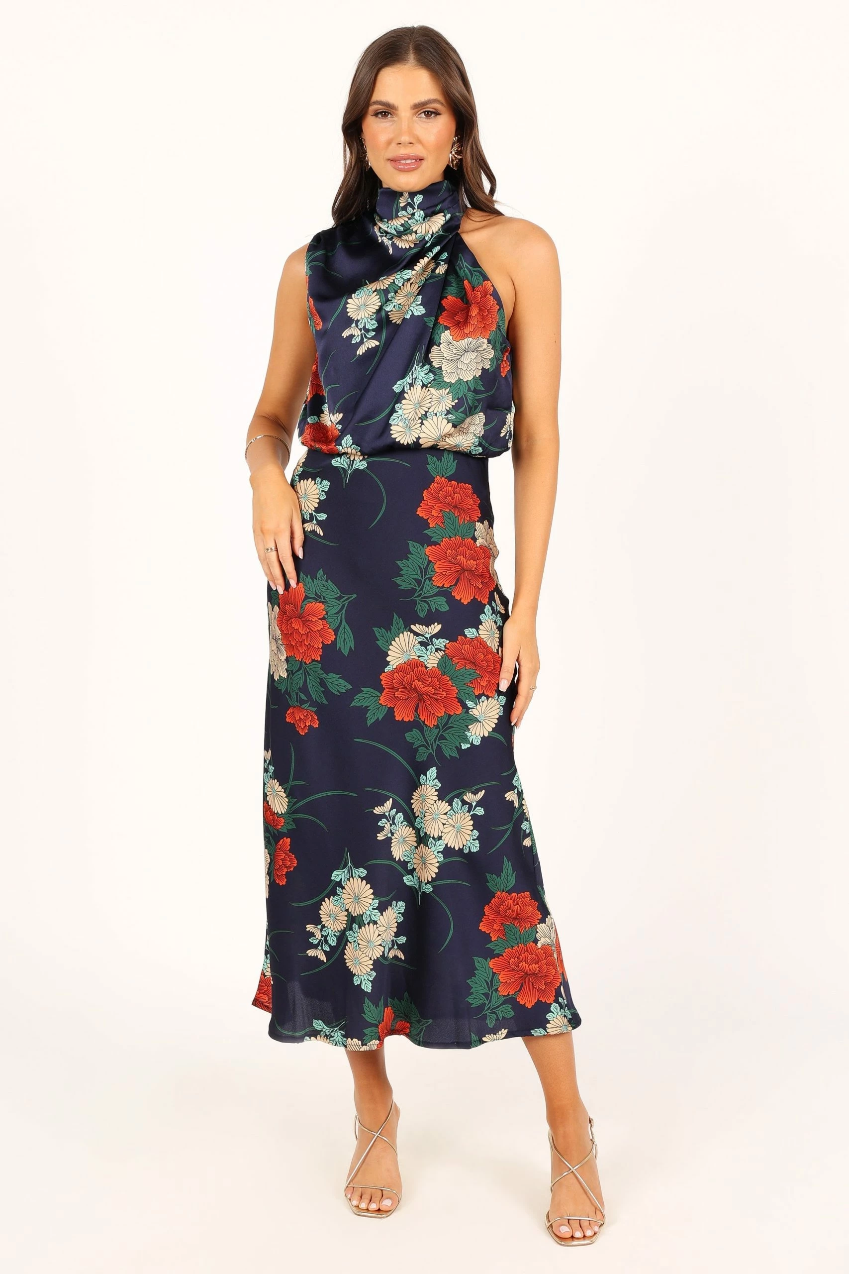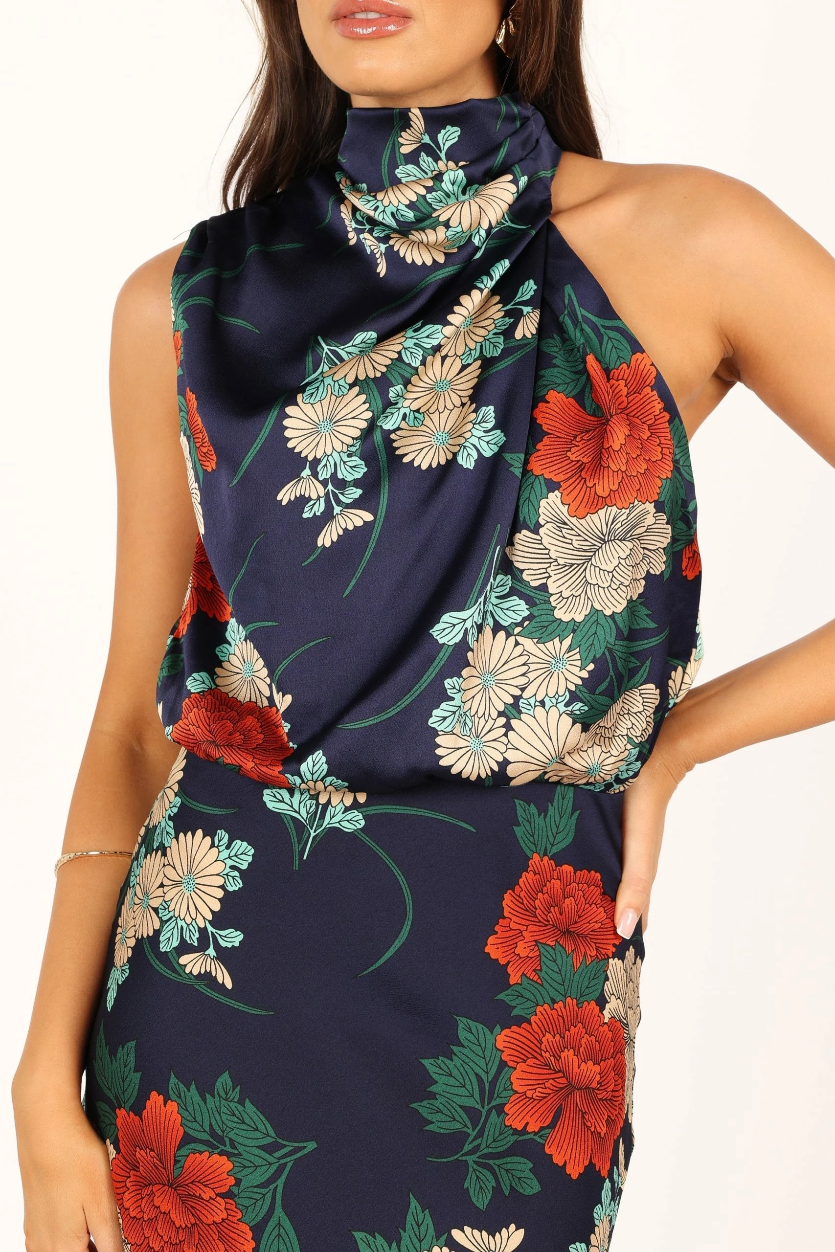 | DETAILS Look and feel your best in this stunning event wear dress! Featuring a midi length, an asymmetric high round neckline with gathered pleat detail, plus a back neck opening with button close, it’s the perfect party dress for any special occasion. Not only does it look fabulous, but it feels as good as it looks too ‚Äî crafted from a soft satin feel just for extra comfort.