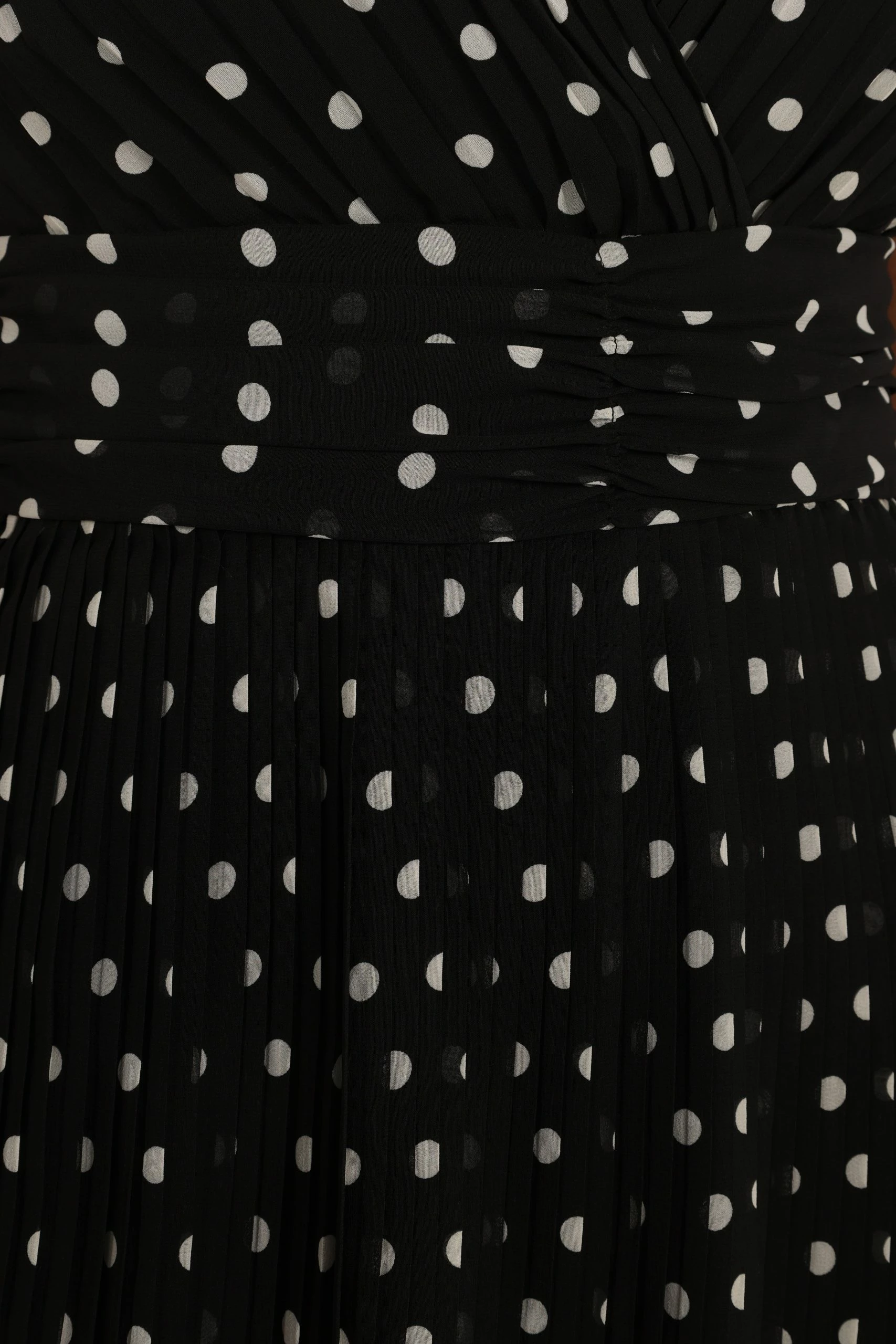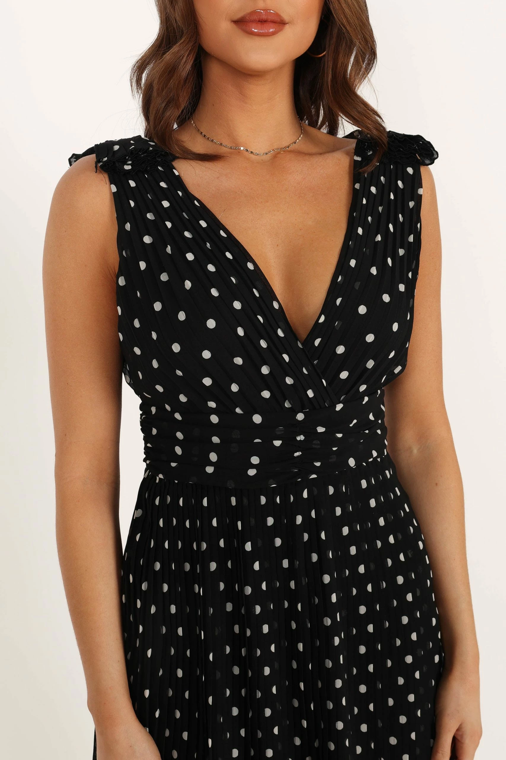 | DETAILS Make a timeless statement with this stunning black and white polka dot maxi dress. Featuring a crossover neckline, non adjustable straps with ruffle detail, gathered bodice feature and invisible side zip with hook and eye clasp, this dress is perfect for any special occasion.