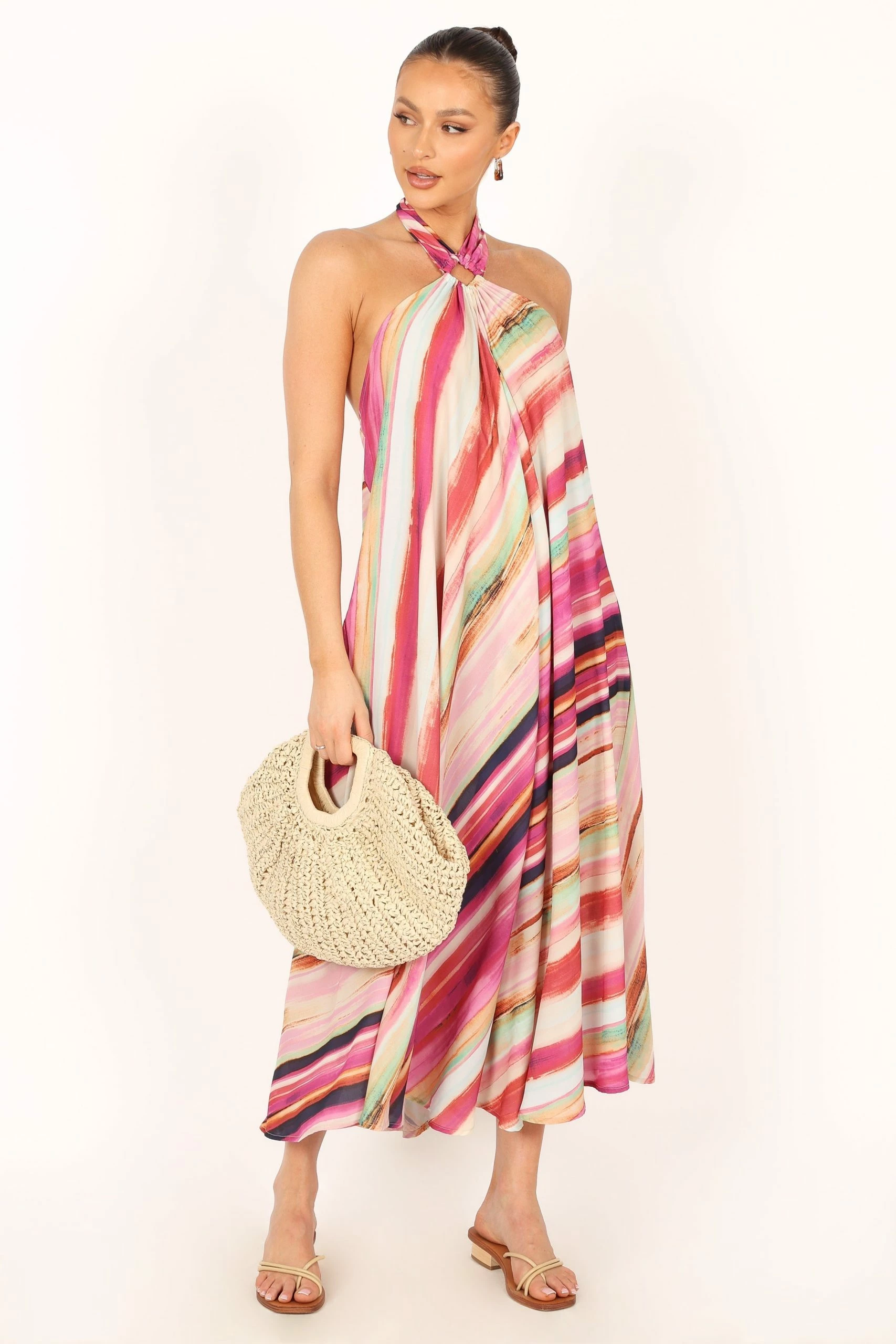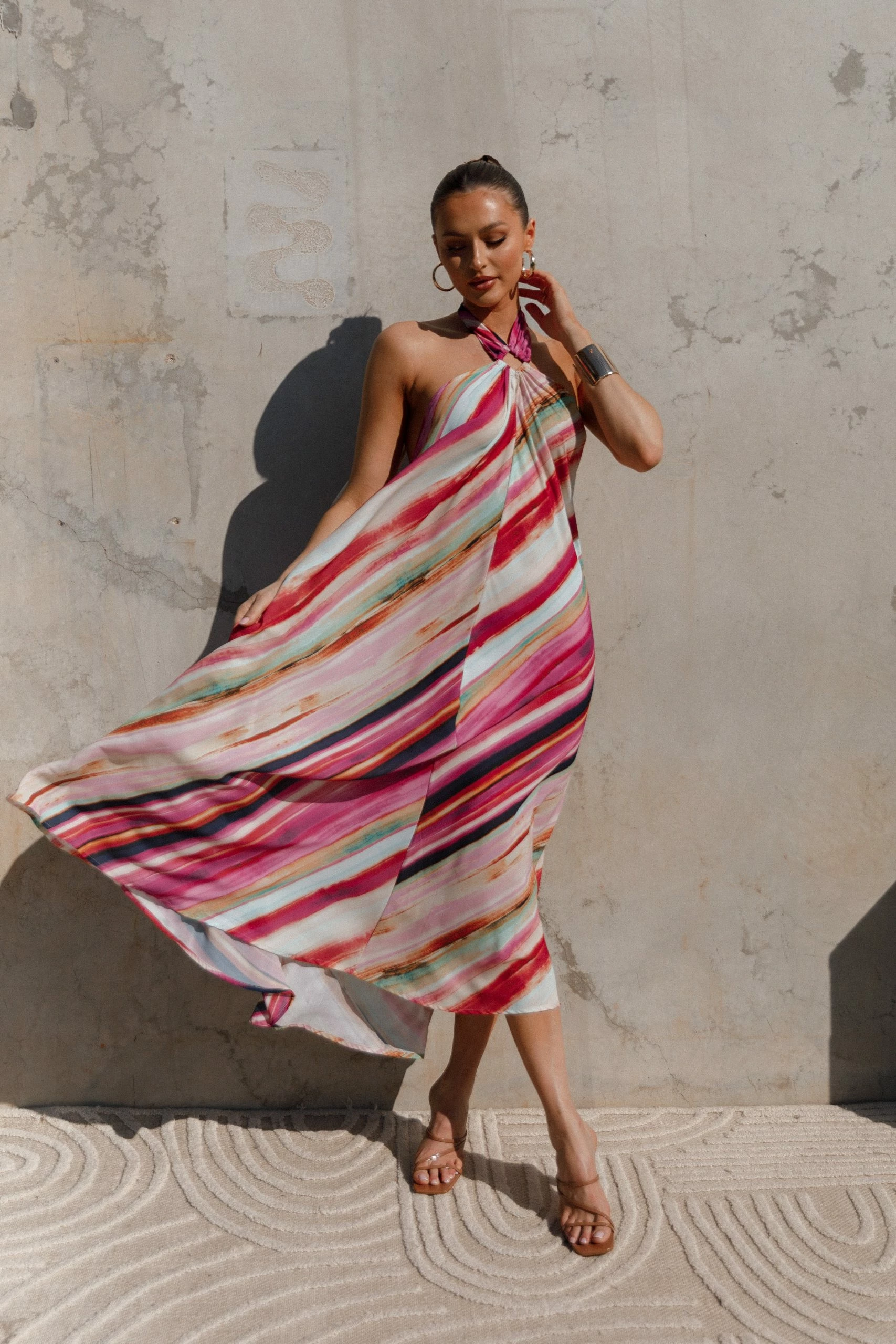 | DETAILS Make a statement in our chic and stylish Maxi Dress. Featuring a halter neckline with tie close detail and ring detail on the neckline, this backless style is sure to turn heads.