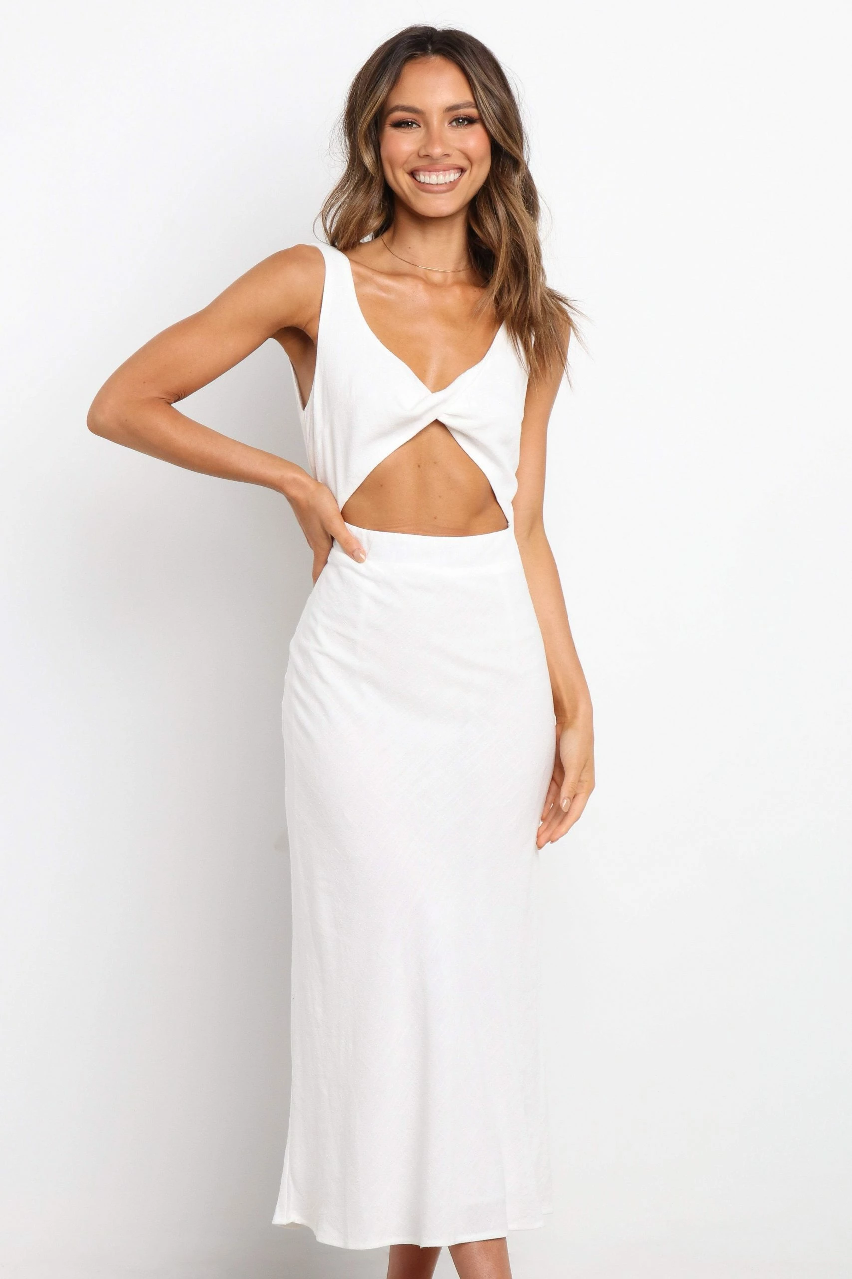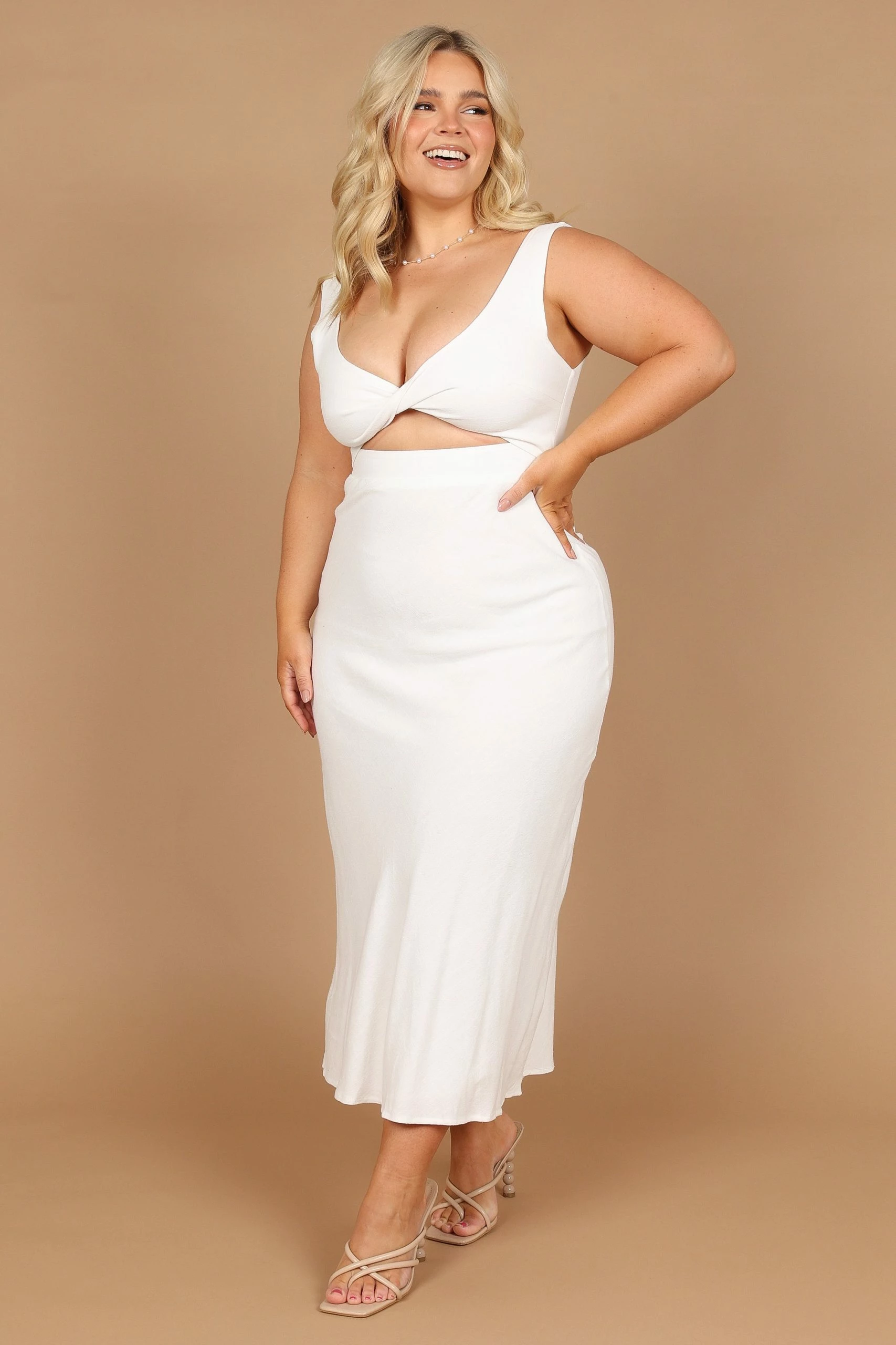 | DETAILS Take your style to new heights in this chic midi length dress! The flattering v neckline creates a timeless silhouette while the bust twist detail with cut out feature adds a touch of glamor. For an extra bit of security, the dress is finished off with a hook and eye clasp and invisible back zip.