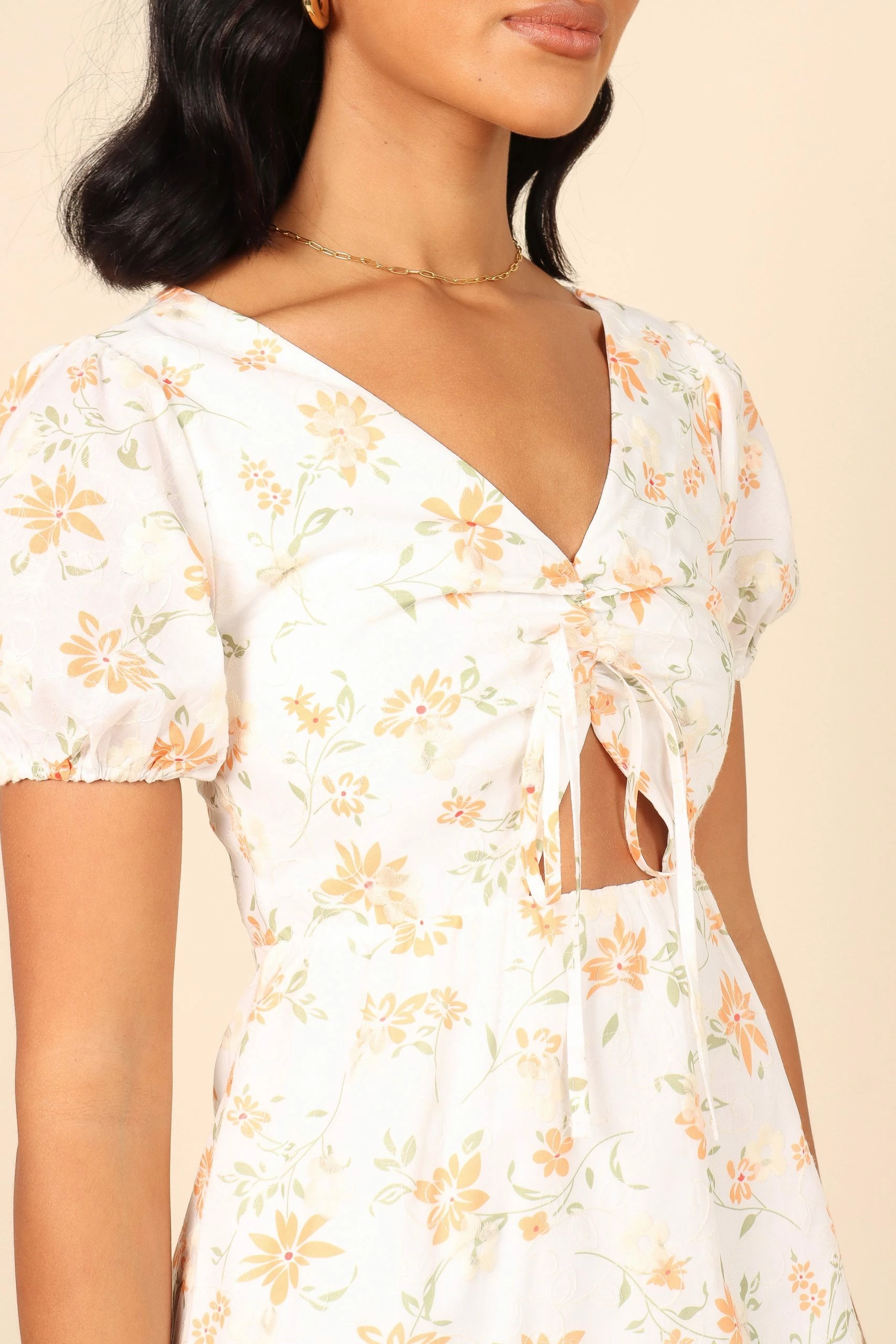 | DETAILS Are you ready to take on the summer in style? Our mini dress with a v neckline, short sleeves with elasticised cuffs and bust tie detail is sure to have heads turning. The front cut out feature is both flirty and fun while the back shirred panel ensures that this mini dress fits like a dream.