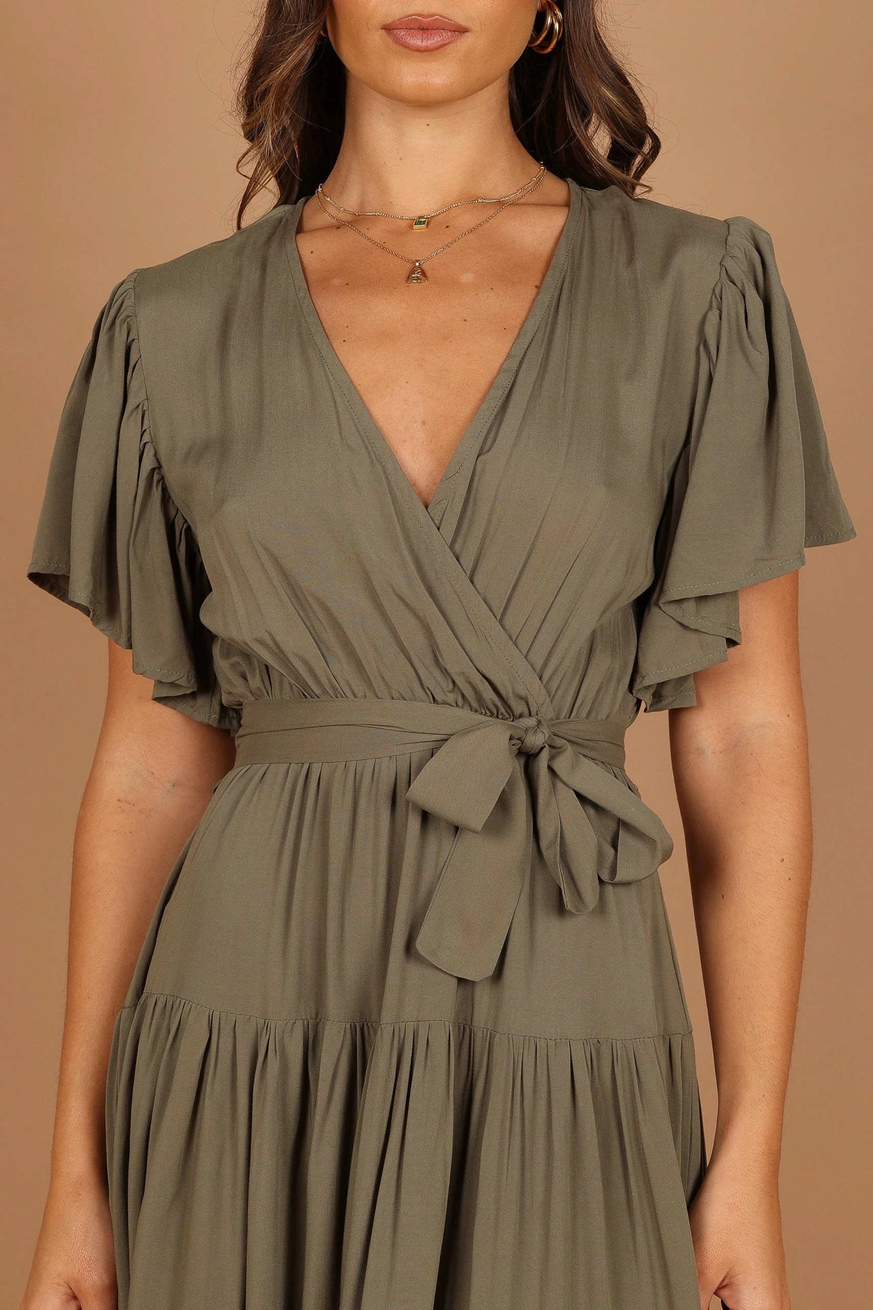 | DETAILS The Barker Dress is the perfect outfit for events and everyday, in a stunning midi length with a v-neckline, ruffle sleeves, and a waist tie detailing. Dress it up with heels or go more casual with sandals. The Barker Dress is the ultimate choice for work, party outfits or Sunday errands.