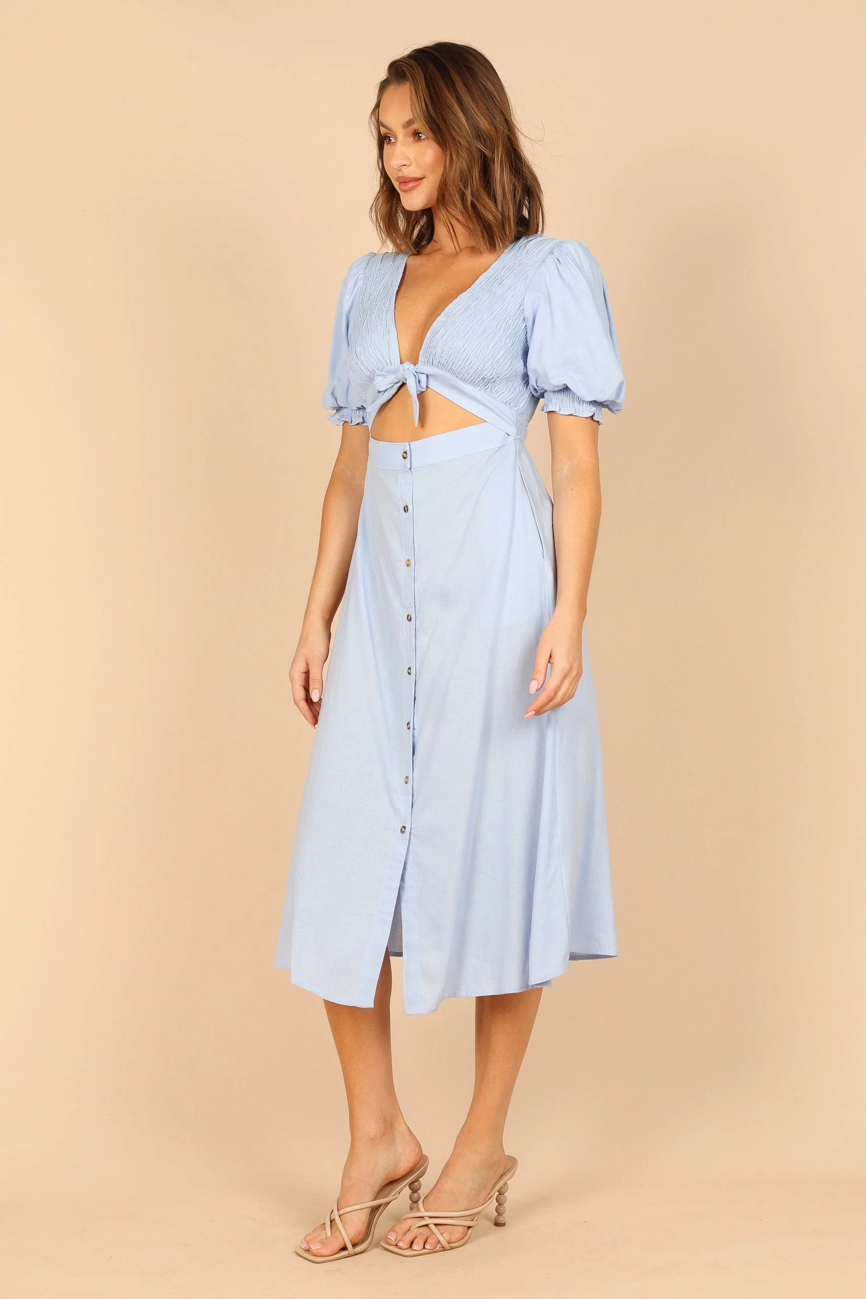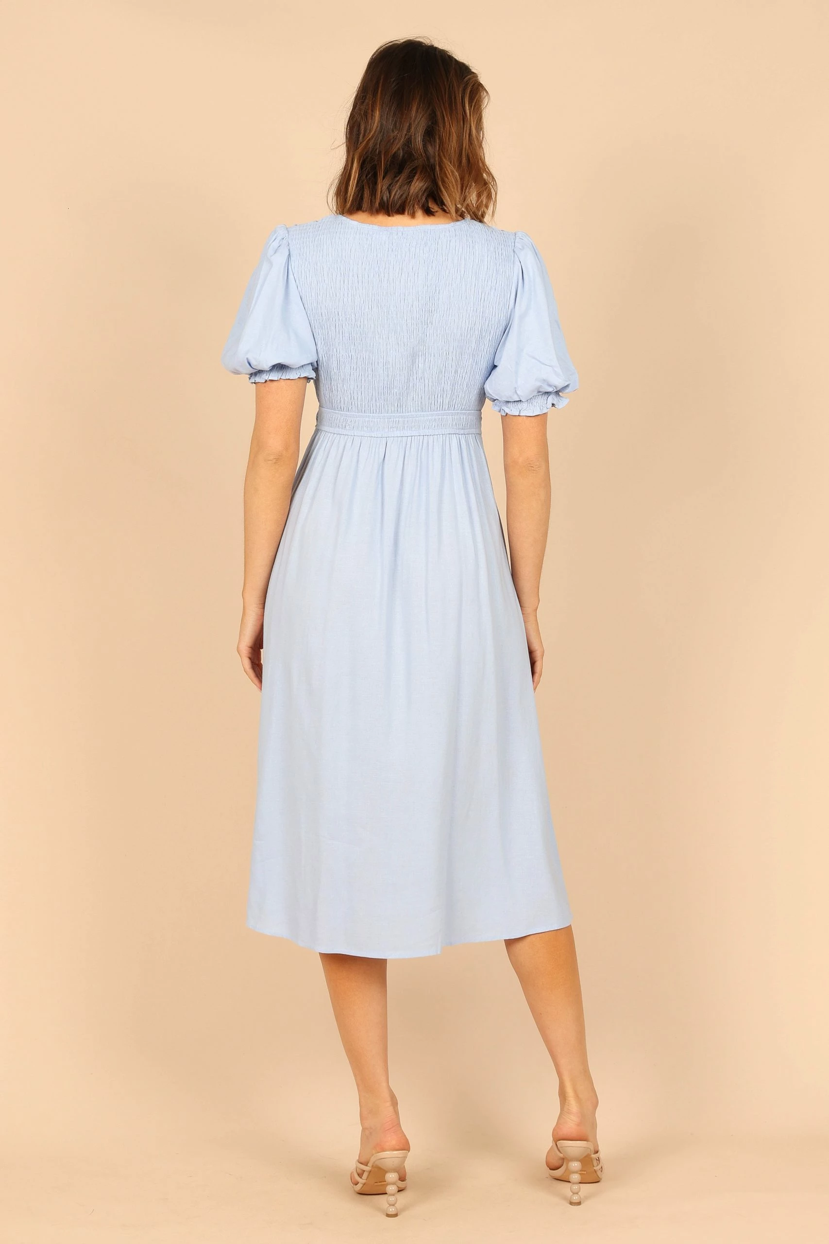 | DETAILS This midi length dress is the perfect choice for any occasion! With its v-neckline tied close and short sleeves with elasticized cuffs, you’ll look super chic and stylish.