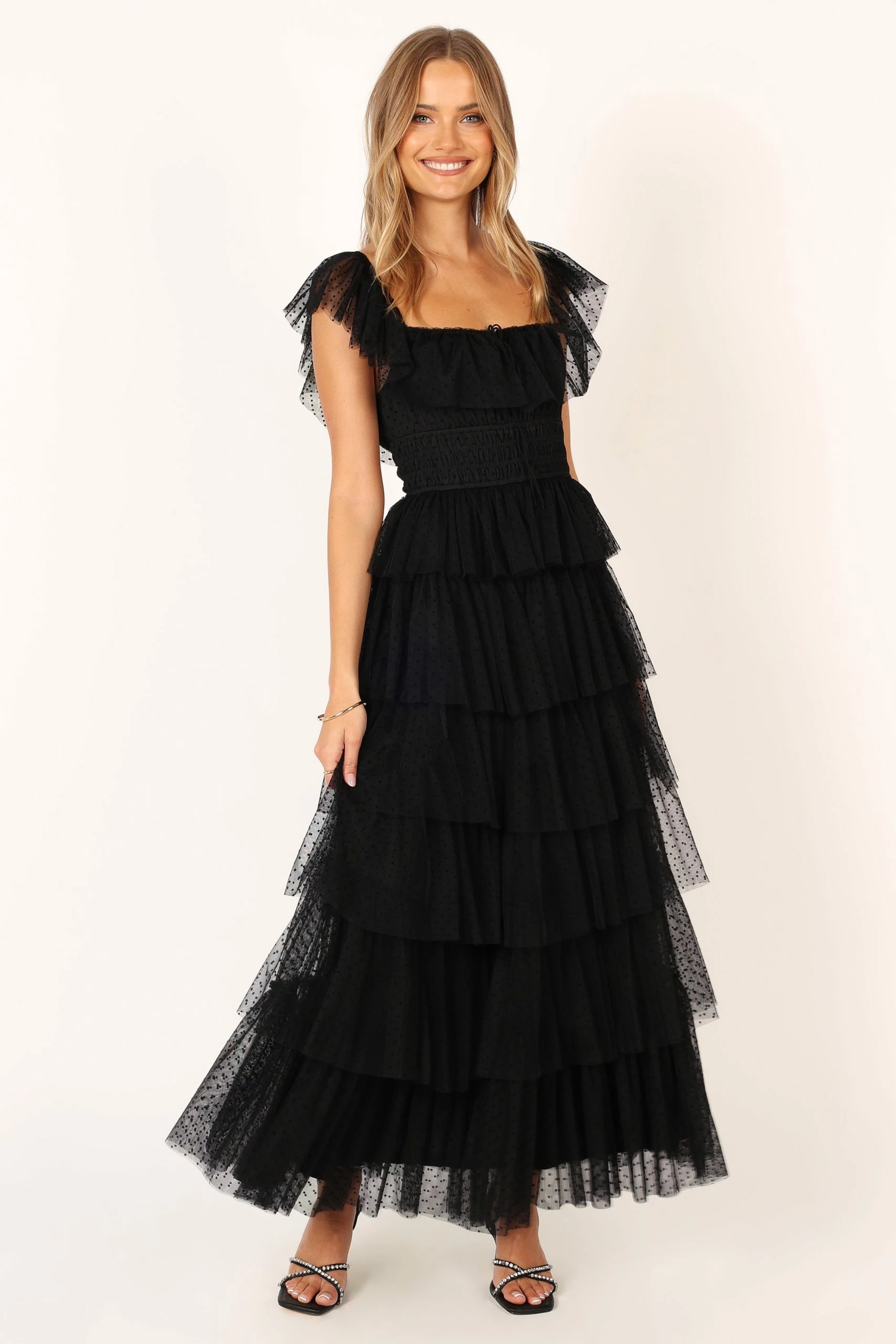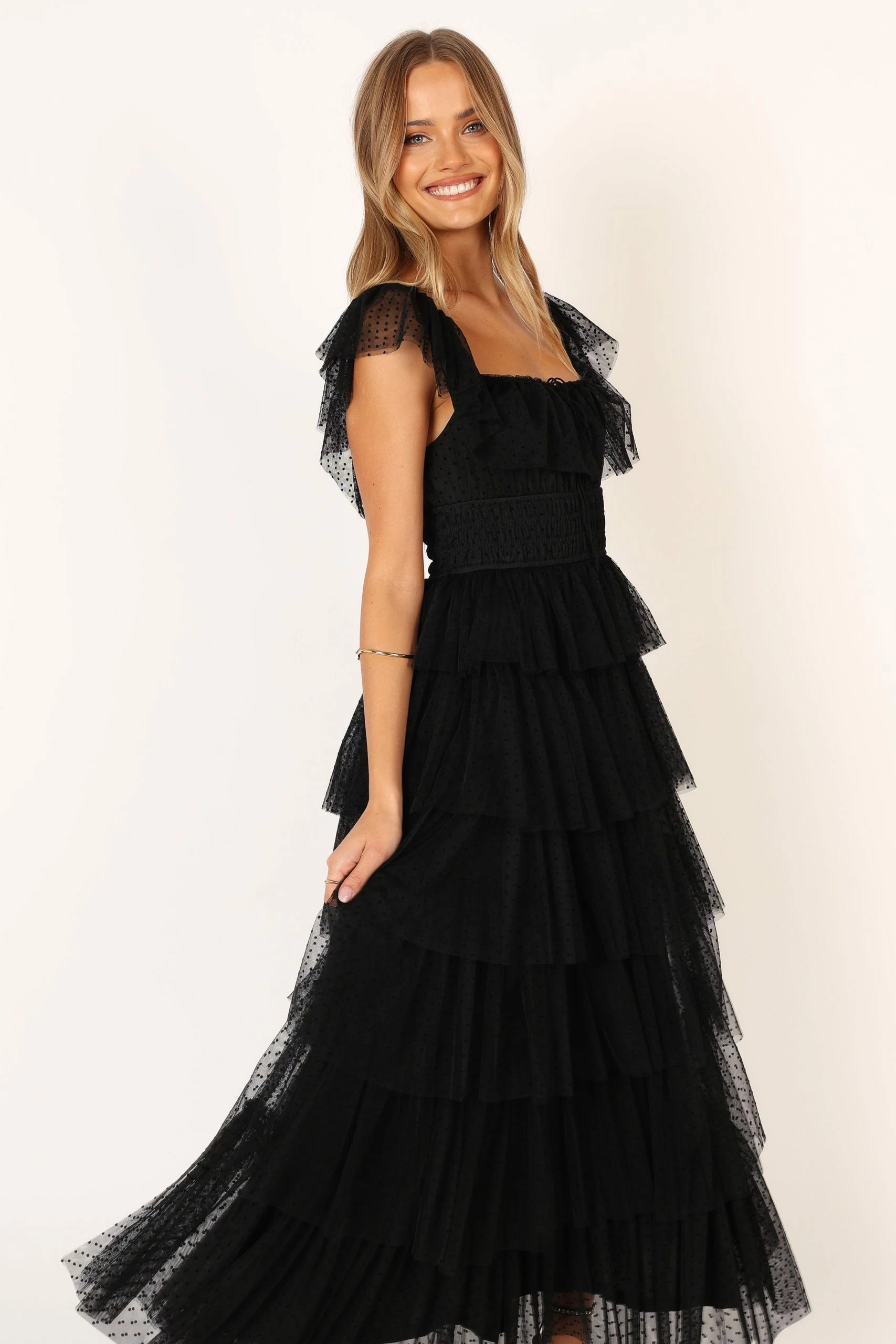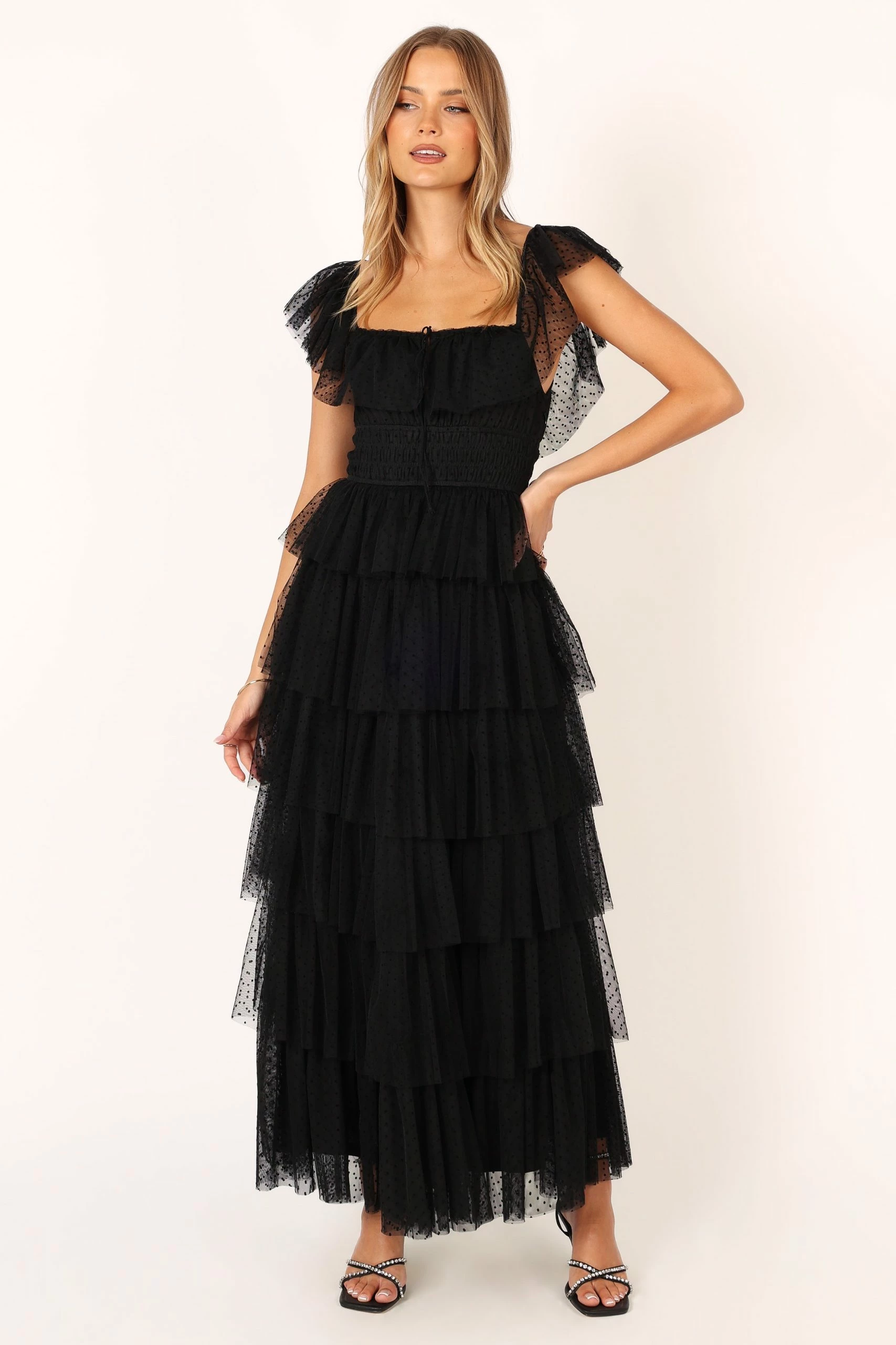 | DETAILS Be the belle of the ball in this stunning tulle maxi dress! Featuring a square neckline with tie close, thin elasticised straps with ruffle detail and a front cut out on the bust, this dress is sure to turn heads.
