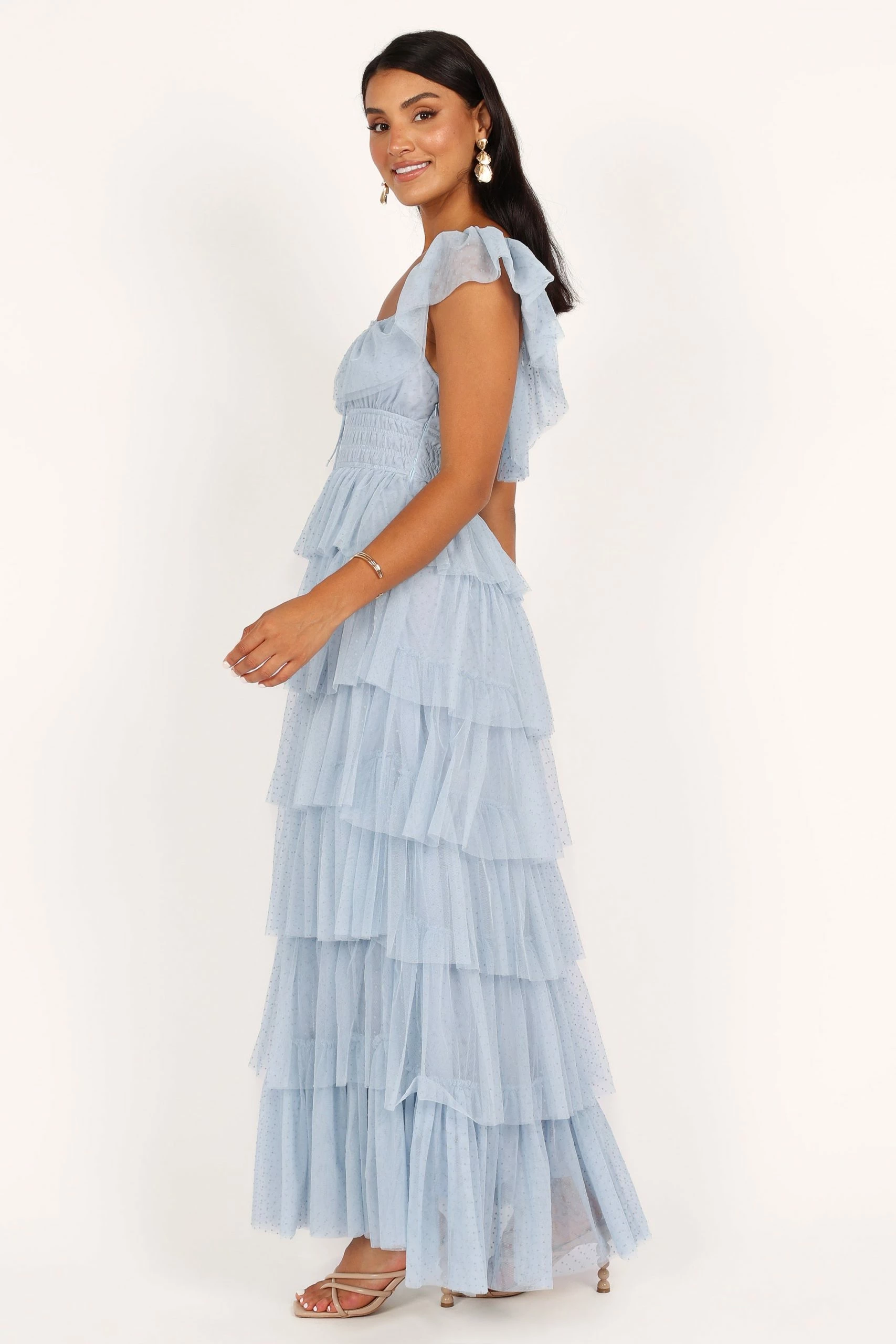 | DETAILS Be the belle of the ball in this stunning tulle maxi dress! Featuring a square neckline with tie close, thin elasticised straps with ruffle detail and a front cut out on the bust, this dress is sure to turn heads.