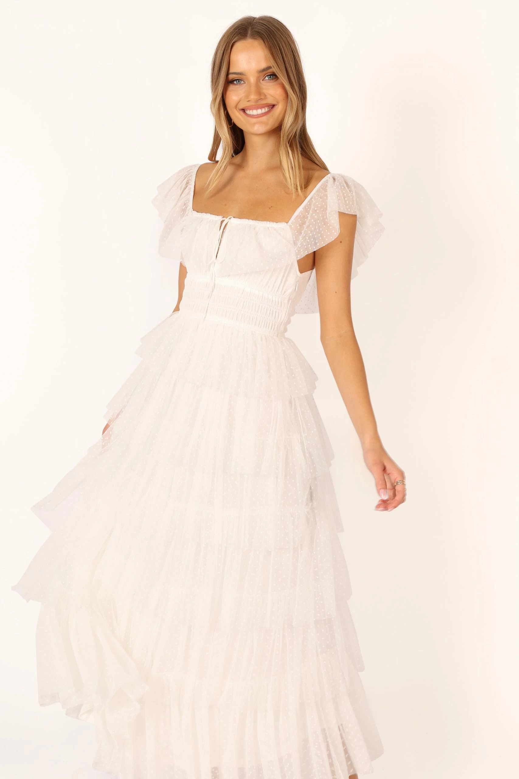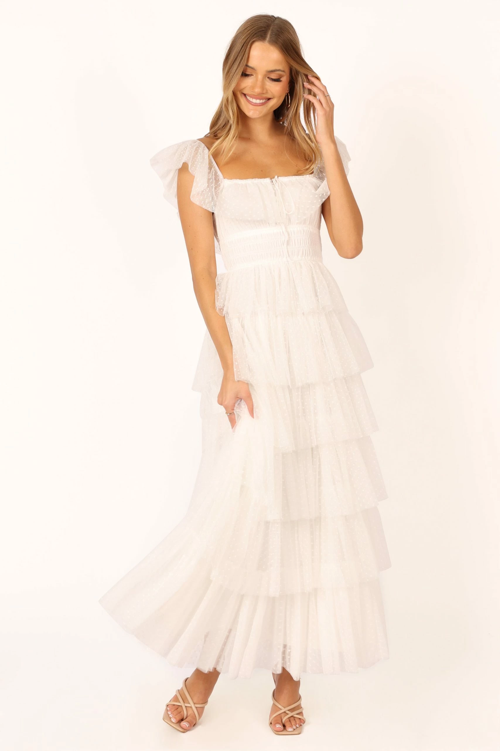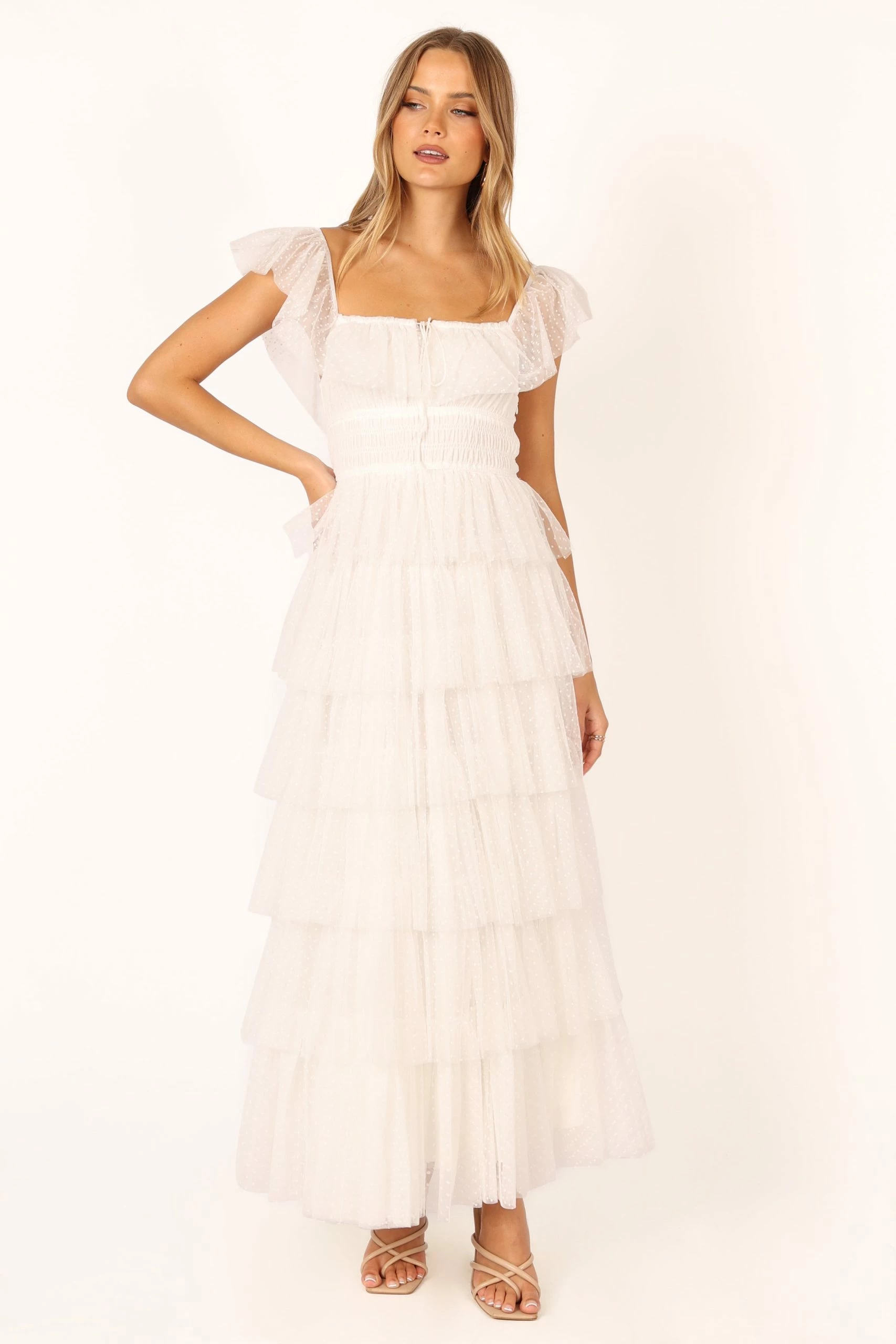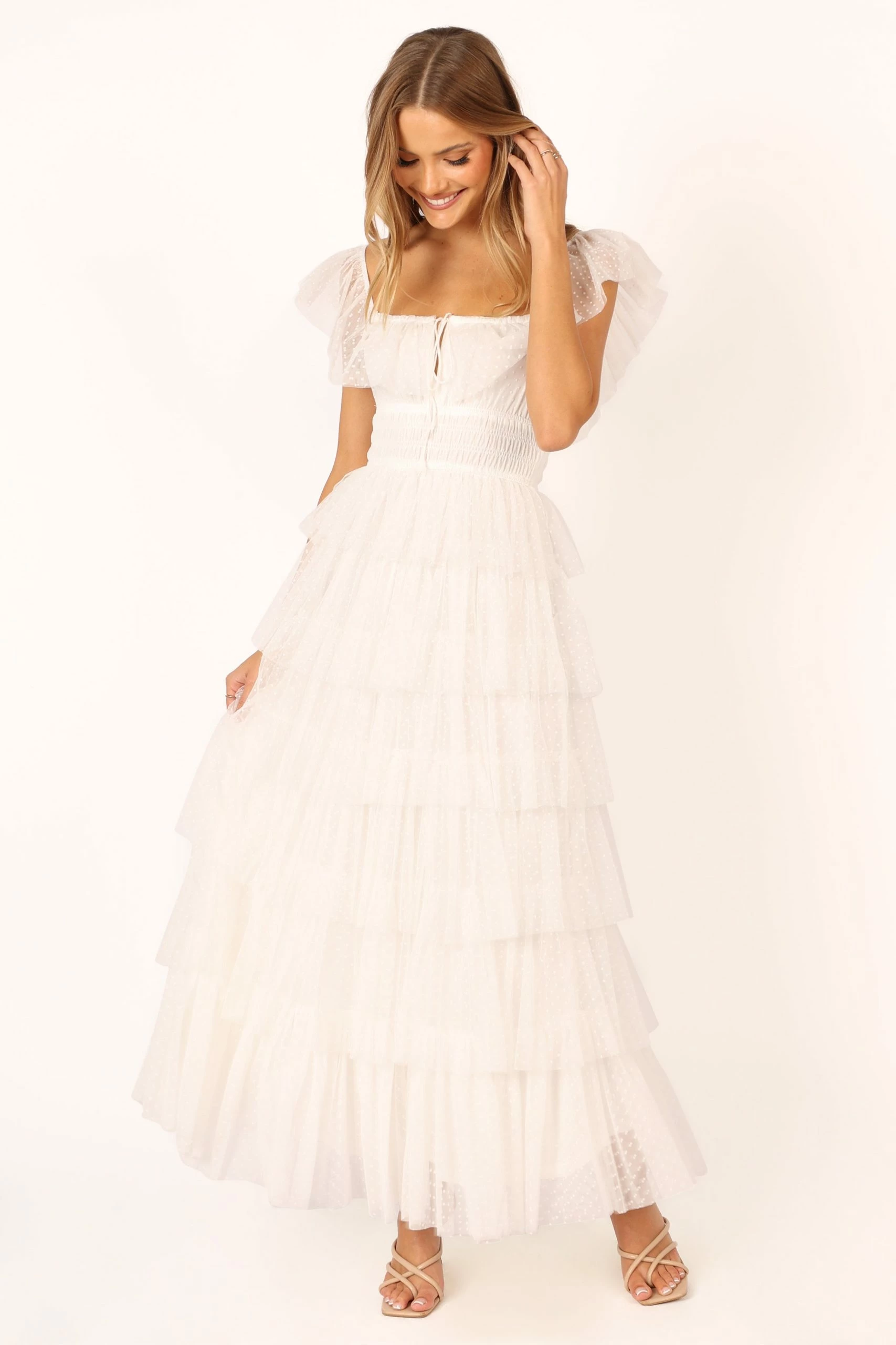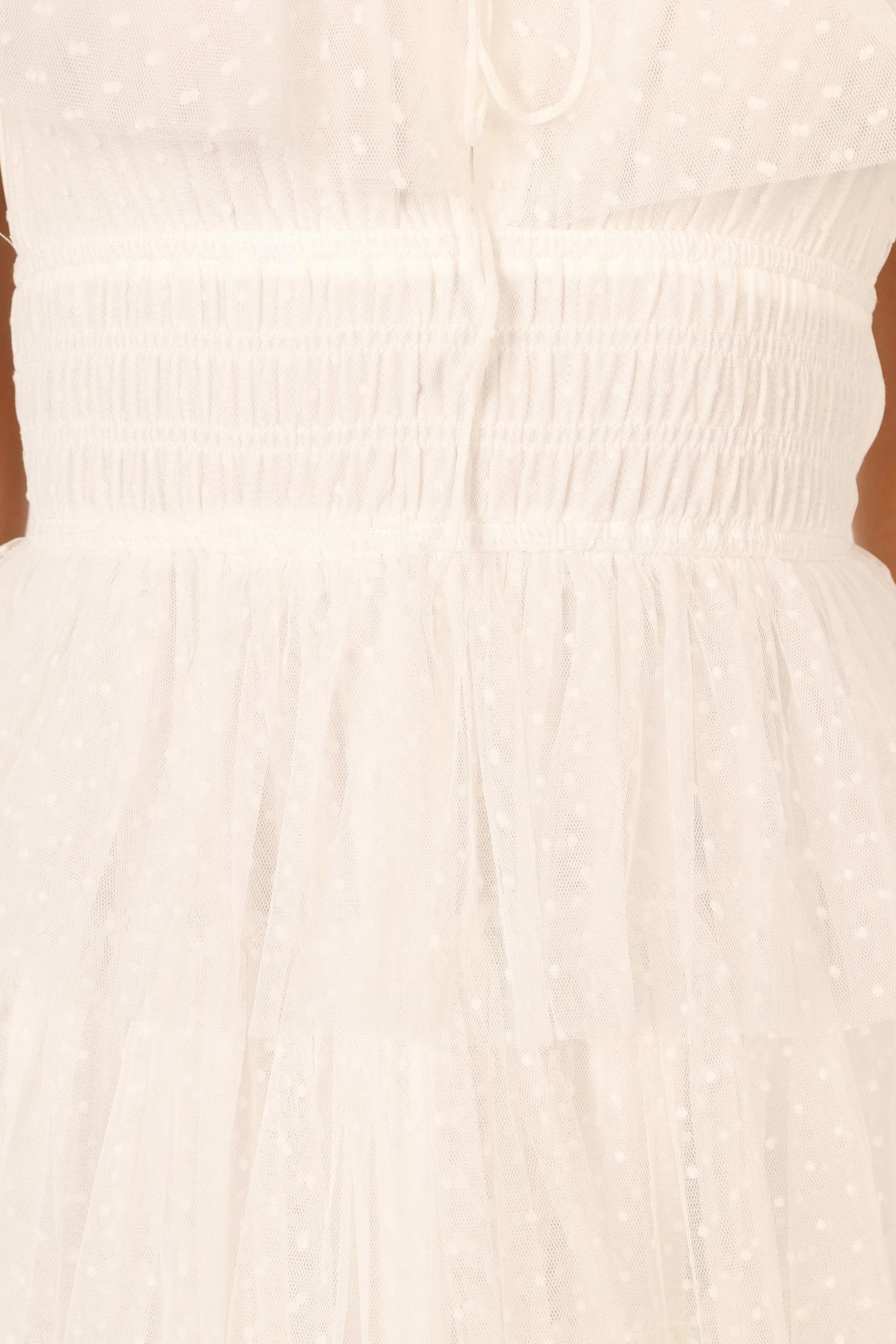 | DETAILS Be the belle of the ball in this stunning tulle maxi dress! Featuring a square neckline with tie close, thin elasticised straps with ruffle detail and a front cut out on the bust, this dress is sure to turn heads.