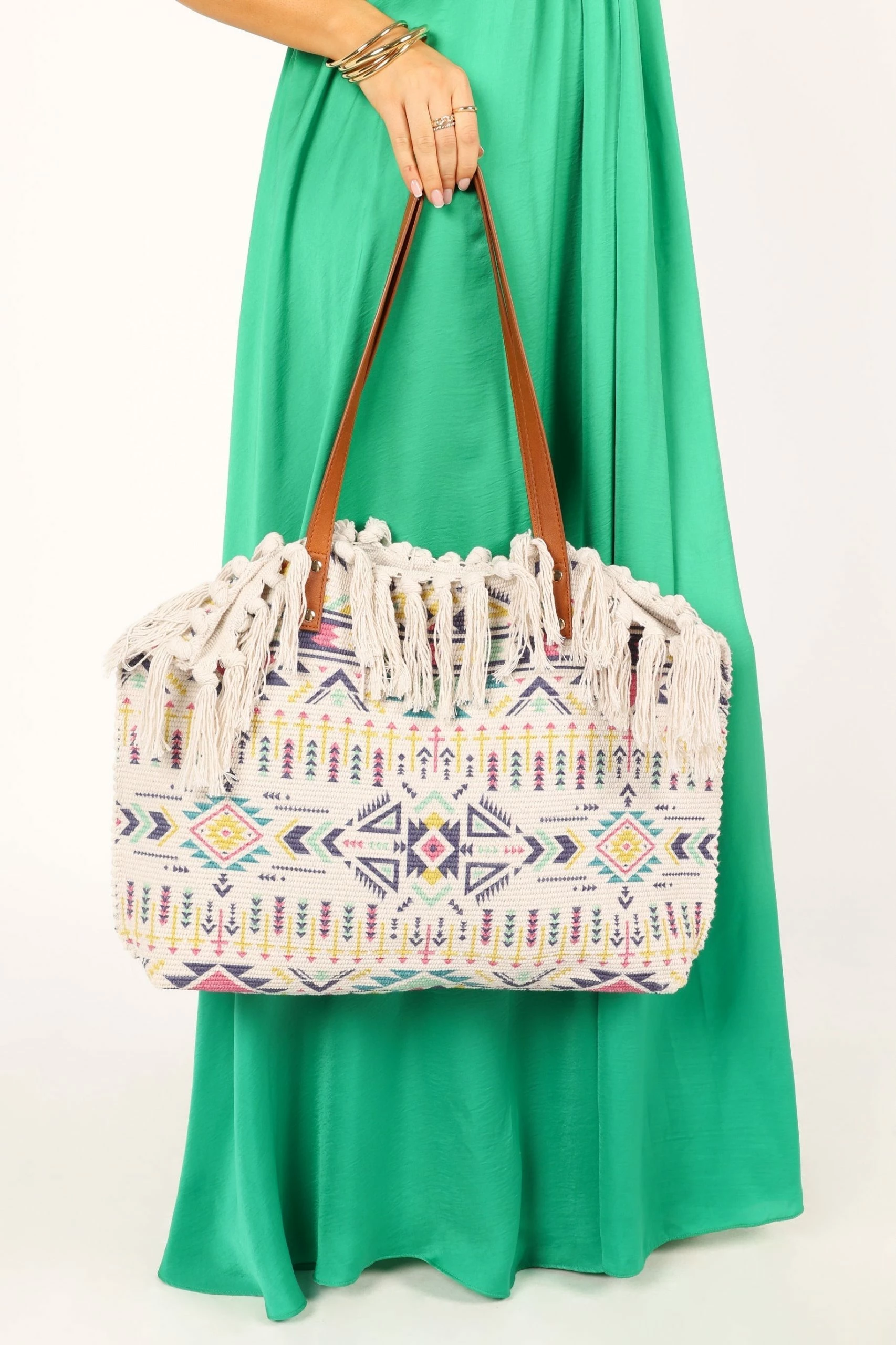| DETAILS This beautiful woven printed design bag is perfect for the beach! With its twin leather look handles and open top with a button close, you can easily carry your essentials in style. To add a little bit of extra flair, this bag also comes with top tassel detailing that completes the look.