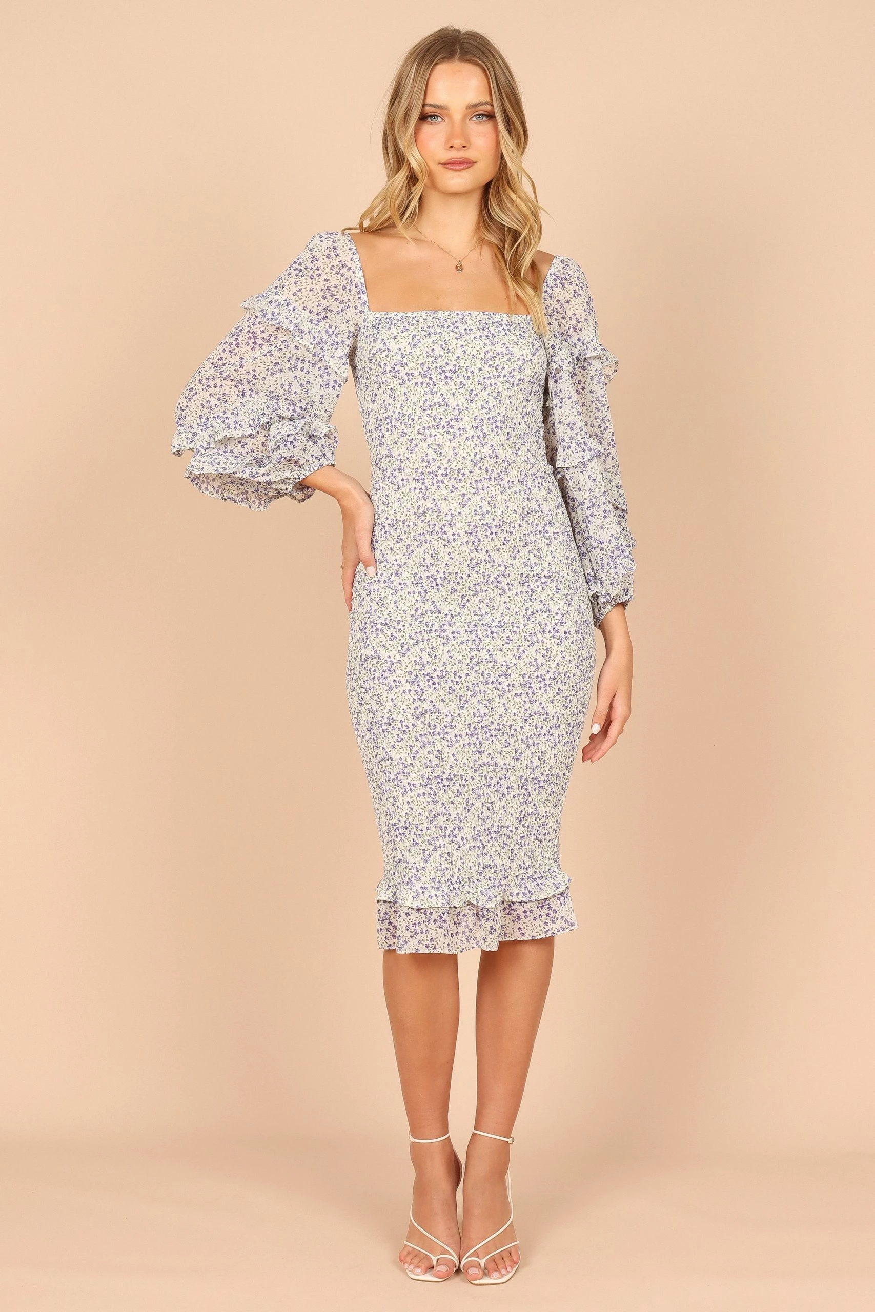 | DETAILS Ladies, if you’re looking for the perfect piece to add a little something special to your wardrobe, this gorgeous midi dress is an absolute must-have. With its sweet square neckline and lovely long sleeves featuring elasticised shoulders and cuffs with ruffle detailing, it’s sure to turn heads!
