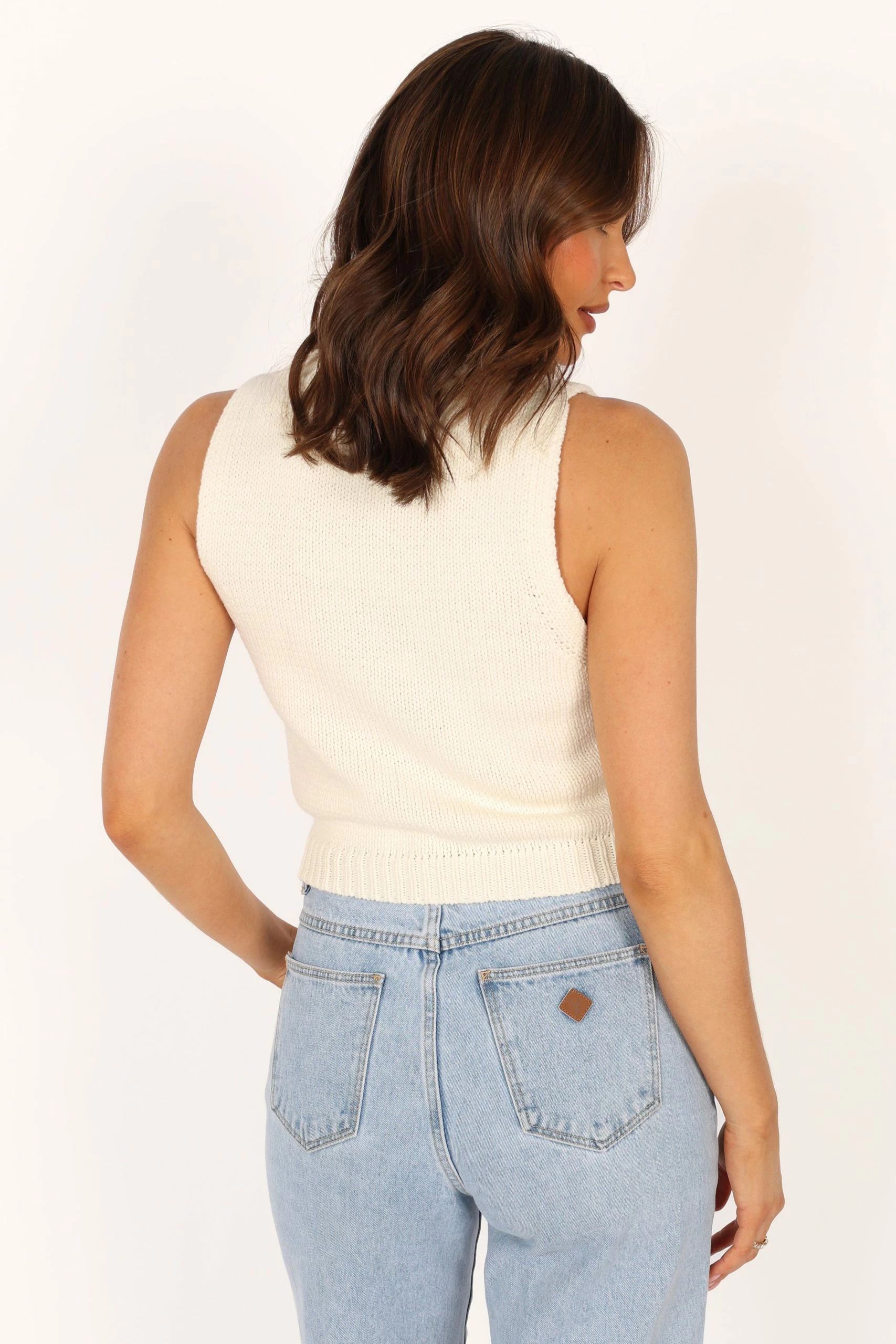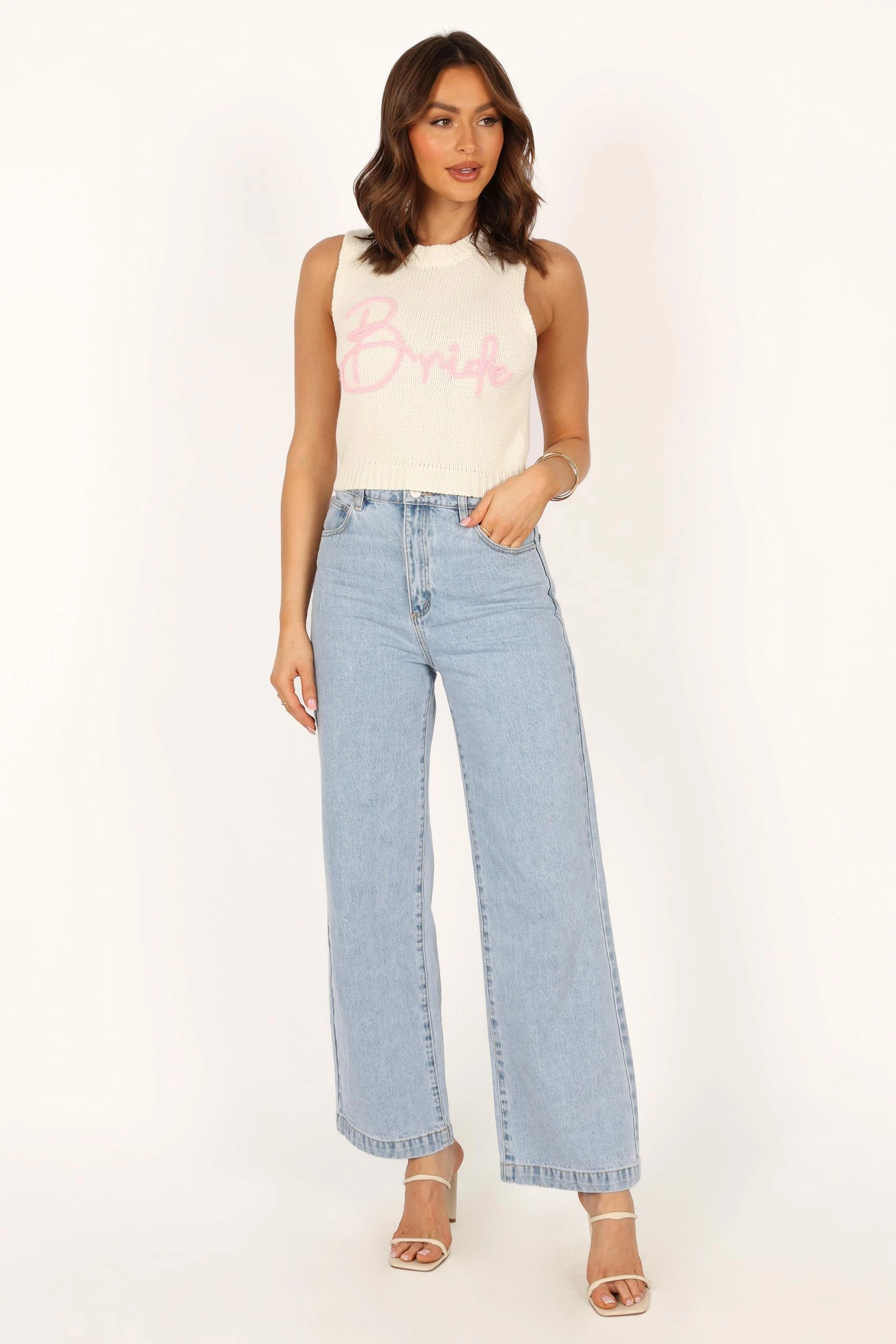 | DETAILS This white sleeveless sweater is perfect for the bride-to-be. The round neckline and ribbed hemline create a timeless silhouette, while the tinsel yarn bride feature adds a touch of sparkle to your look.