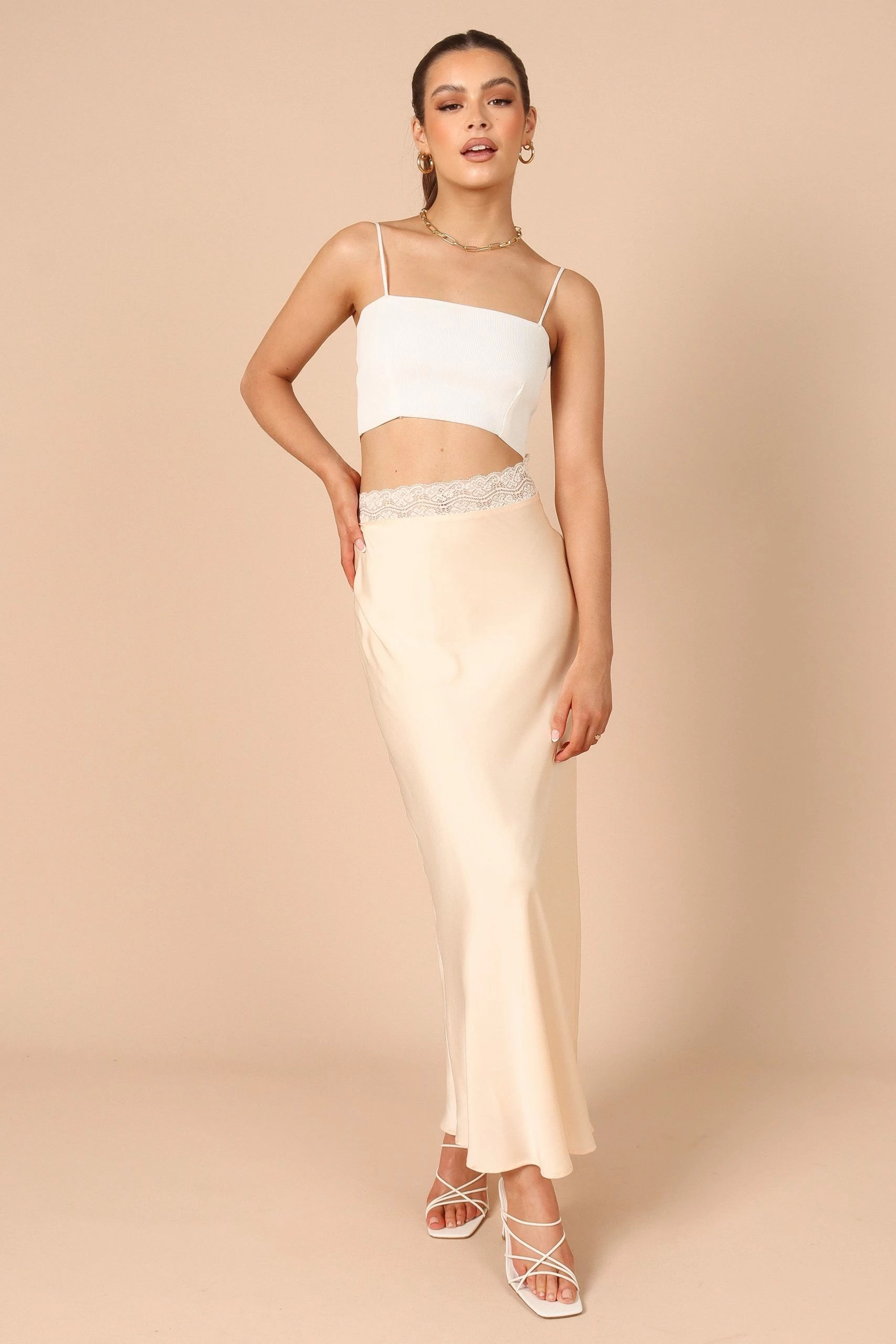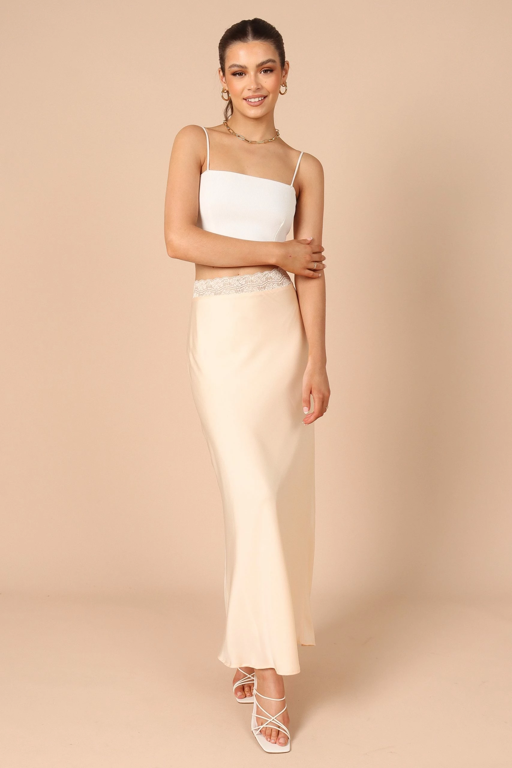 | DETAILS This maxi skirt is the perfect addition to any wardrobe! It has a high waisted fit that flatters your figure and an invisible side zip for easy on/off. The lace detail on the waistband adds a delicate touch, while the satin sheen finish gives it a stylish shine.