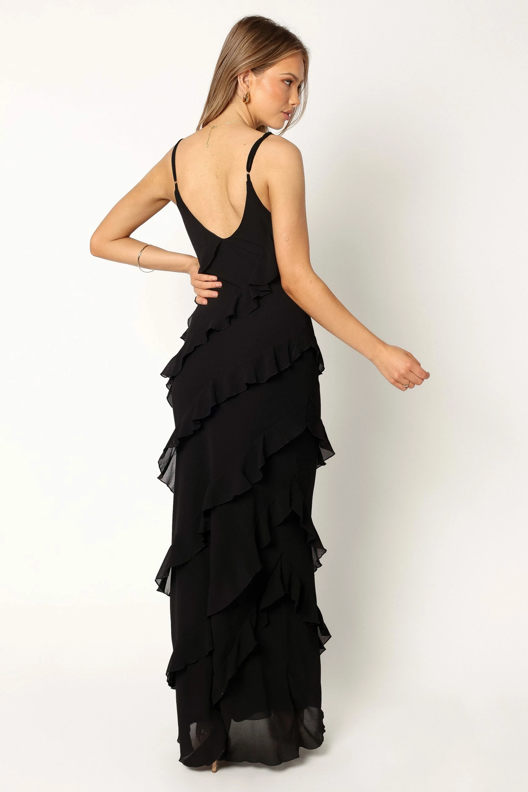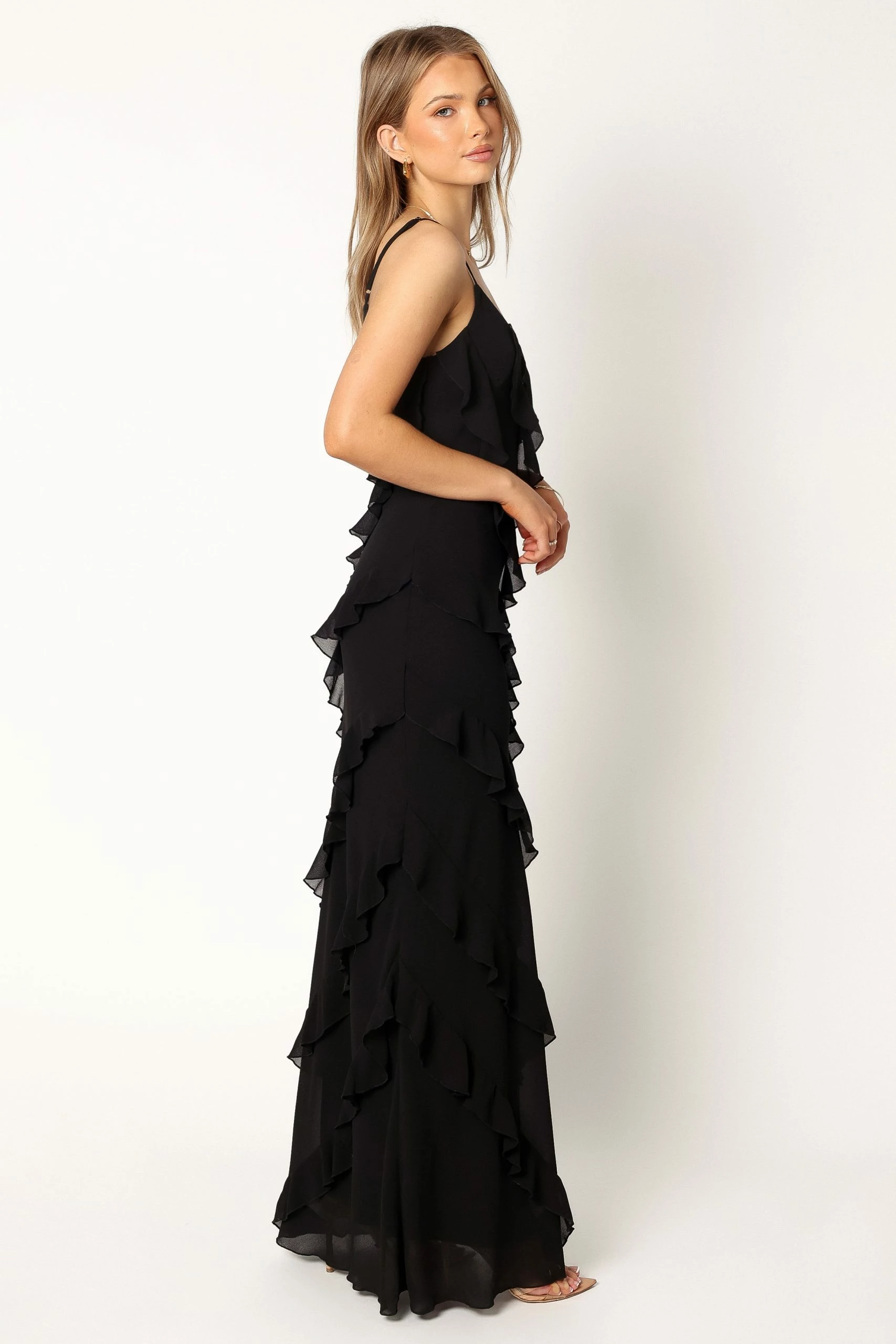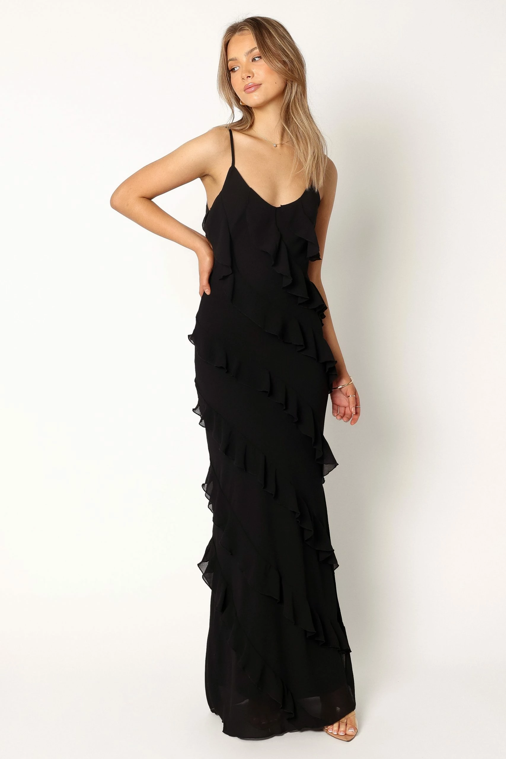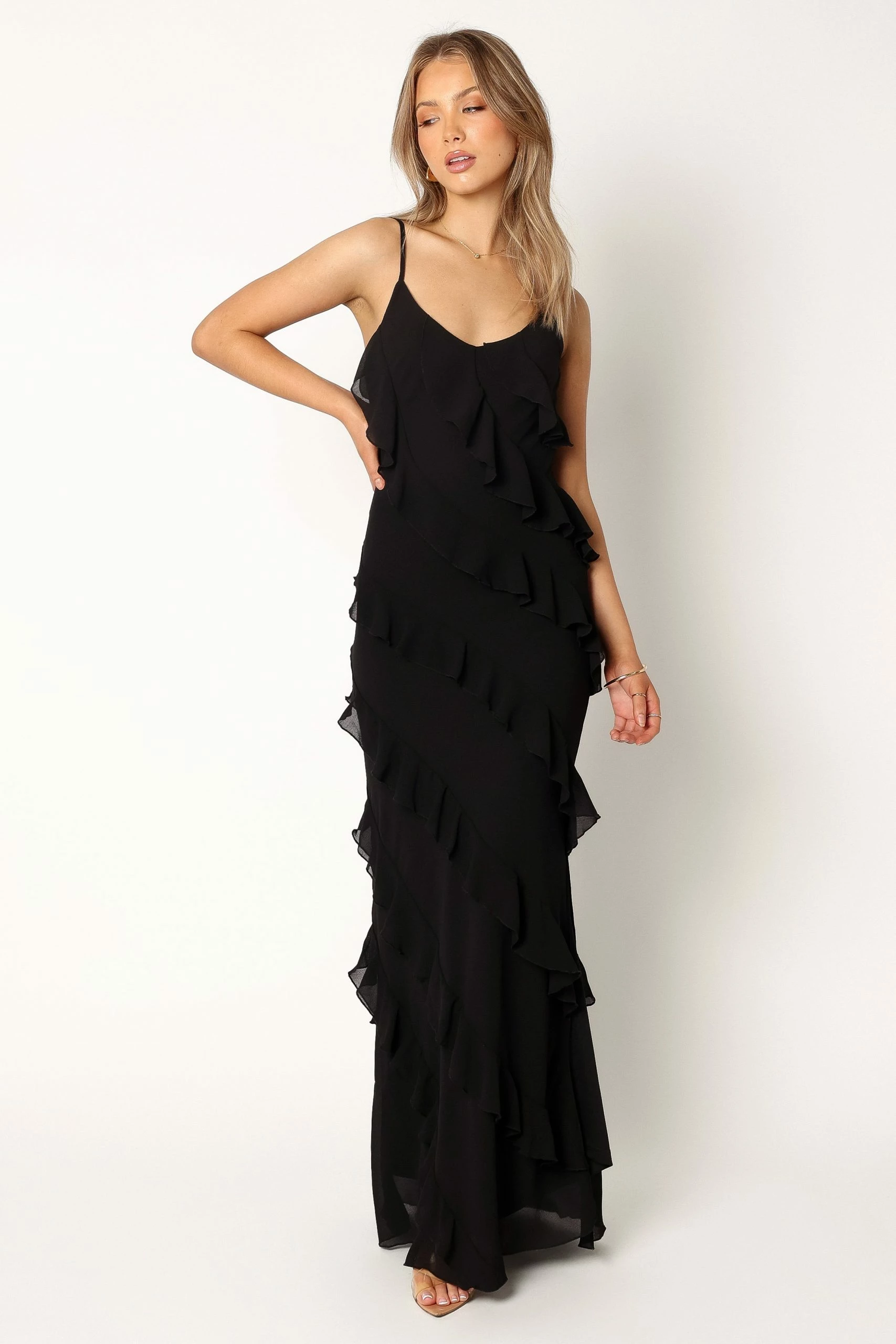 | DETAILS Are you ready to dress up for your next event? Look no further than our Ciao dress! This maxi length dress features a flattering v neckline, thin adjustable straps and an invisible side zip. The back of the dress is enhanced with a beautiful v detail. It also includes a ruffle feature which will make you stand out from the crowd.