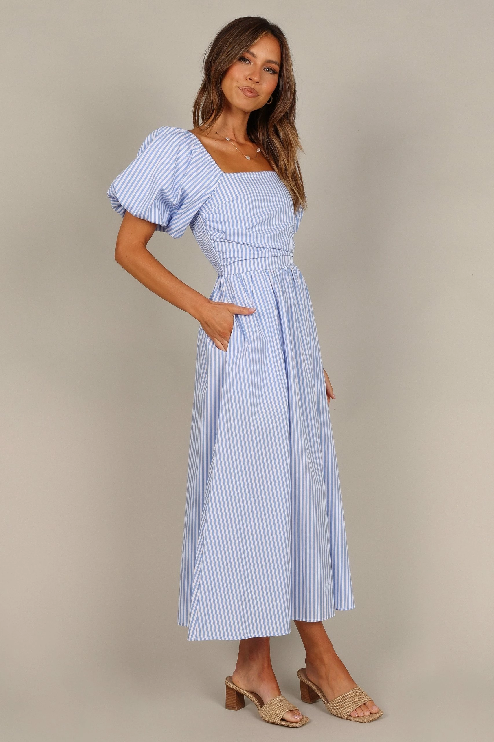 | DETAILS Welcome spring with this flirty midi dress! Featuring a square neckline and short puff sleeves with elasticised cuffs, it has an all-over blue stripe pattern that is sure to make you stand out from the crowd.