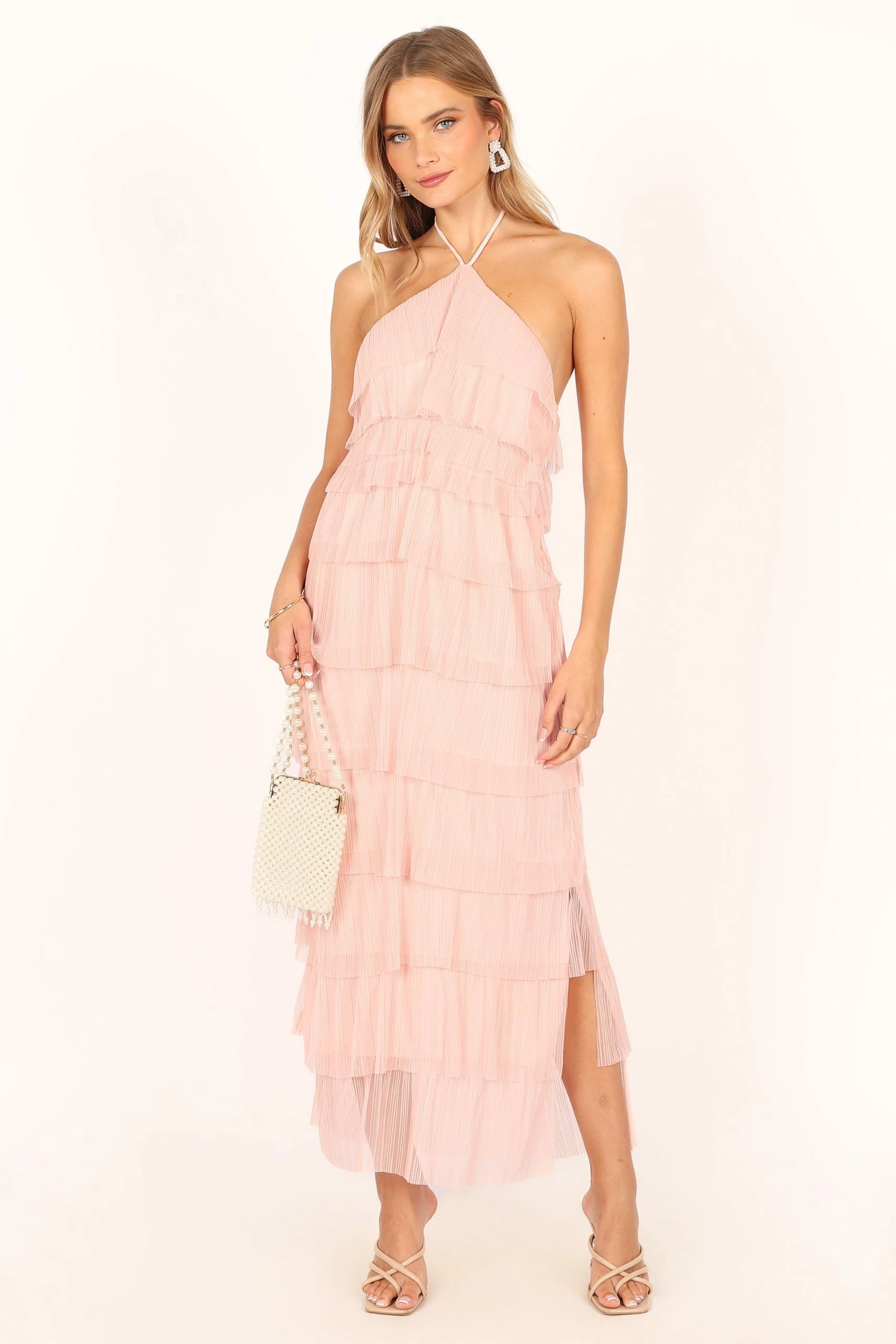 | DETAILS This pink maxi dress is the perfect pick for a special event. With its halter neckline and tie close, it’s both stylish and comfortable. The invisible side zip with hook and eye clasp allows you to get in and out easily, while the side split creates movement as you walk.