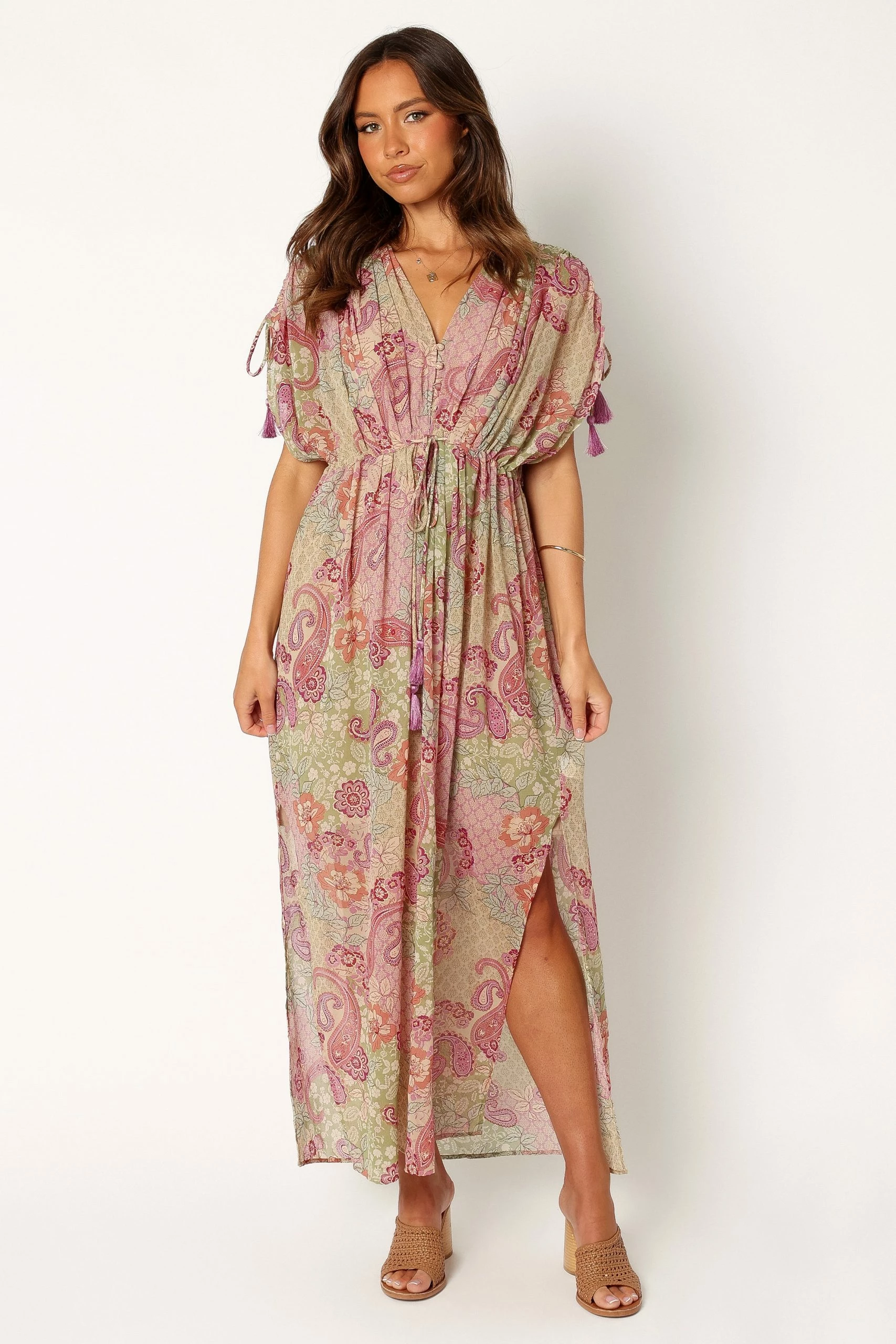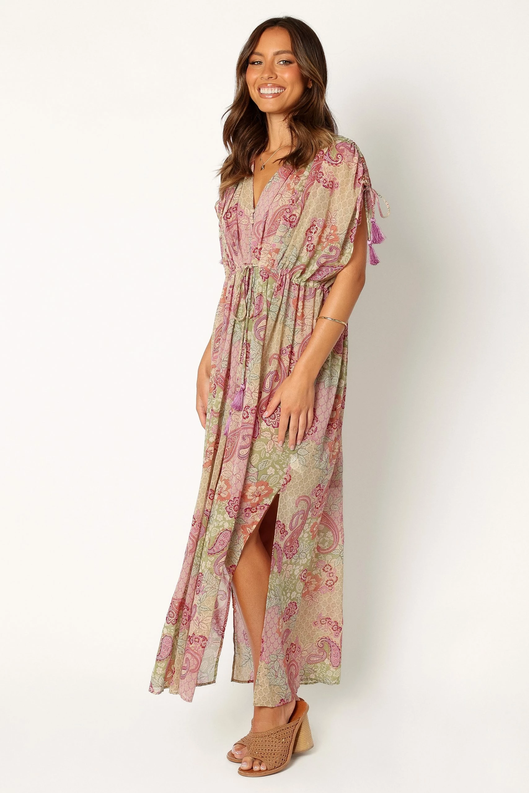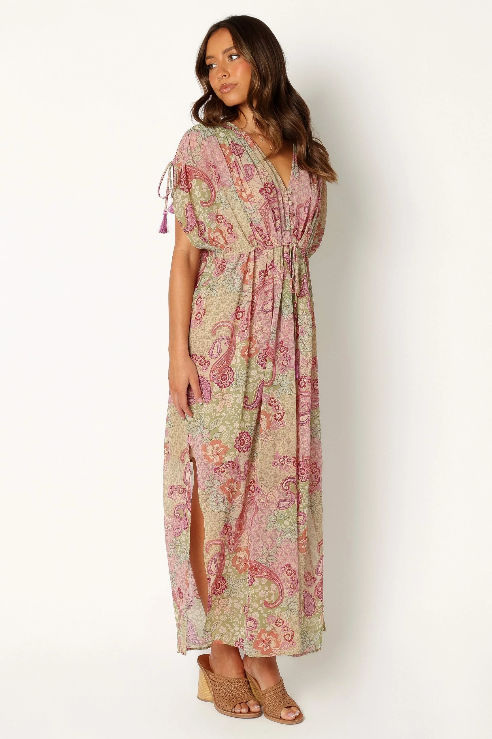 | DETAILS Are you looking for the perfect dress to wear all spring? We’ve got just the ticket: this stunning maxi dress with a v-neckline and short sleeves featuring drawstrings.