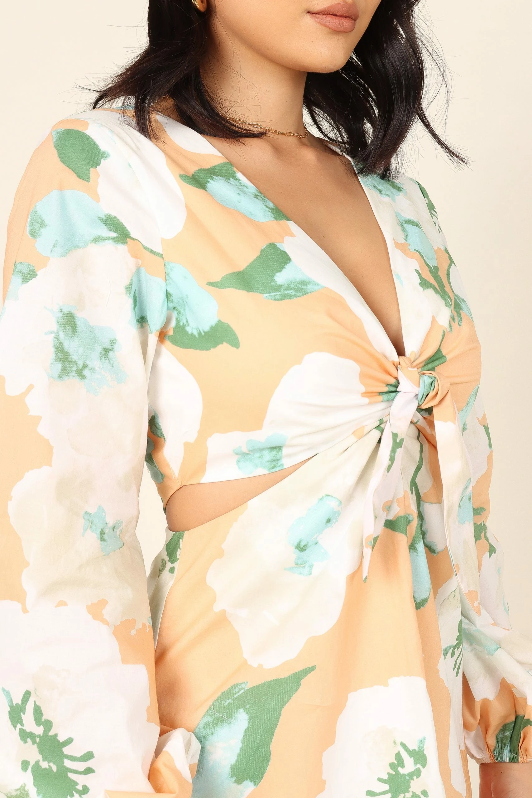 • v neckline with front tie feature