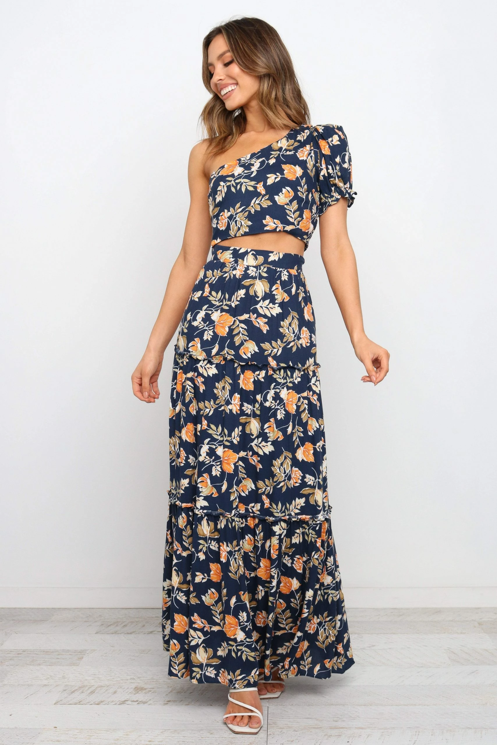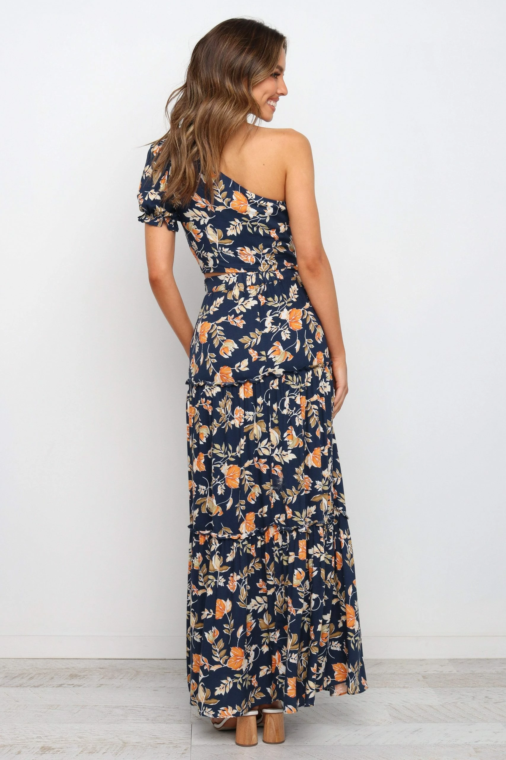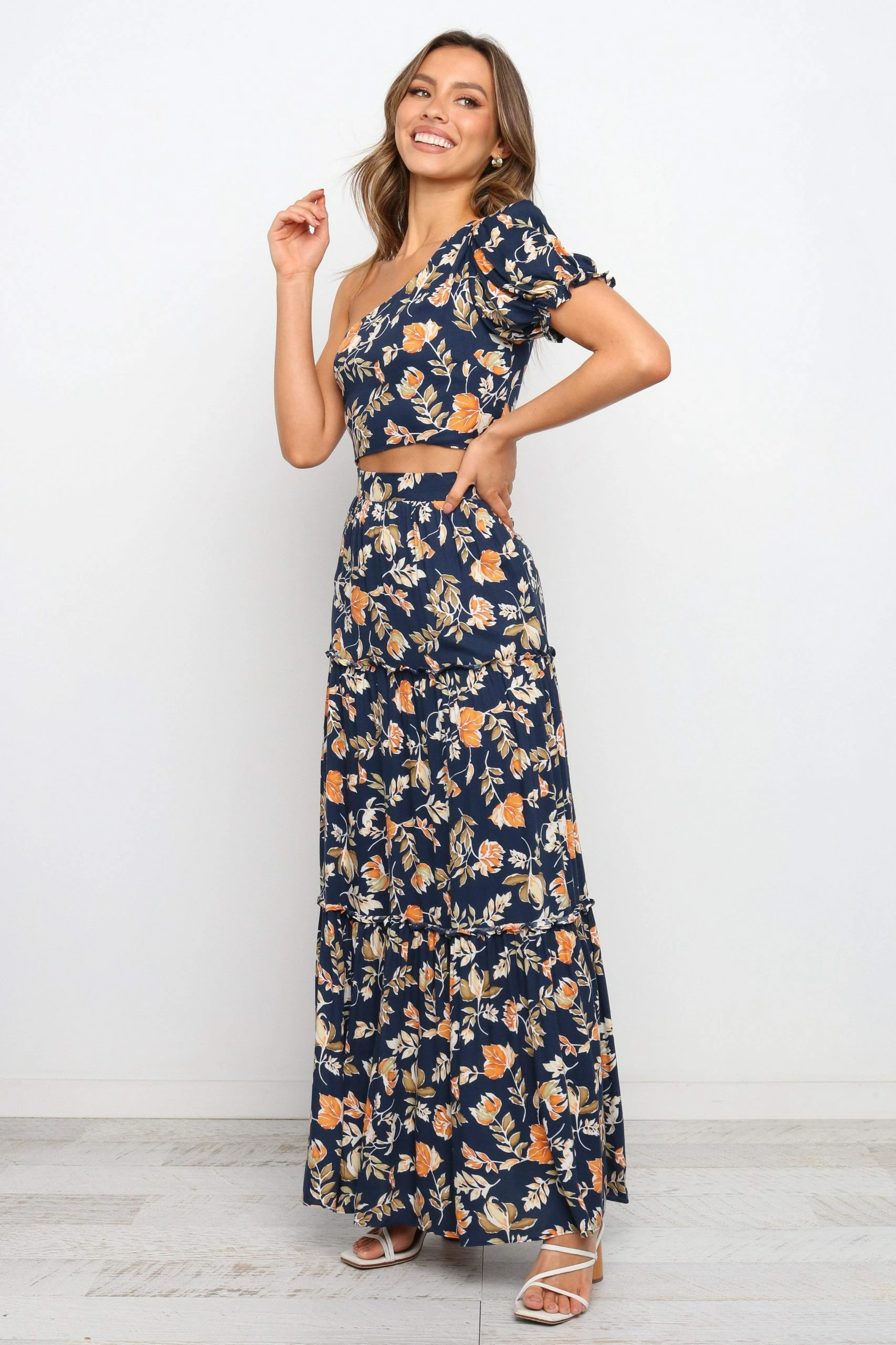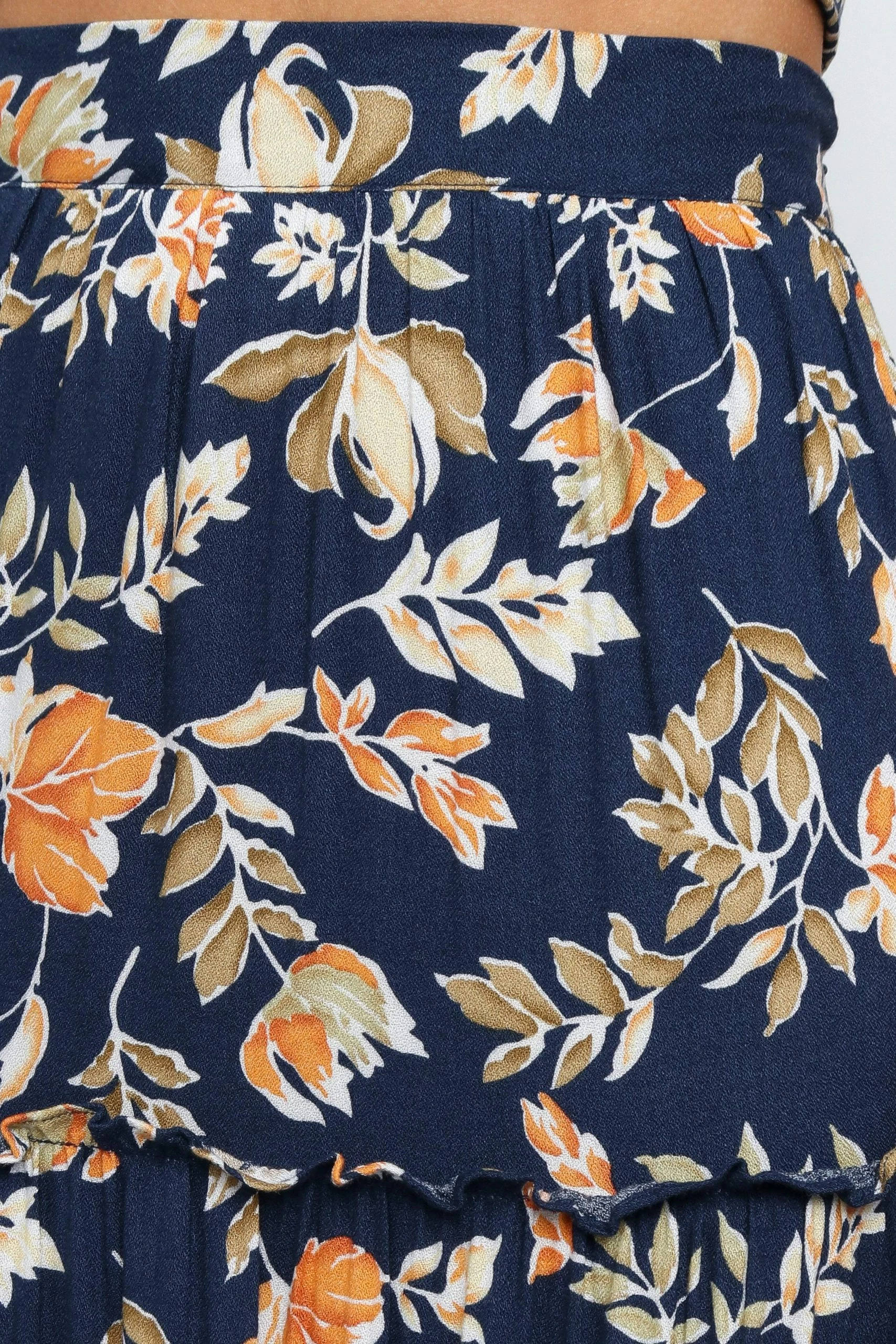 | DETAILS If you’re looking for a feminine statement piece, look no further than the classic maxi length skirt. With its flattering high waisted fit, elasticised waist at back and ruffle detailing, it’s sure to turn heads!
