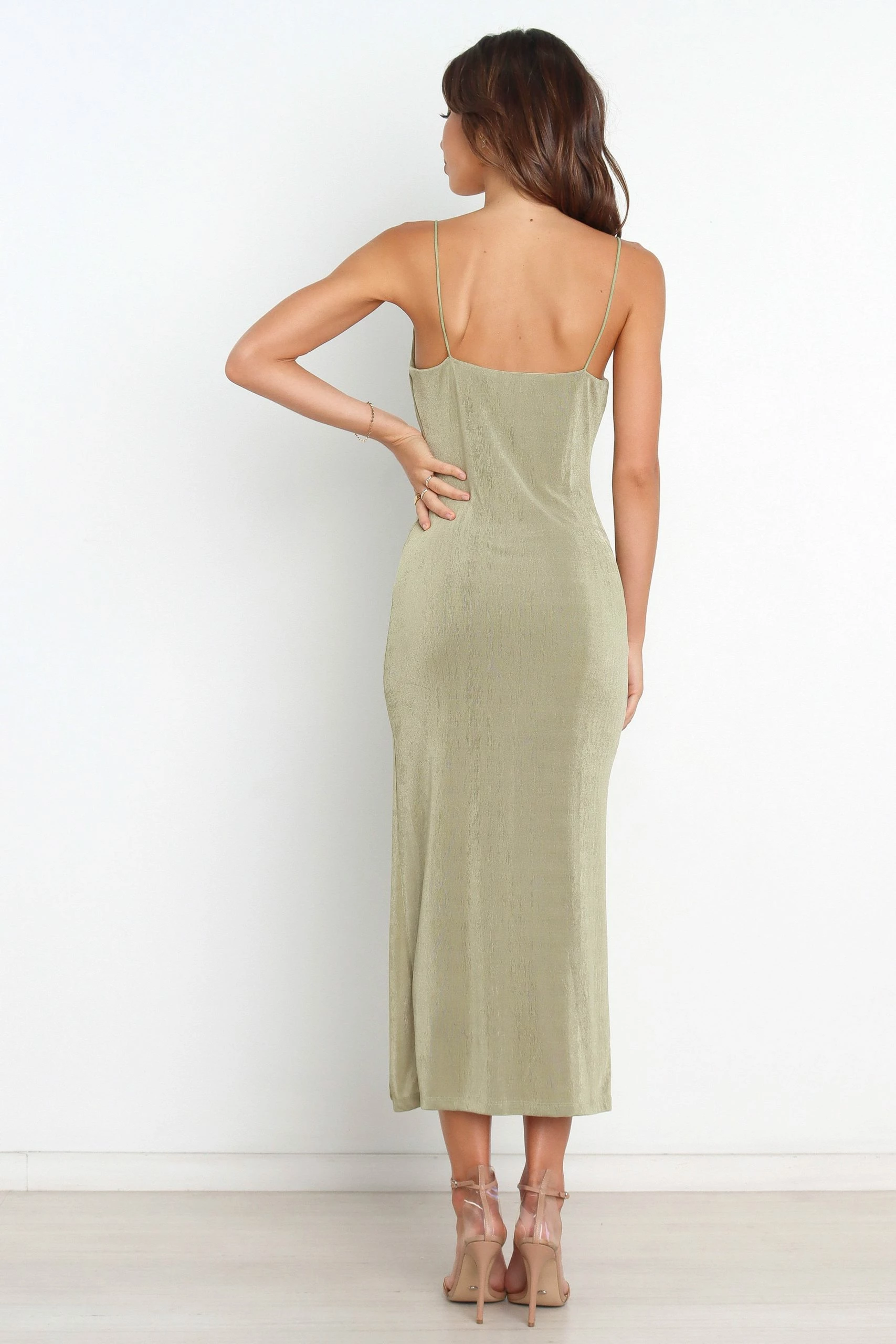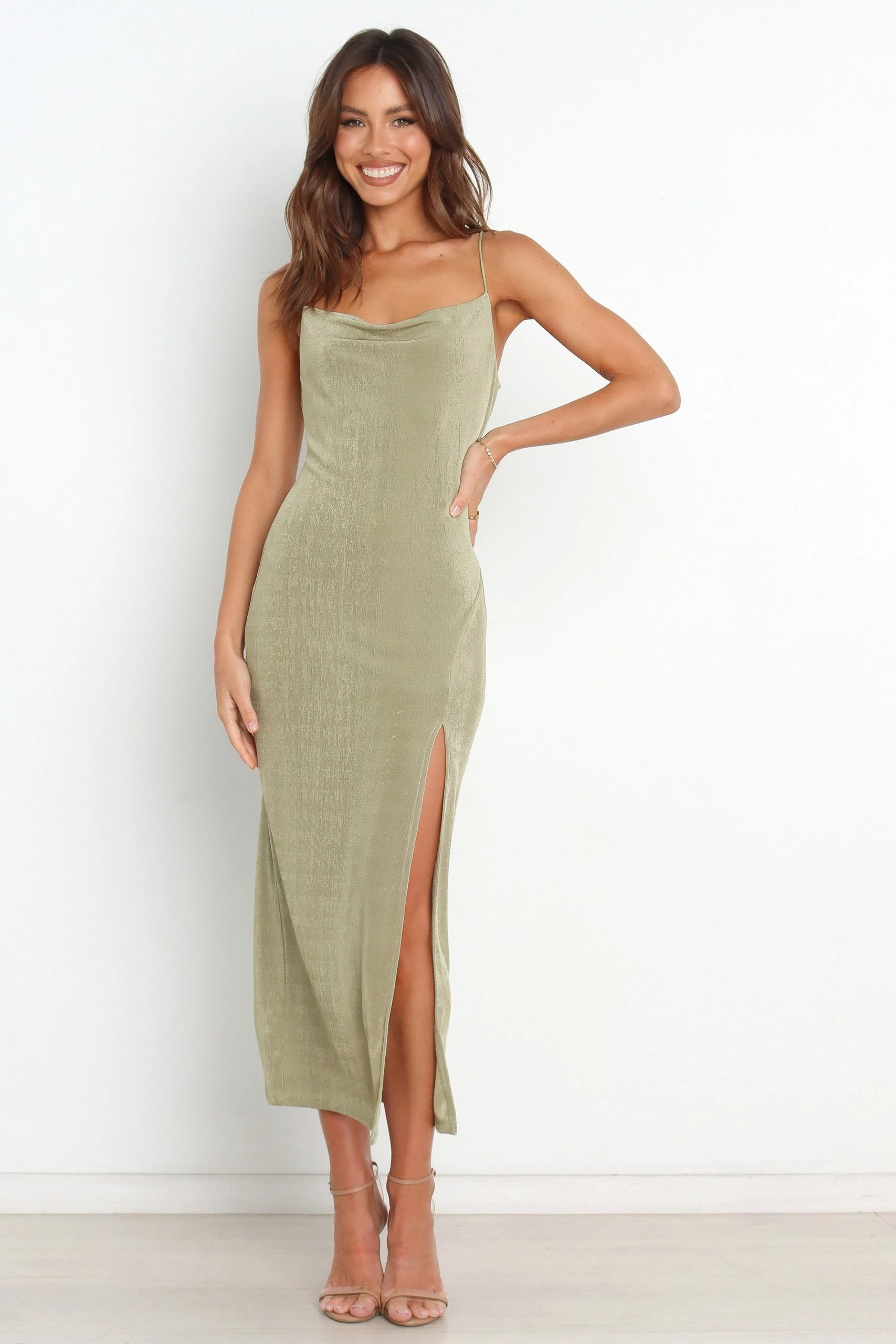 | DETAILS If you’re looking for the perfect party dress, then look no further! Our bodycon midi-length dress with cowl neckline, thin cami straps and a front split is the ideal choice. The shimmering sheen finish material will give you an added sparkle to your style on those special nights out.
