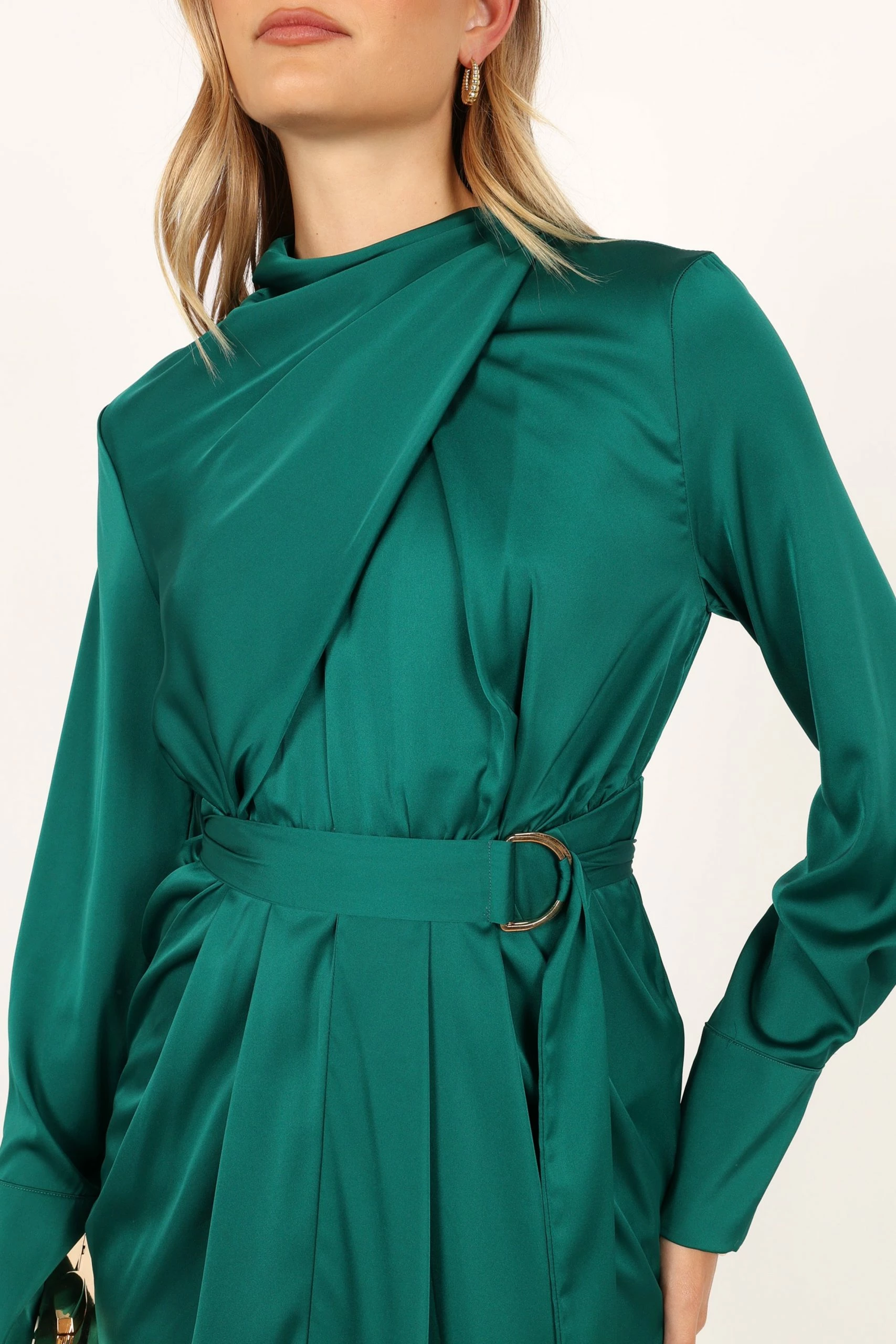 | DETAILS Are you looking for the perfect dress to wear for an event? Look no further than this gorgeous midi dress! The high mock neckline is finished with a tie close, giving it a unique and feminine style.