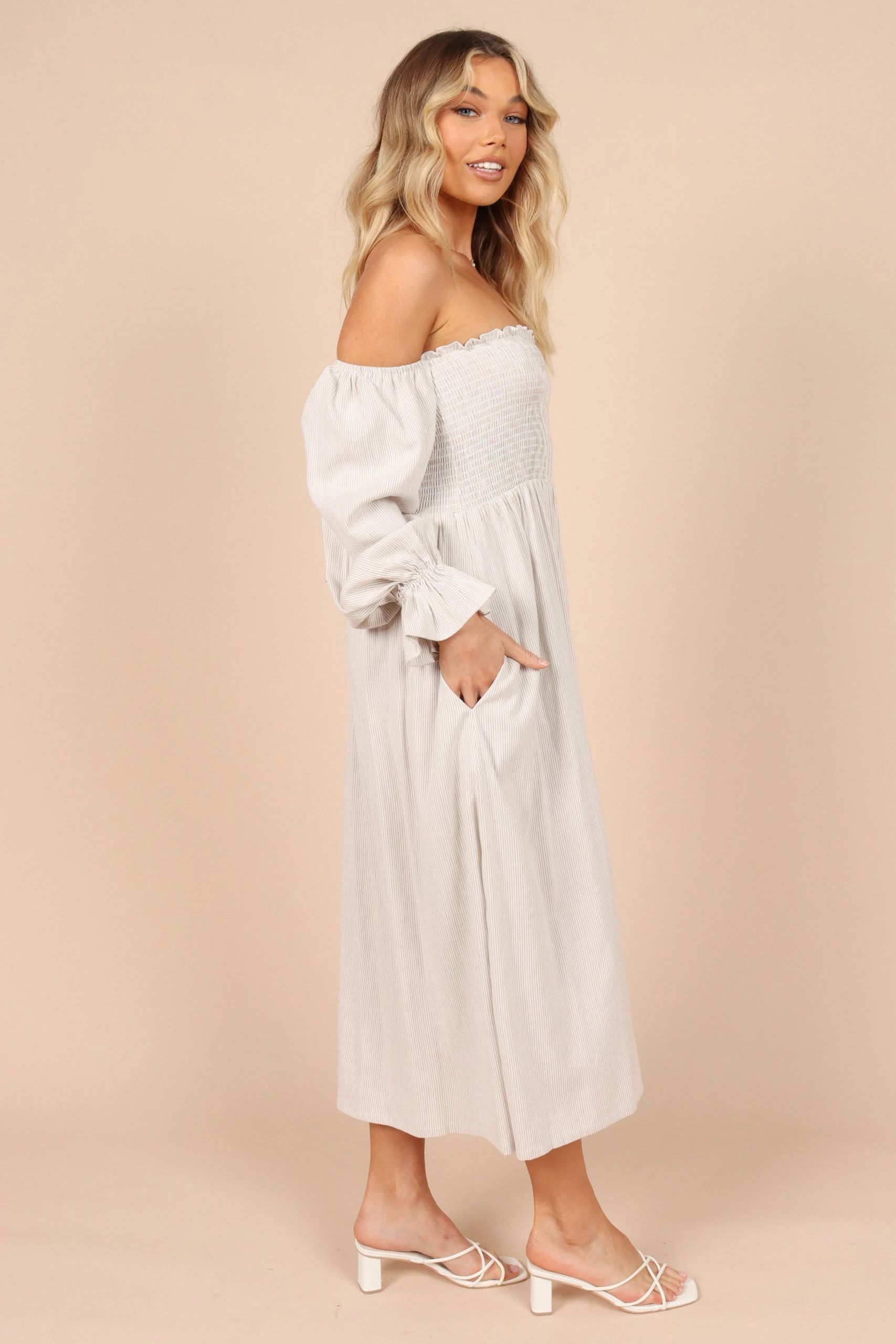 | DETAILS This off shoulder midi dress is an easy-to-wear piece that will keep you feeling feminine and elegant. The long sleeves feature elasticised shoulders, complete with a ruffle cuff for added charm. The shirred bodice ensures a comfortable fit, while the functional pockets provide extra convenience.