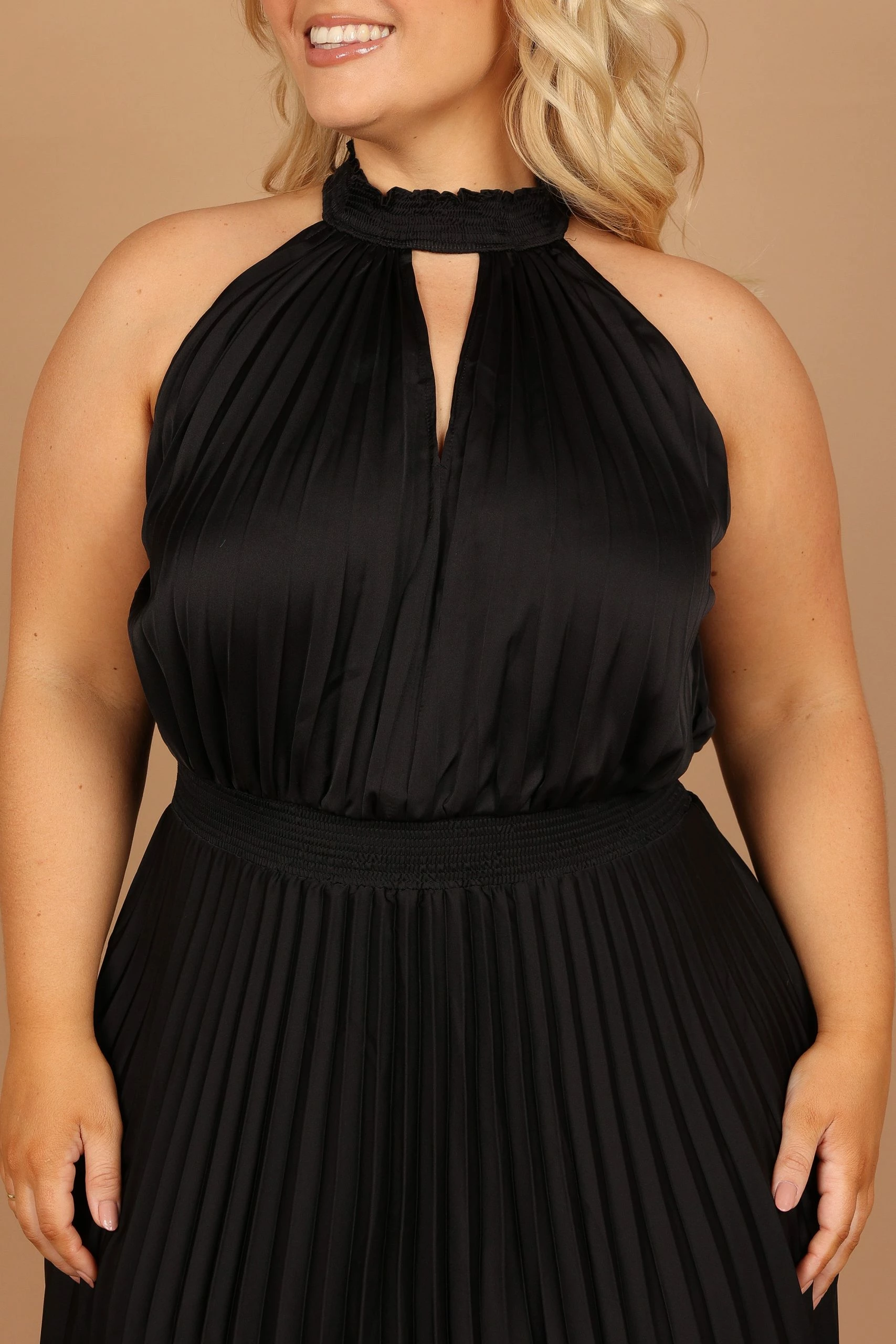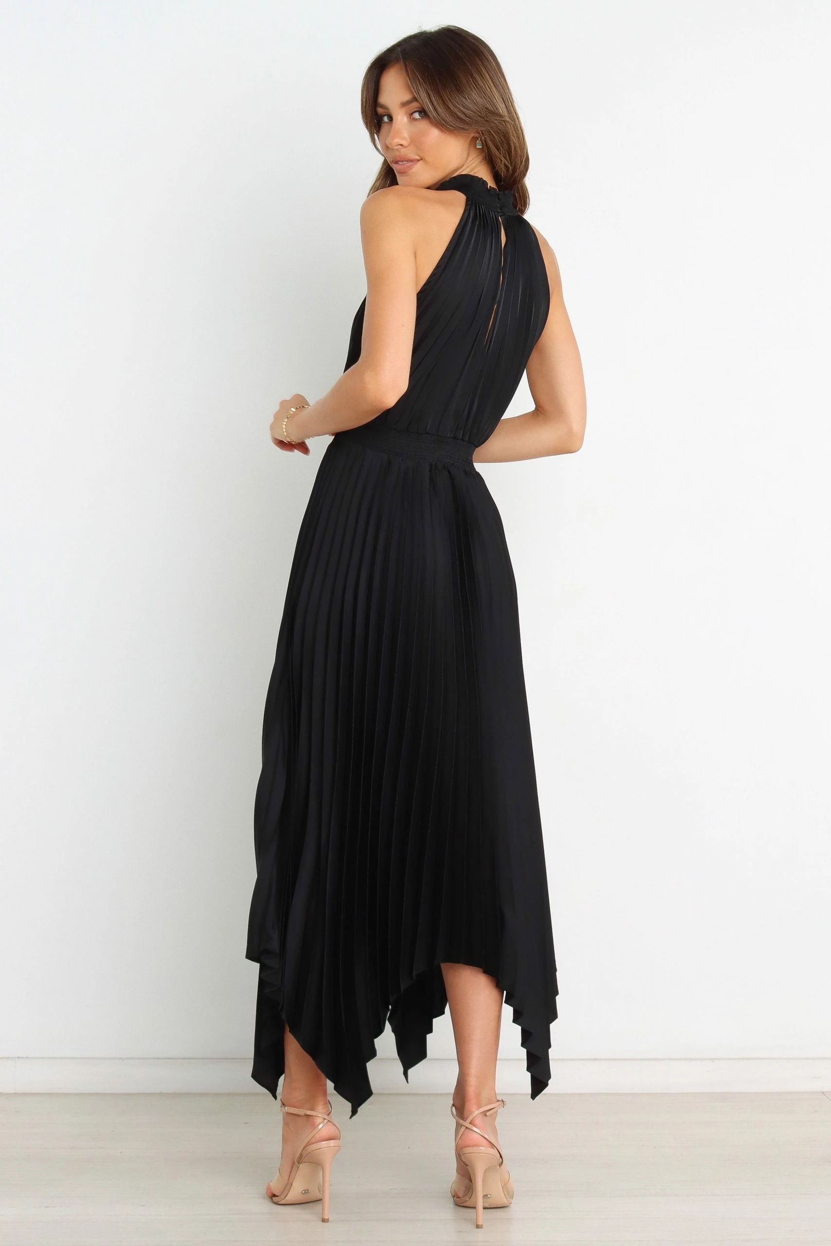 | DETAILS The Dominique is an elegant halter dress with a handkerchief hemline and cut outs for a touch of fun. Shirring creates a stunning silhouette, while the button close front means it’s easily worn. Perfect for date night or special events, the fine pleats and satin finish will have you feeling stylish.