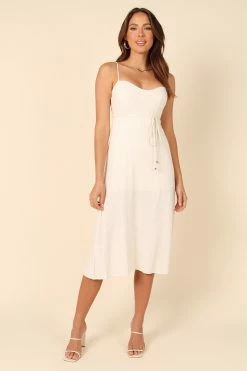 | DETAILS This midi length dress is perfect for any special occasion! Featuring a sweetheart neckline, thin adjustable straps and pre-sewn padded bra cups, this dress has all the comfort and support you need. The back invisible zip ensures a snug fit while the shirred back panel adds a unique feminine touch.