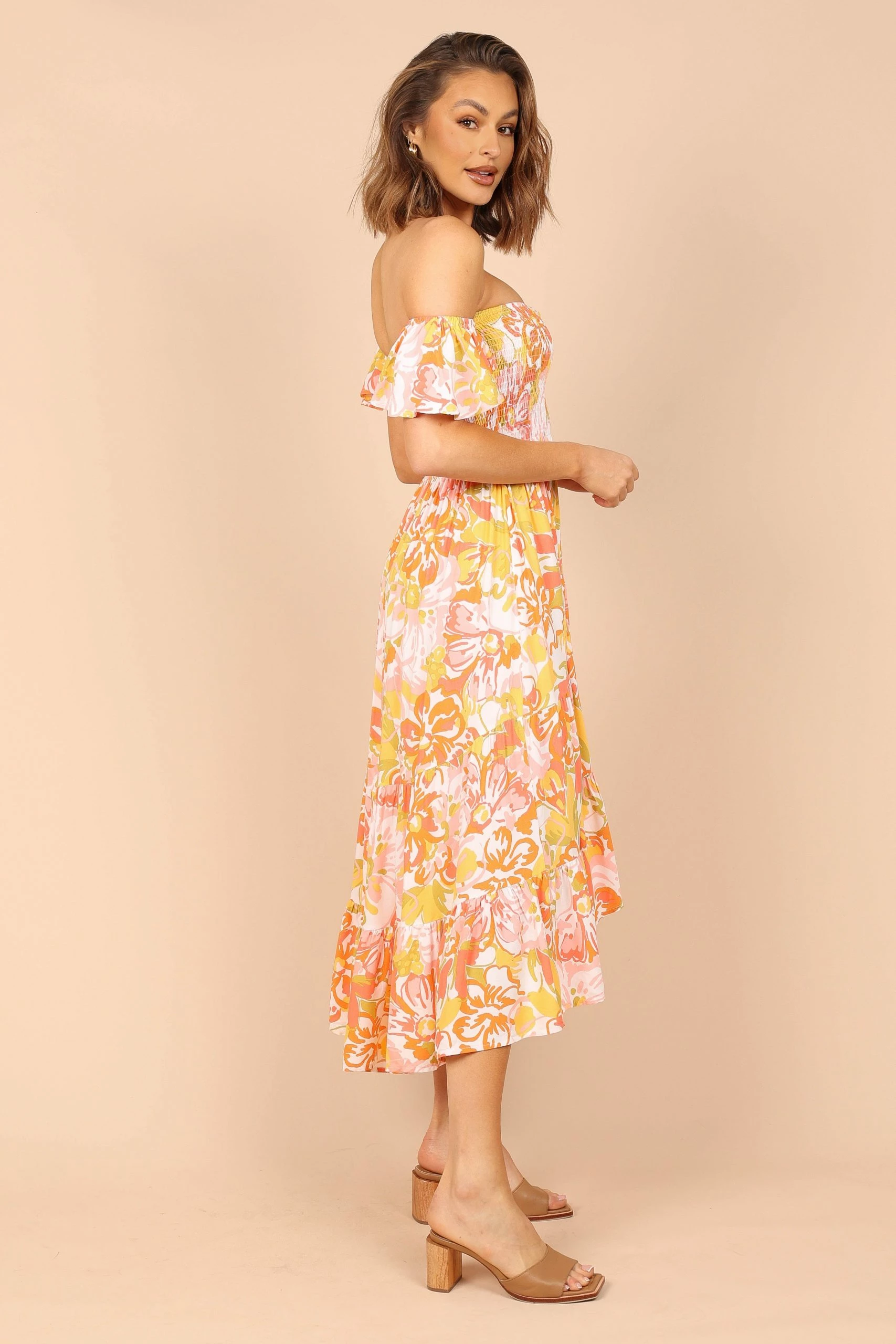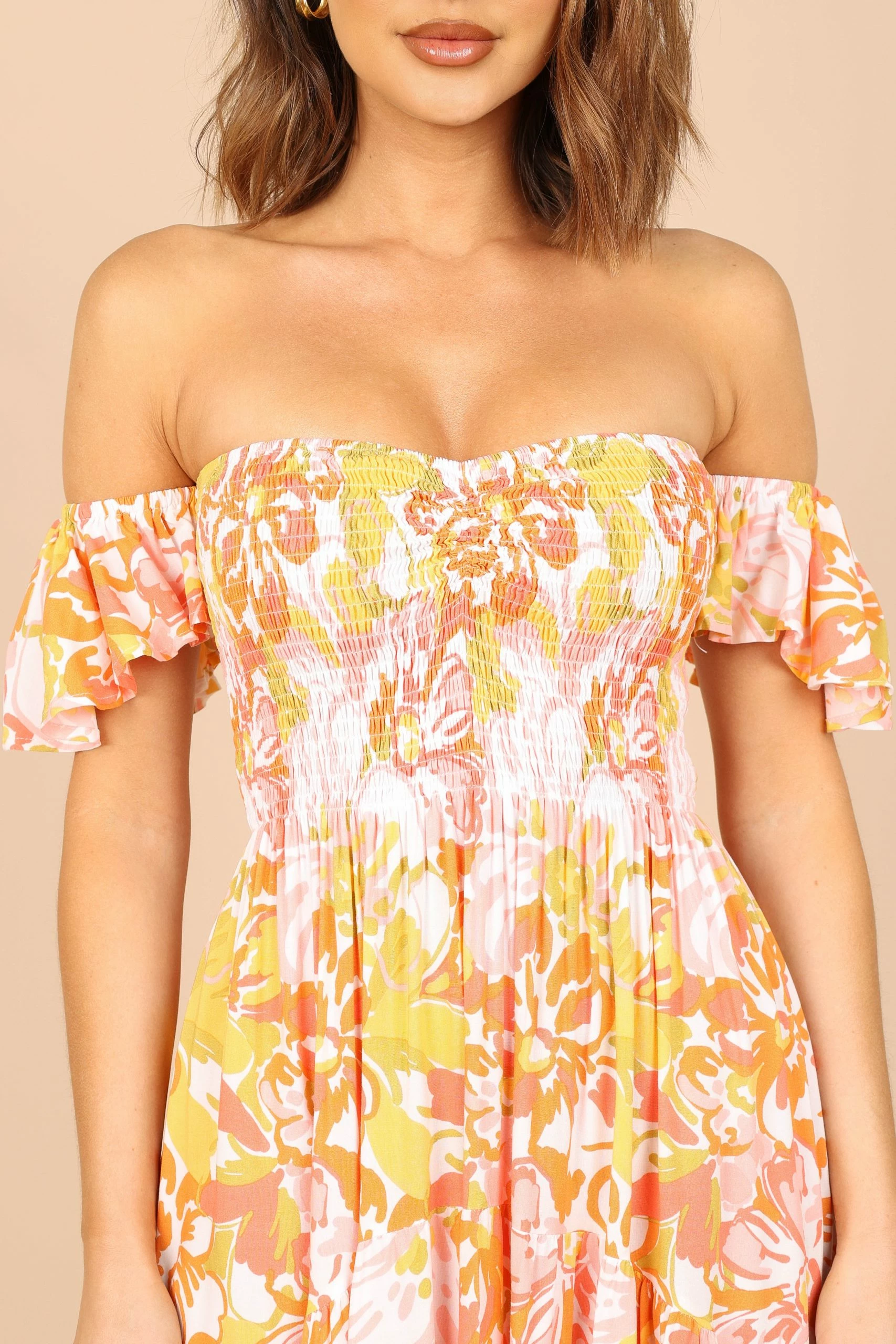 | DETAILS This maxi dress features a romantic off-shoulder style with a sweetheart neckline, short ruffle sleeves, and an elasticised band. The shirred bodice and the ruched detail on the bust create a flattering shape while the high low hemline gives it added movement.