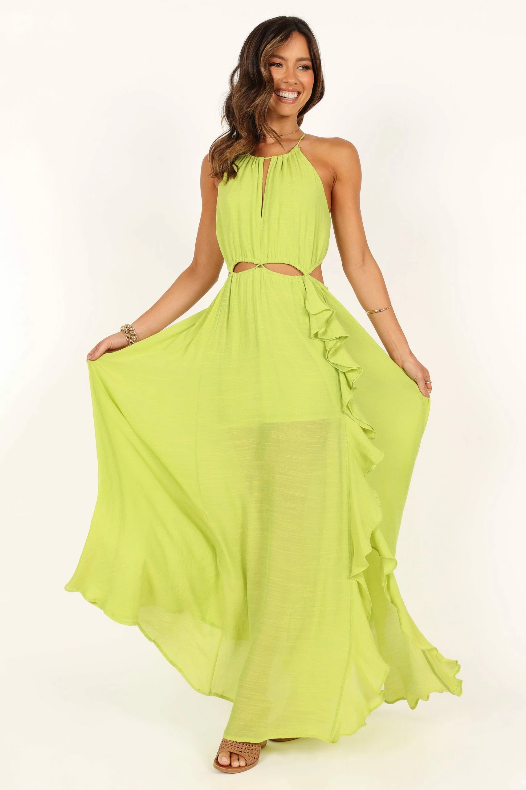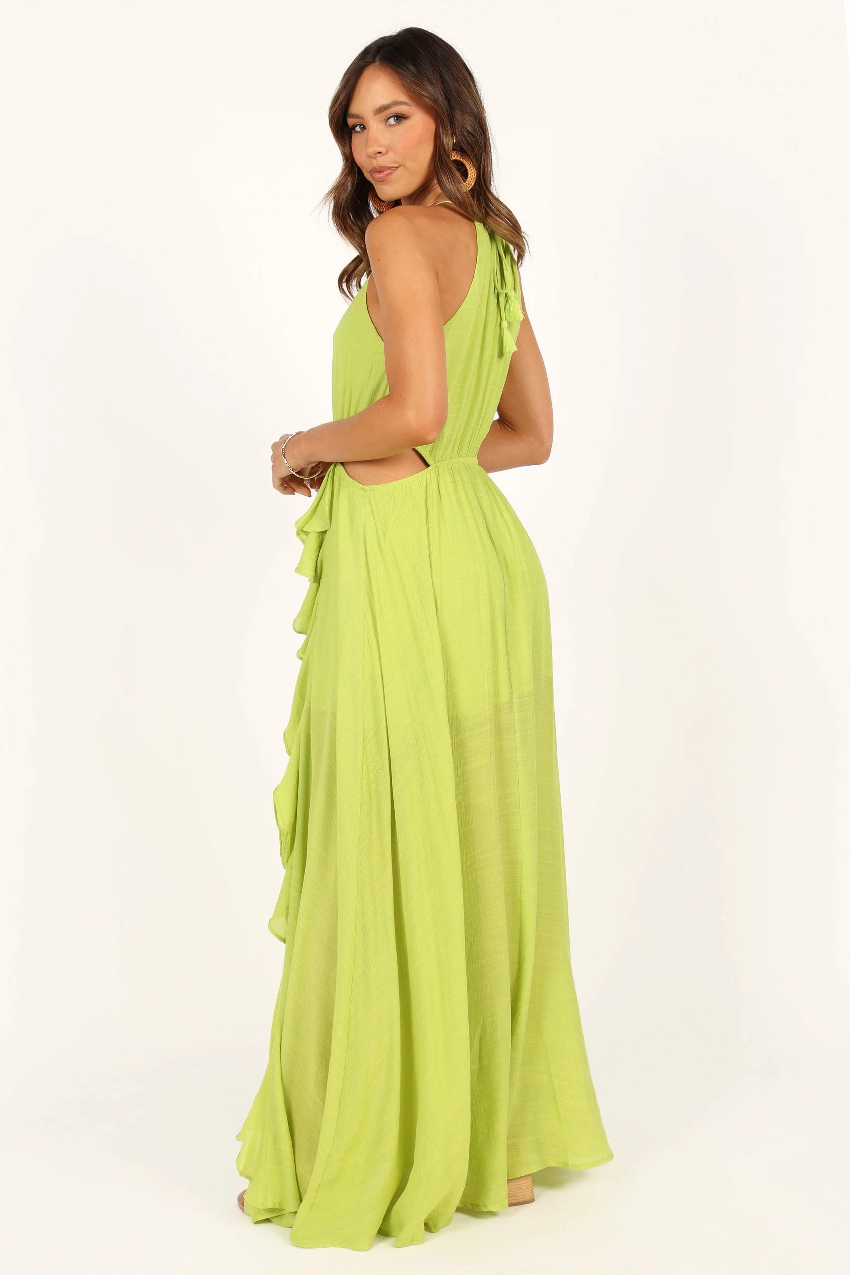 | DETAILS Whether you’re heading to a party or special event, this dress is sure to make you stand out from the crowd. Featuring a high neckline with cutout details, back tie close, and a waterfall frill detail that adds a beautiful feminine touch.