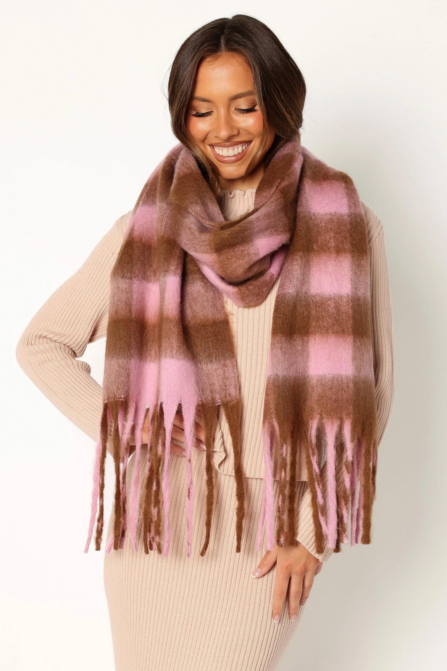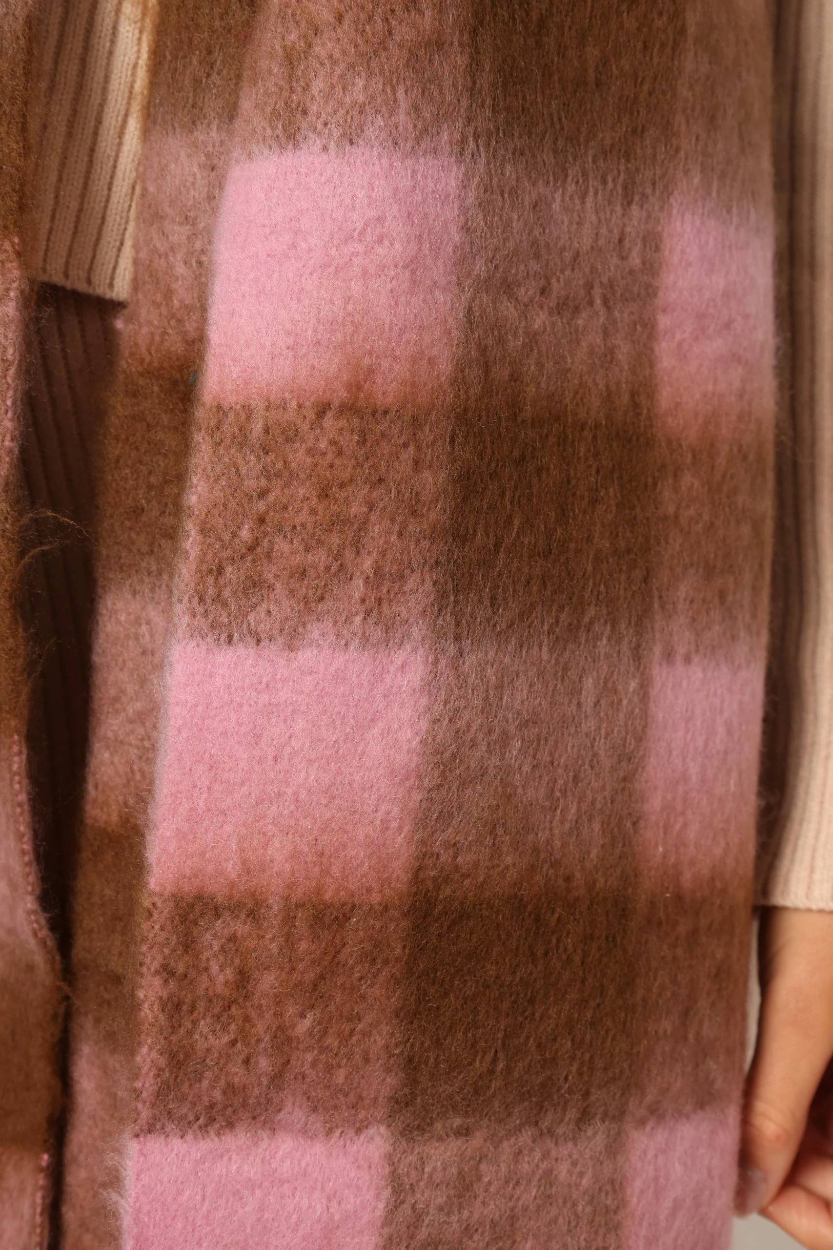 | DETAILS This oversized scarf is the perfect addition to your wardrobe! It’s a beautiful pink check design in a large, rectangular shape. Its two tassel ends make it even more fun and stylish, while its soft feel will keep you cozy all day long.