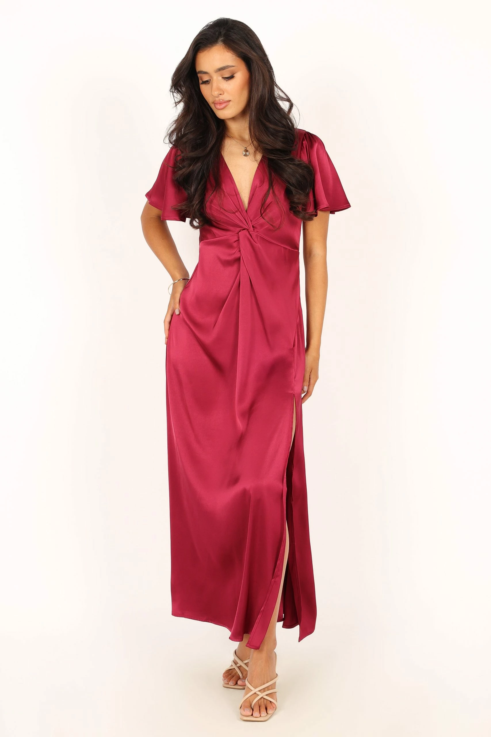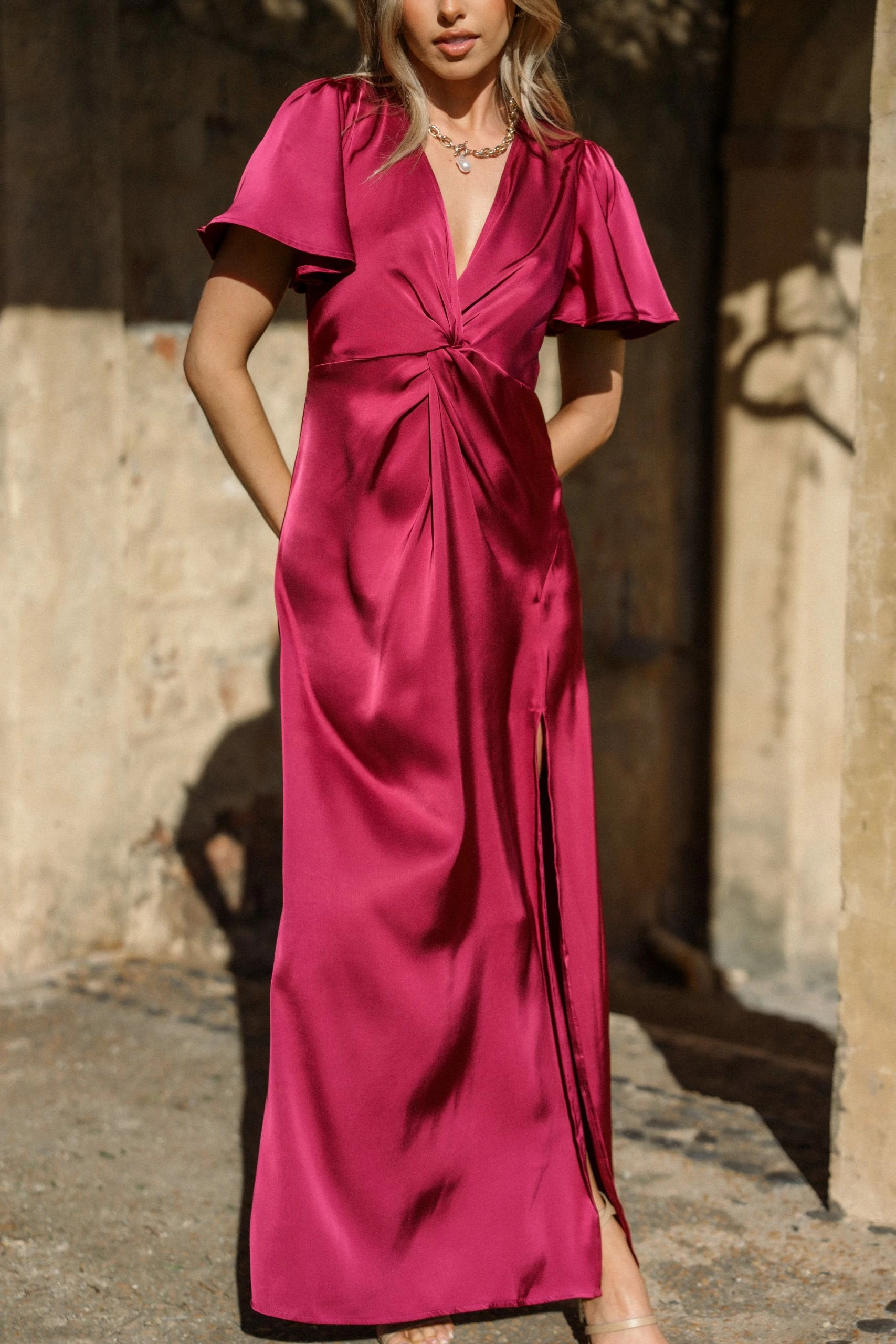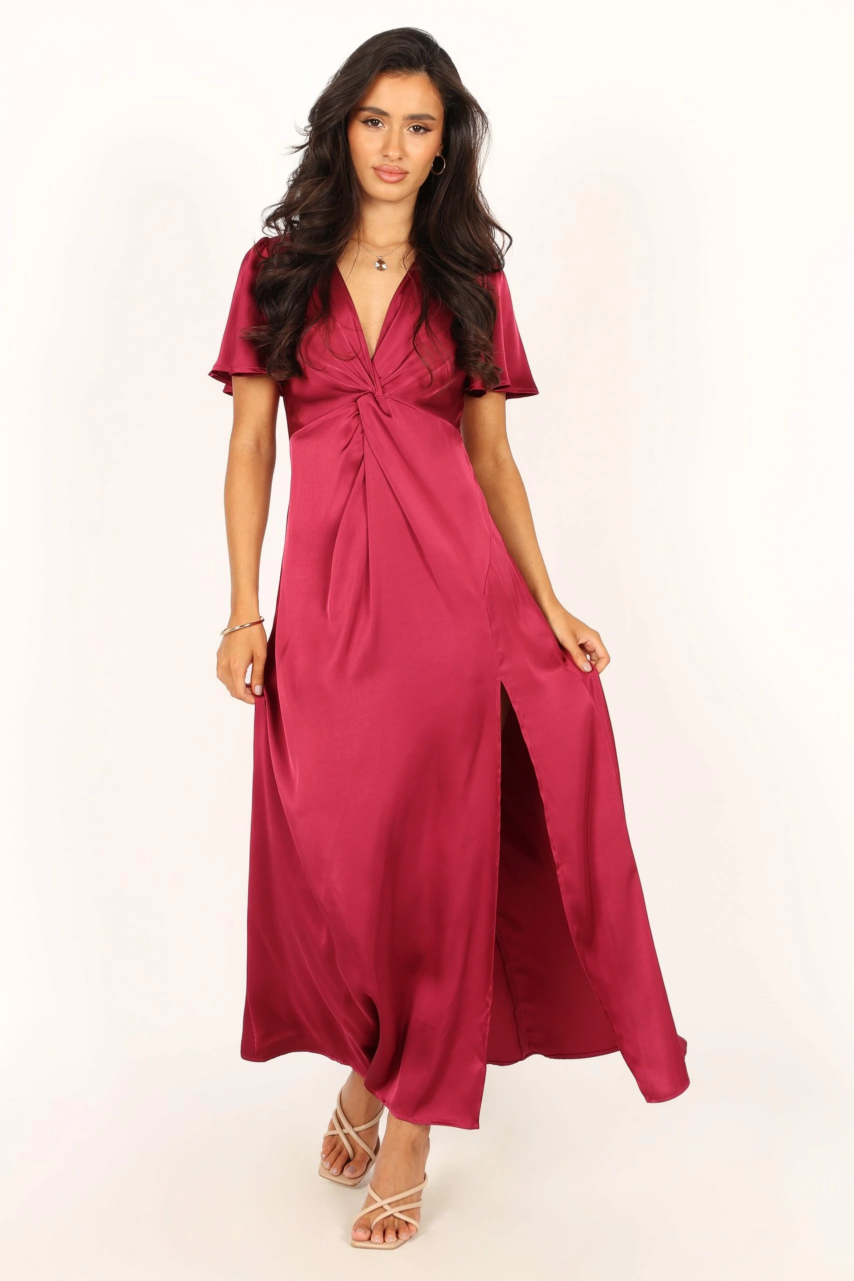 | DETAILS Introducing the Berry Knot Midi Dress. This beautiful midi length dress features a V-neckline with short sleeves and knot bust feature for a flattering silhouette.