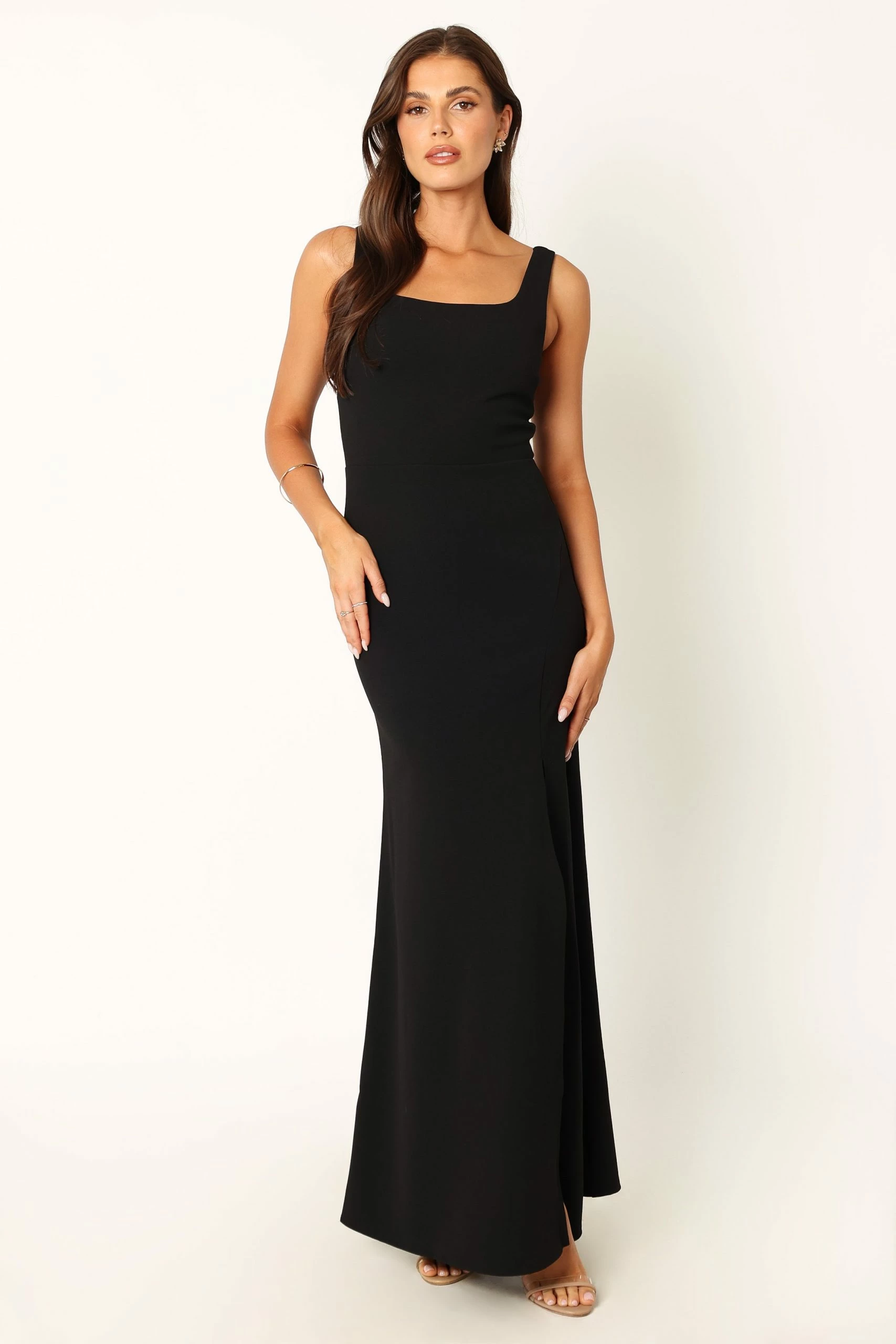 | DETAILS The Hyatt Dress is perfect for any special occasion. This maxi style has a square neckline with a front split, creating a stunning silhouette that is sure to turn heads. Pair it with your favourite heels and purse!