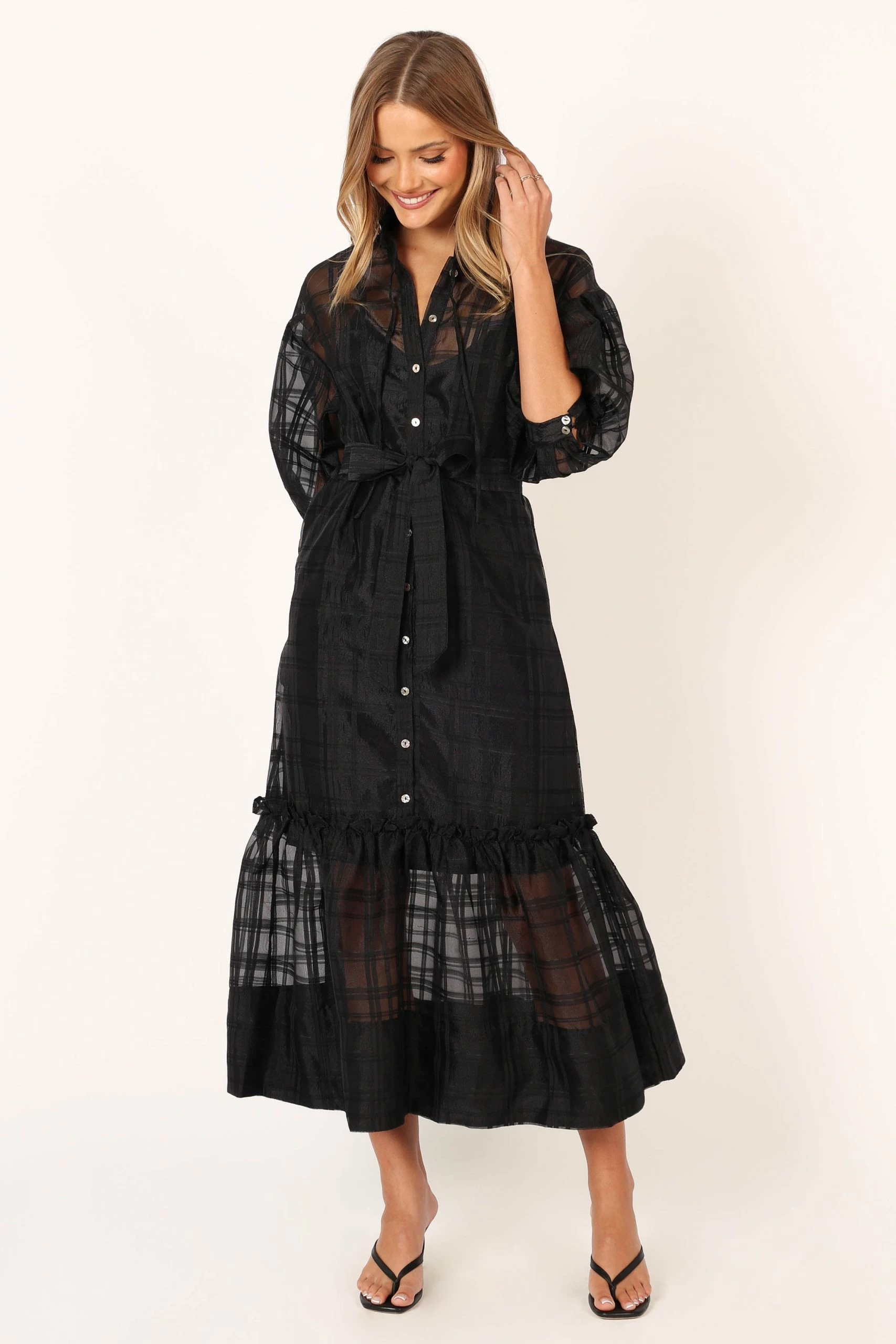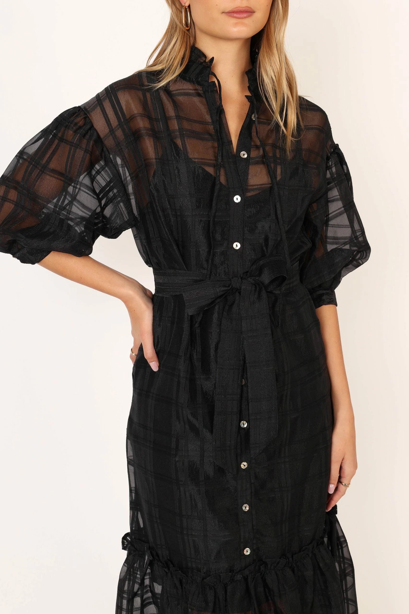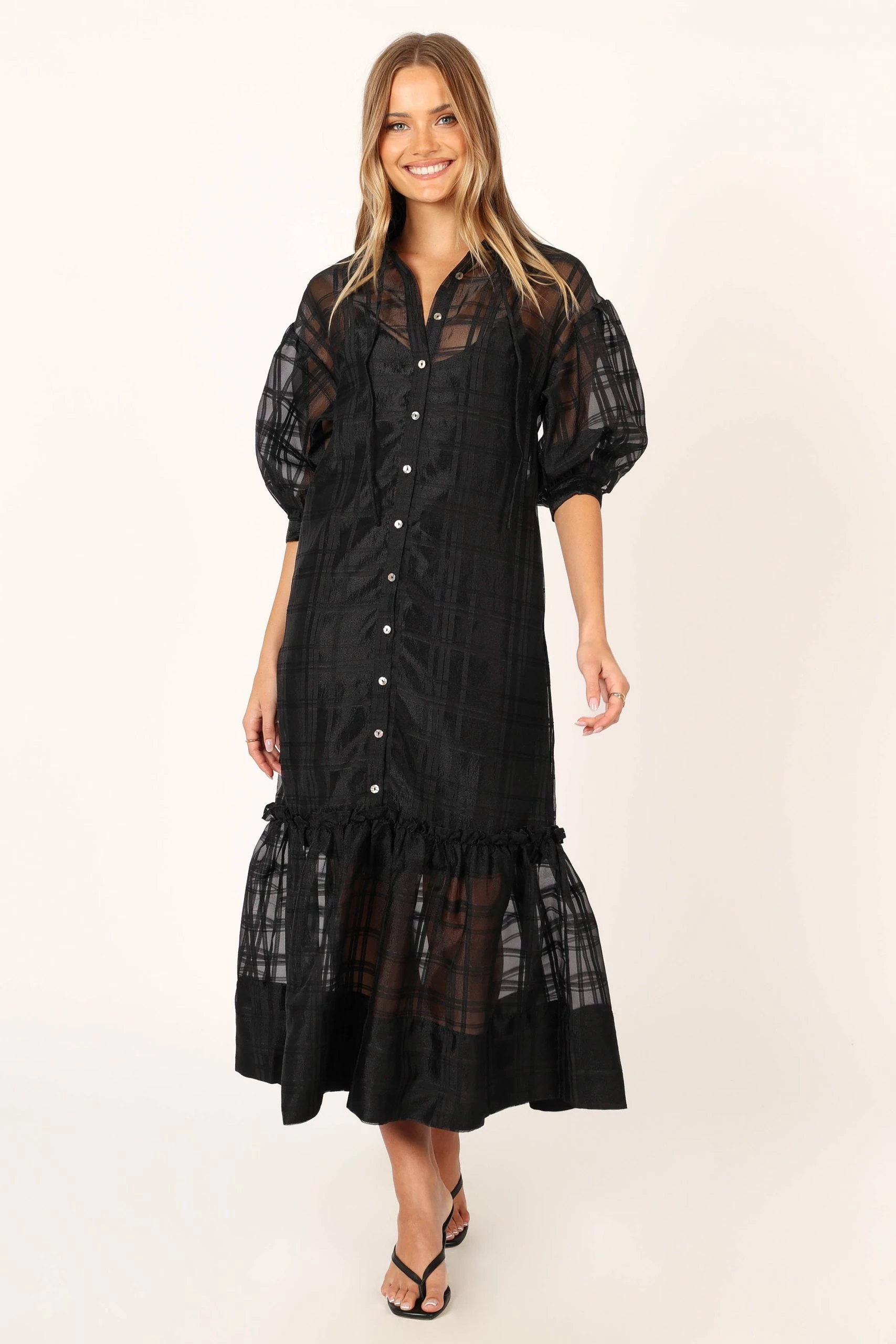 | DETAILS Make an entrance in this effortlessly chic maxi dress! This black frock is crafted from a lightweight fabric and features a high neckline with playful ruffle detailing, short sleeves with button close, functional buttons down the front, and a sheer overlay design for added flair.