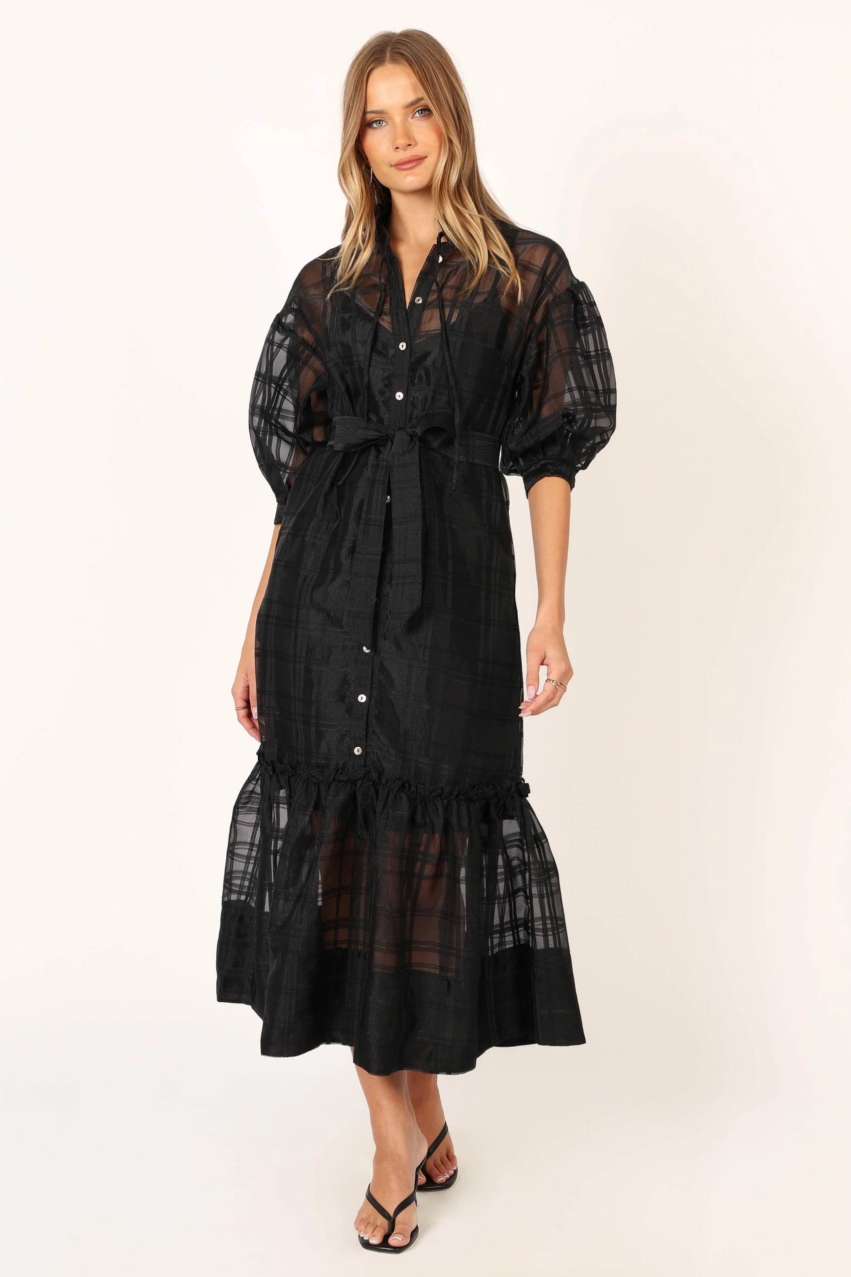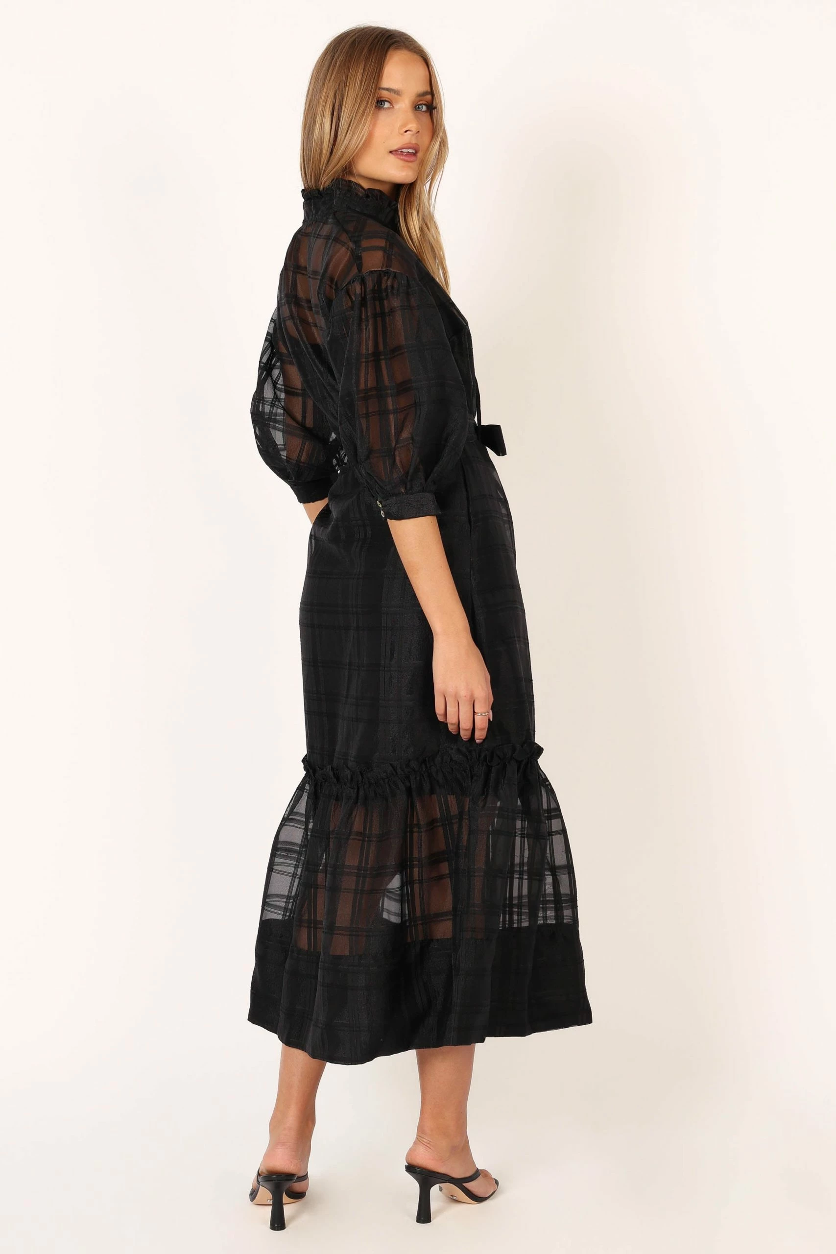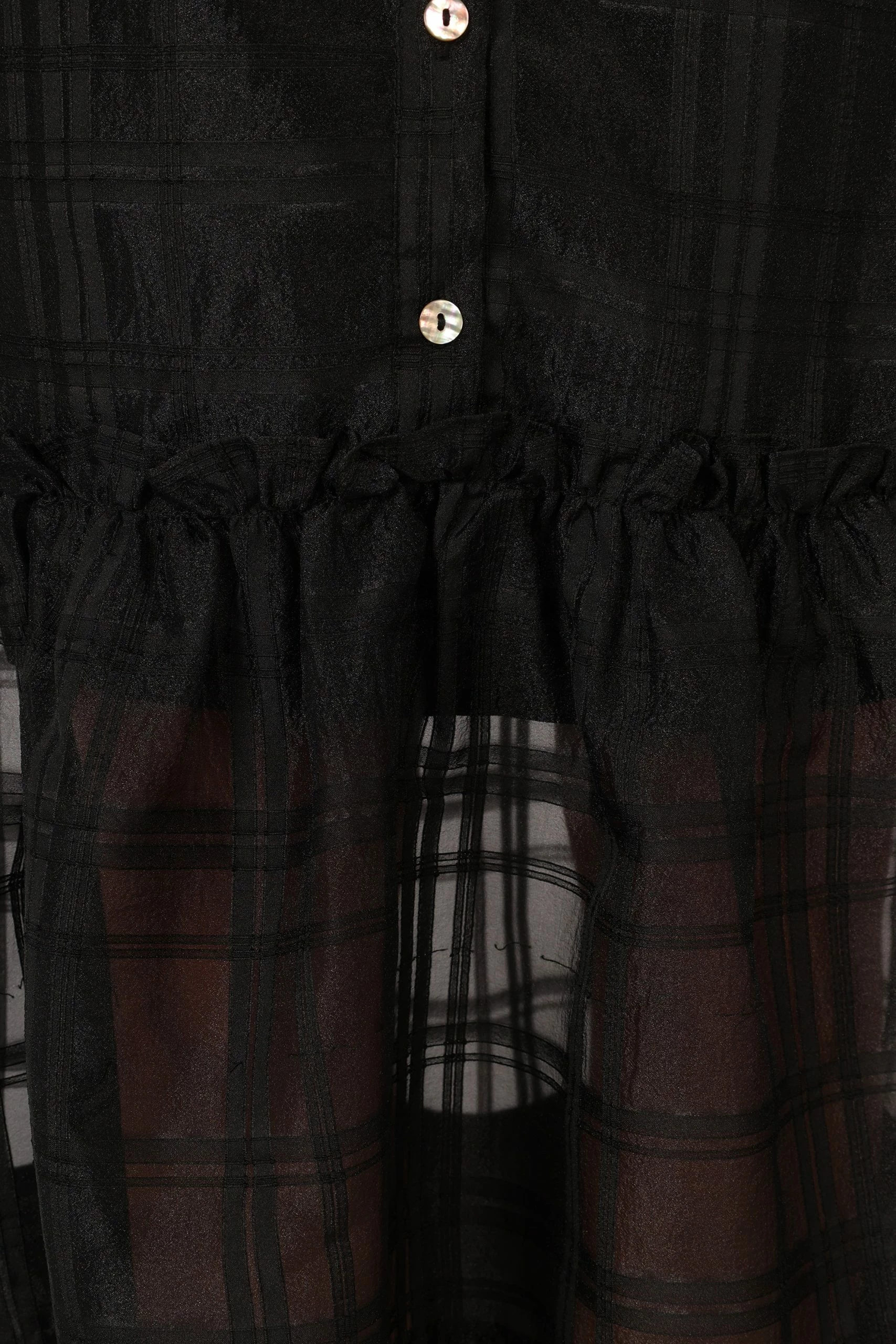 | DETAILS Make an entrance in this effortlessly chic maxi dress! This black frock is crafted from a lightweight fabric and features a high neckline with playful ruffle detailing, short sleeves with button close, functional buttons down the front, and a sheer overlay design for added flair.