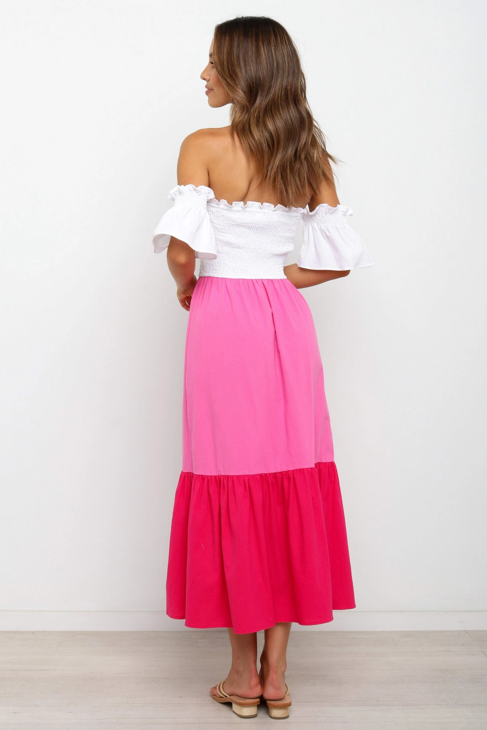 | DETAILS This off-shoulder midi dress is a stunning look for any occasion. The ruffle neckline, short sleeves with elasticised shoulders, and shirred bodice create an irresistible silhouette that will turn heads wherever you go!