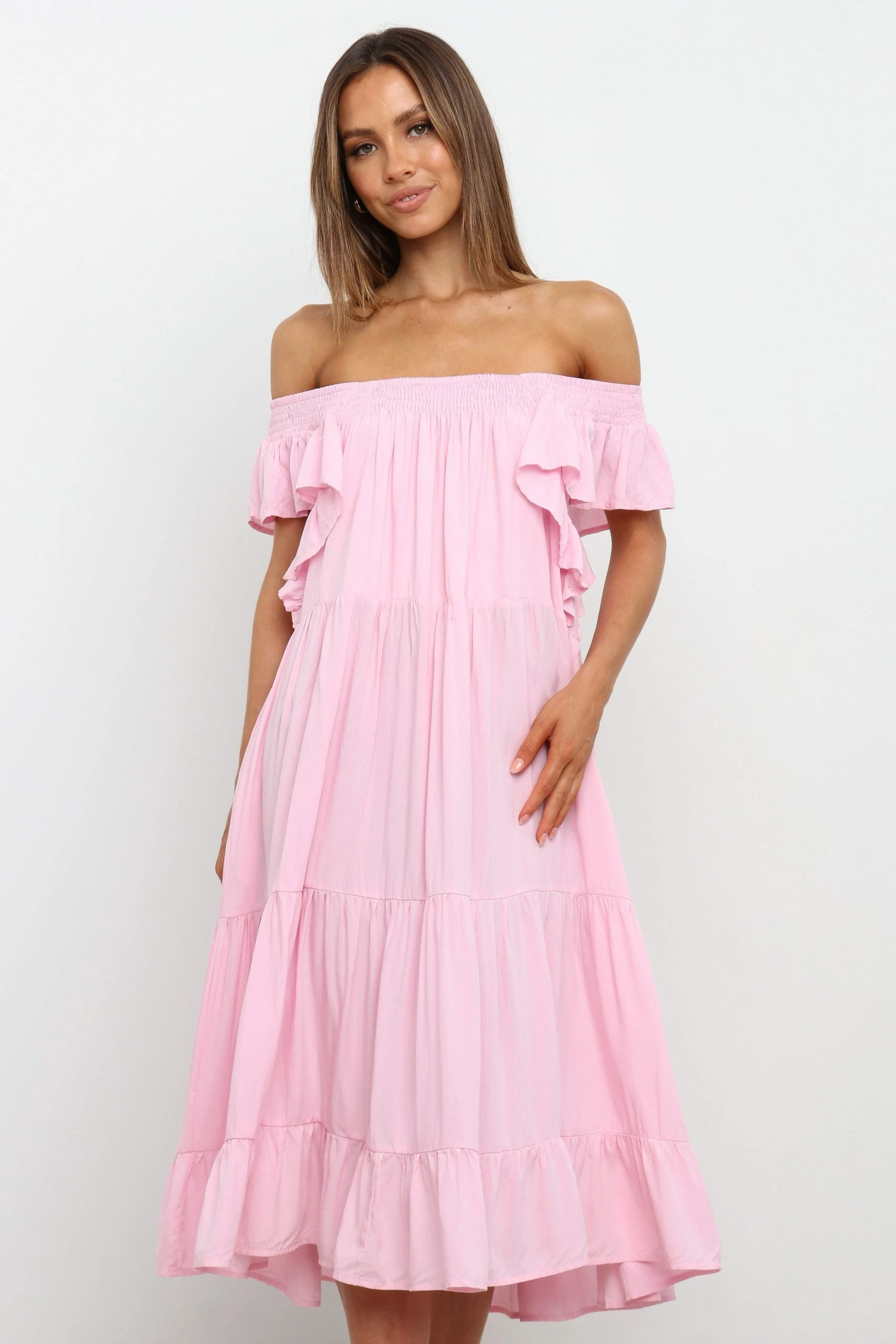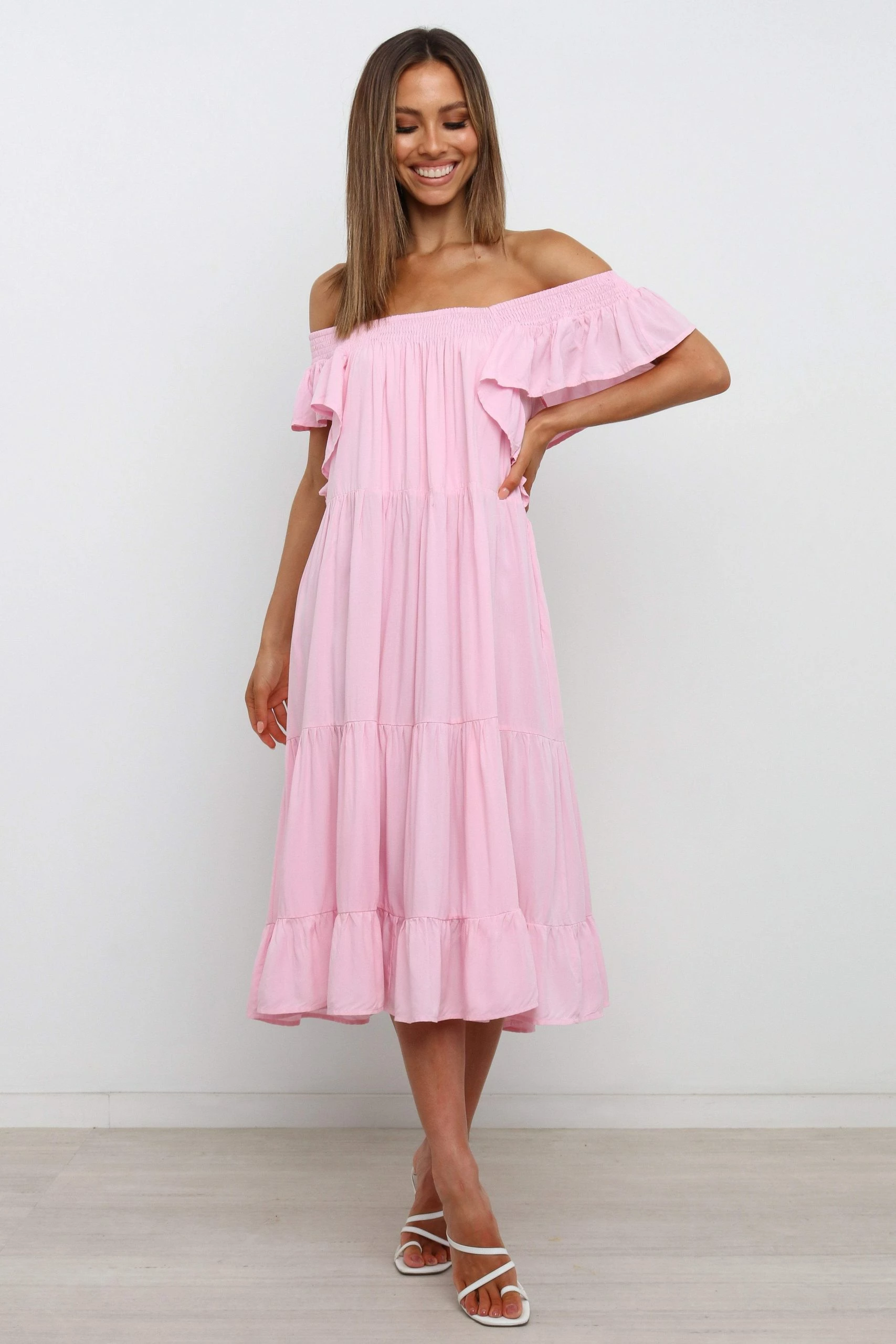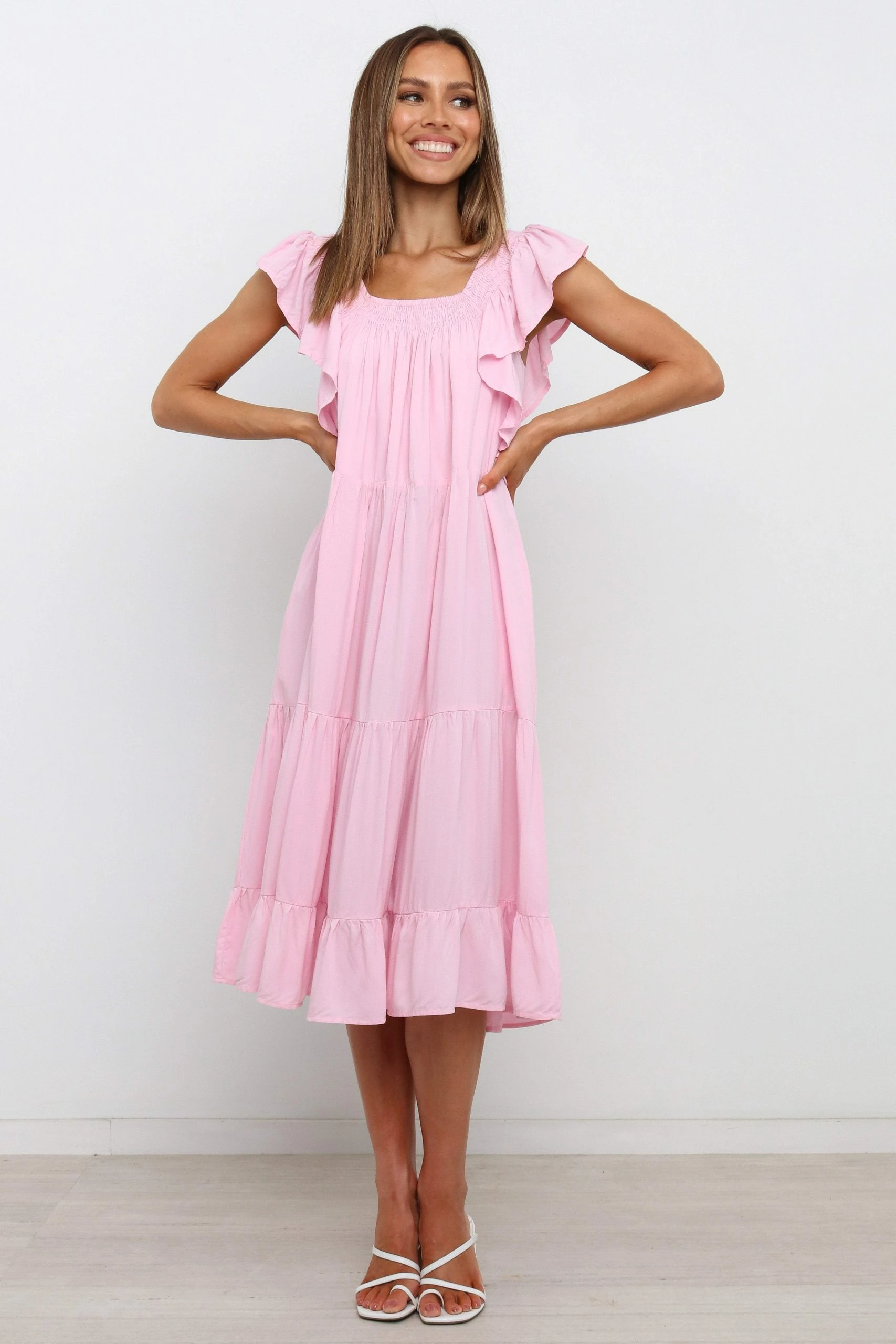 | DETAILS This midi-length dress is sure to make a statement! With its shirred square neckline, cap ruffle sleeves, and side pockets, it’s an easy way to look stylish. And the tiered gathered skirt panels give it a romantic and feminine touch that you’ll love!