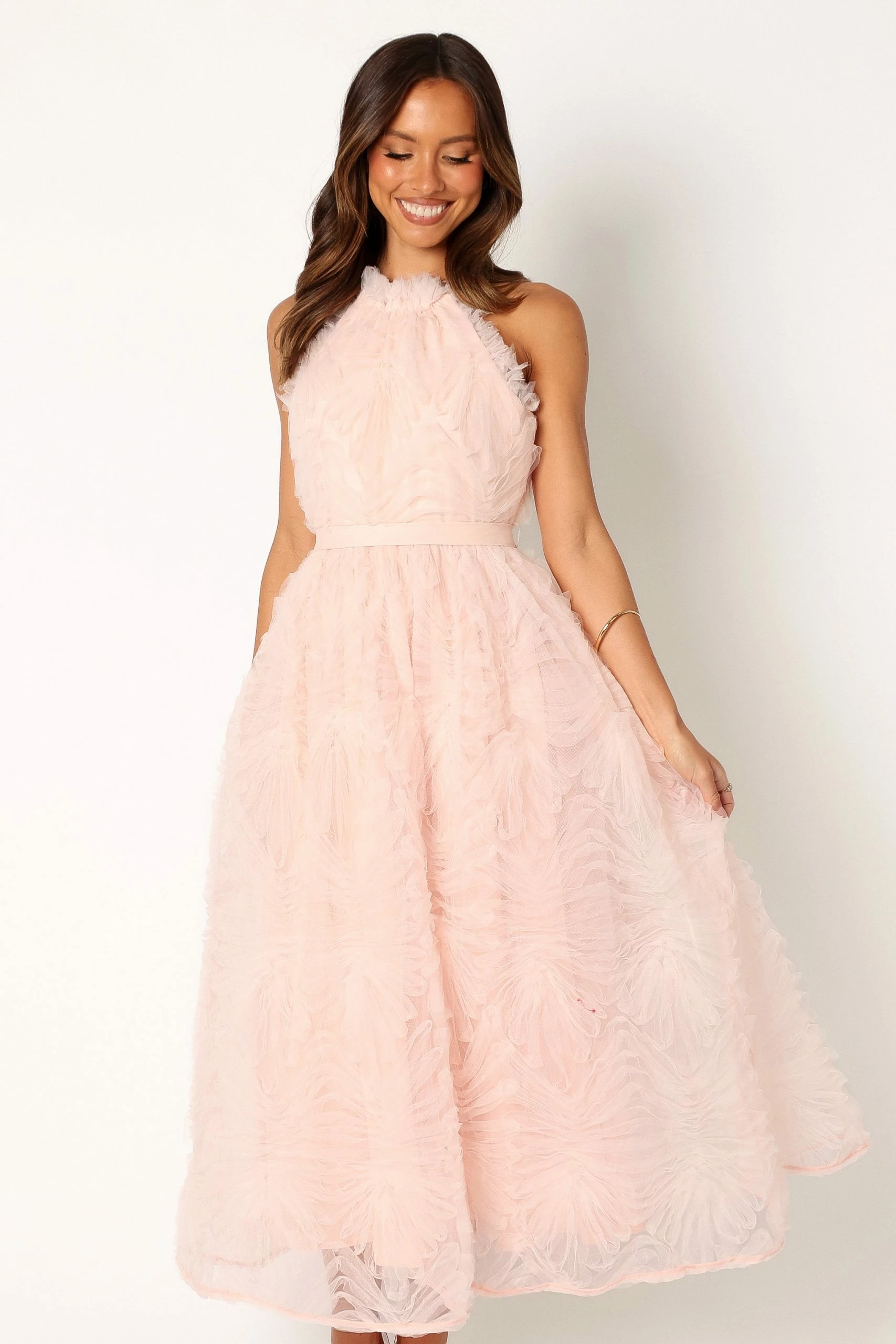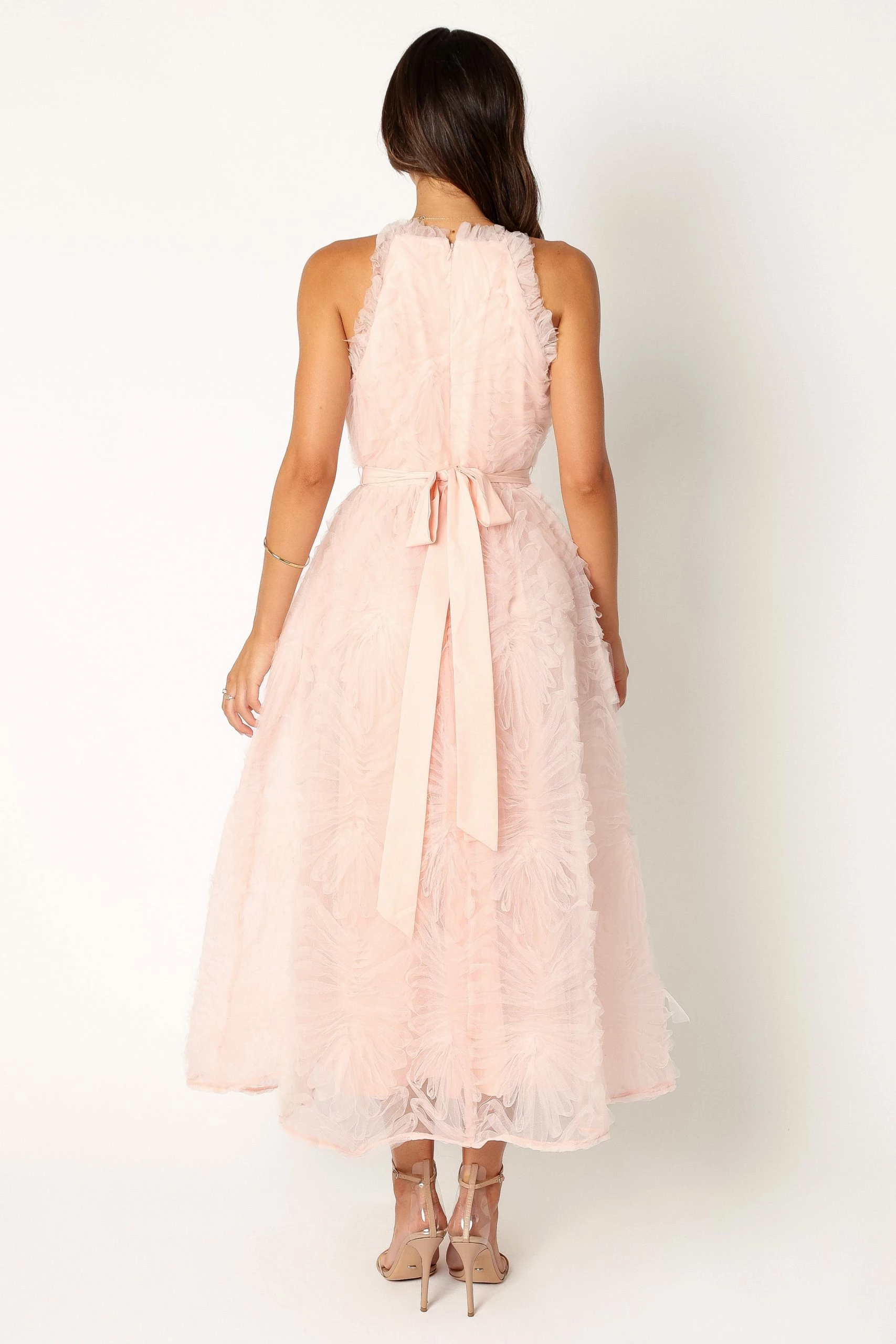 | DETAILS Introducing the statement of the season – the Kai Textured Midi Dress with non-adjustable straps, sleeveless design and back invisible zip. This eventwear piece is dressed up with belt loops and comes with a detachable waist tie for added flounce.