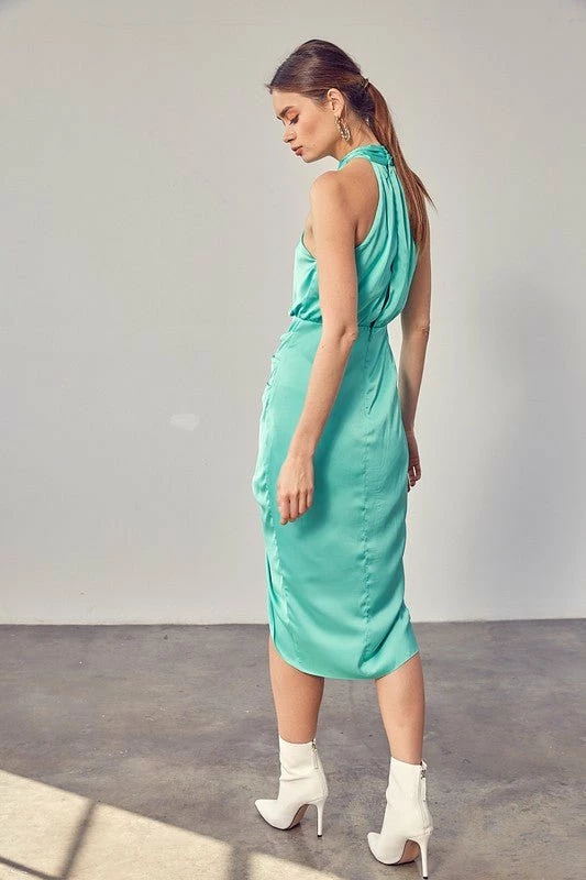 | DETAILS Feel your most feminine in this gorgeous halter style midi dress! Its soft satin feel and unique front cross over halter neckline with button close make it a must-have for any special occasion.