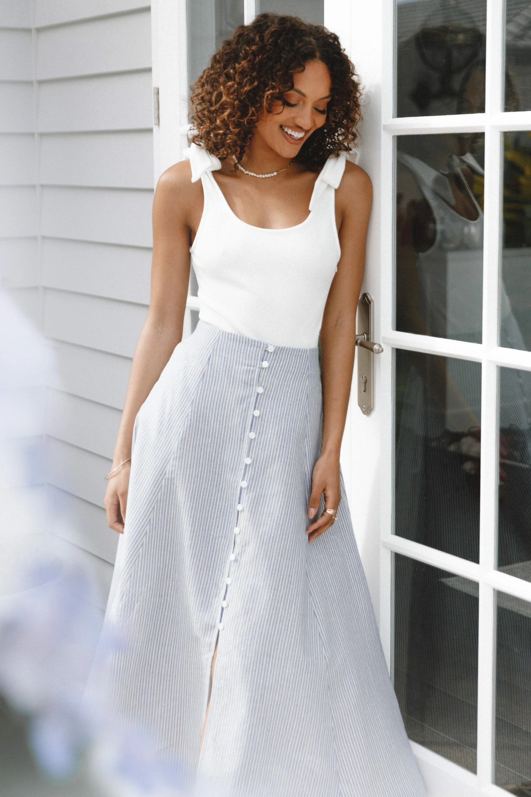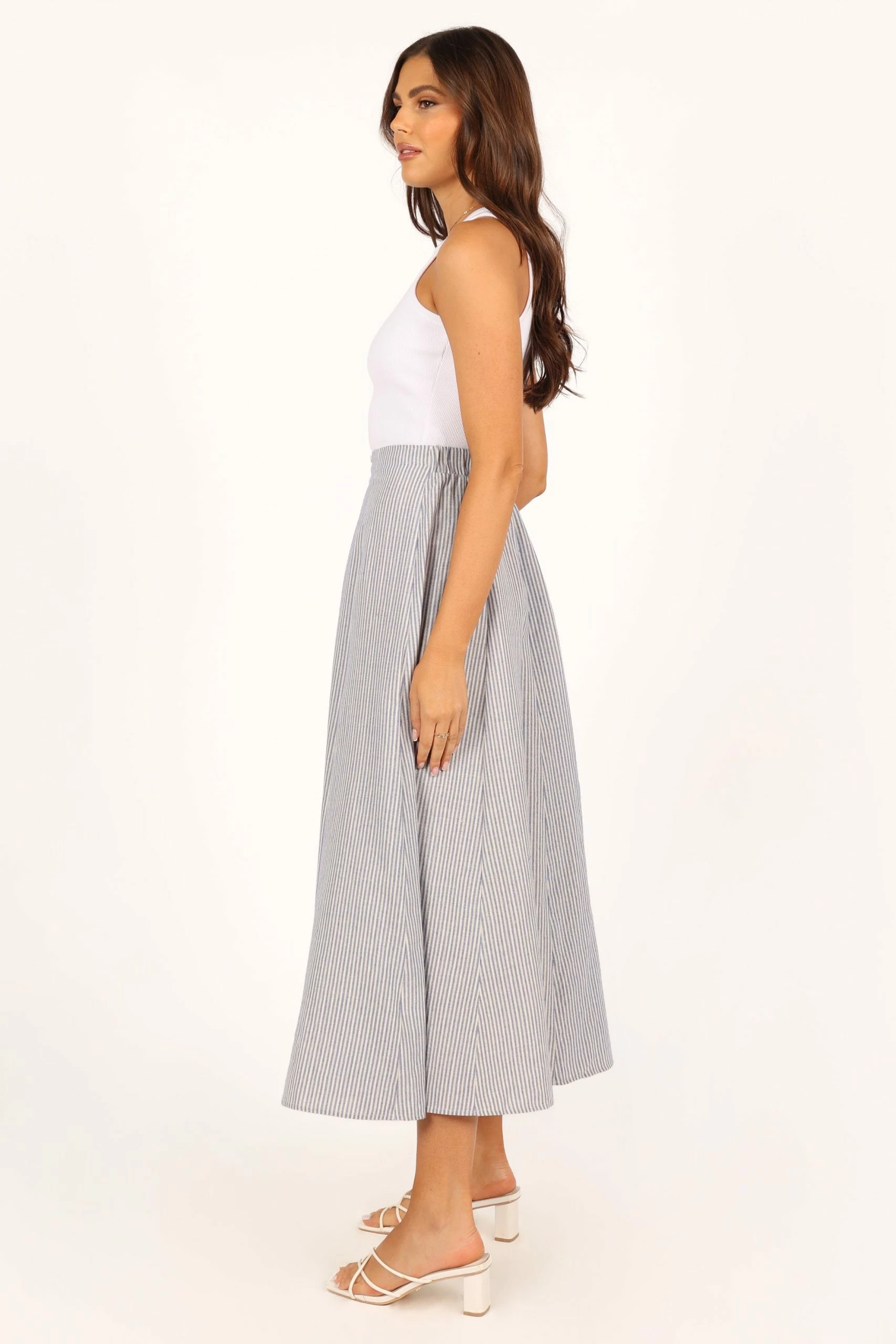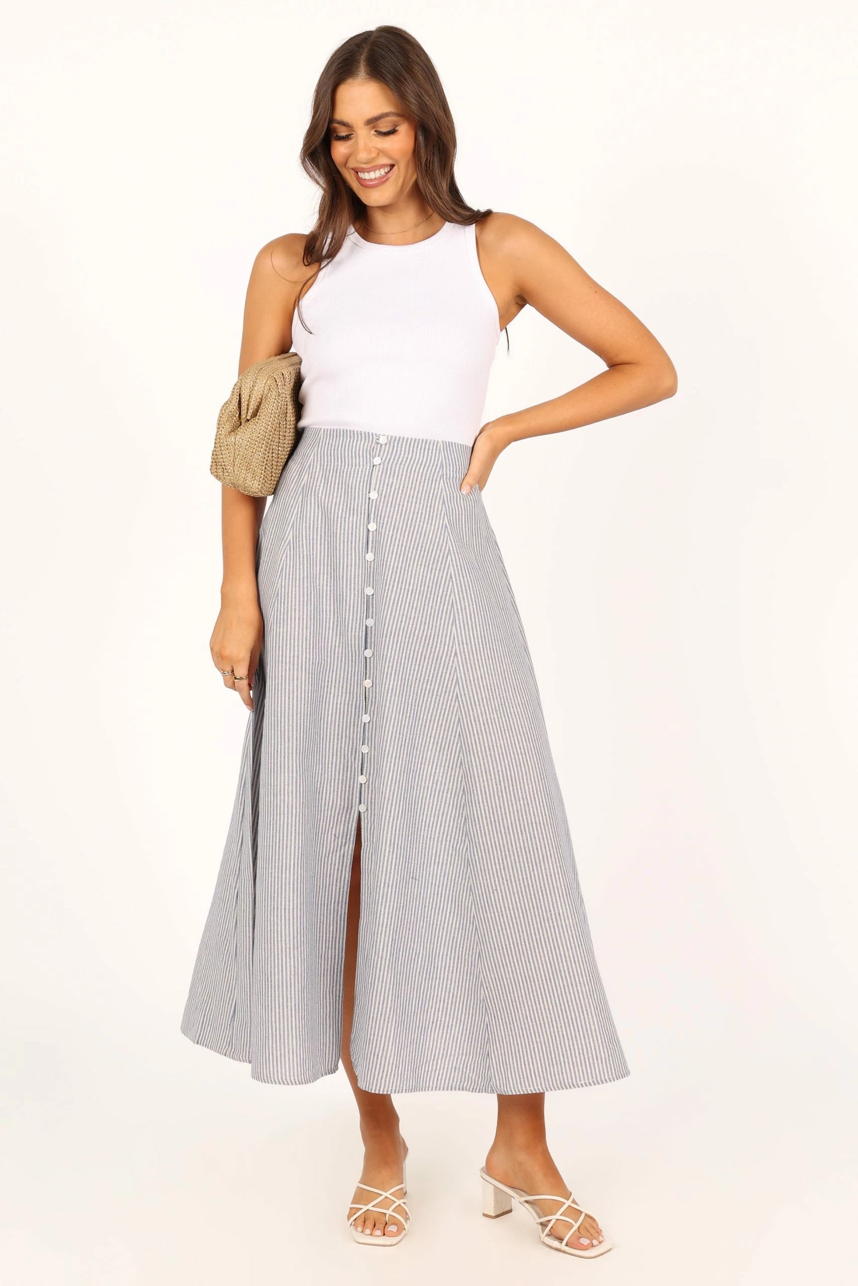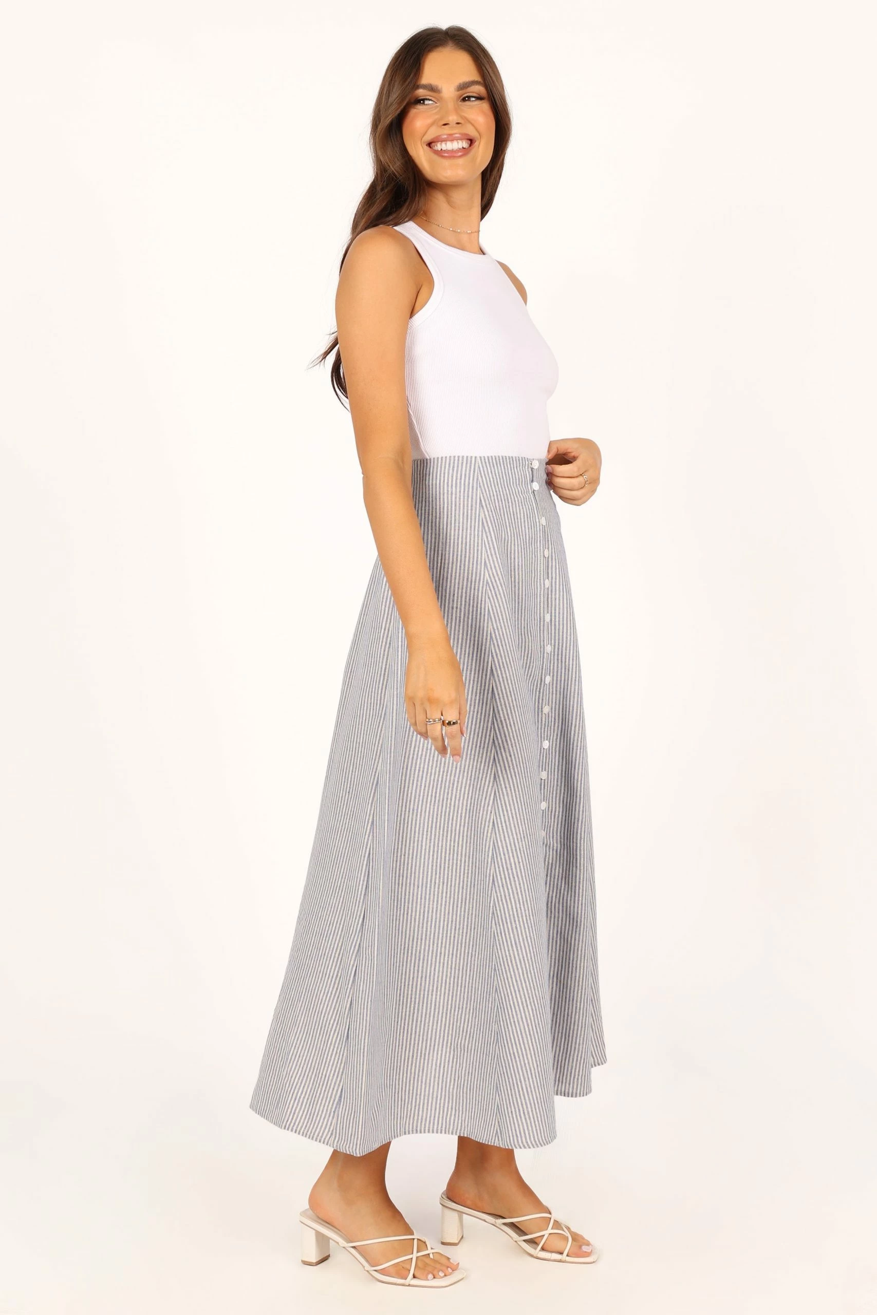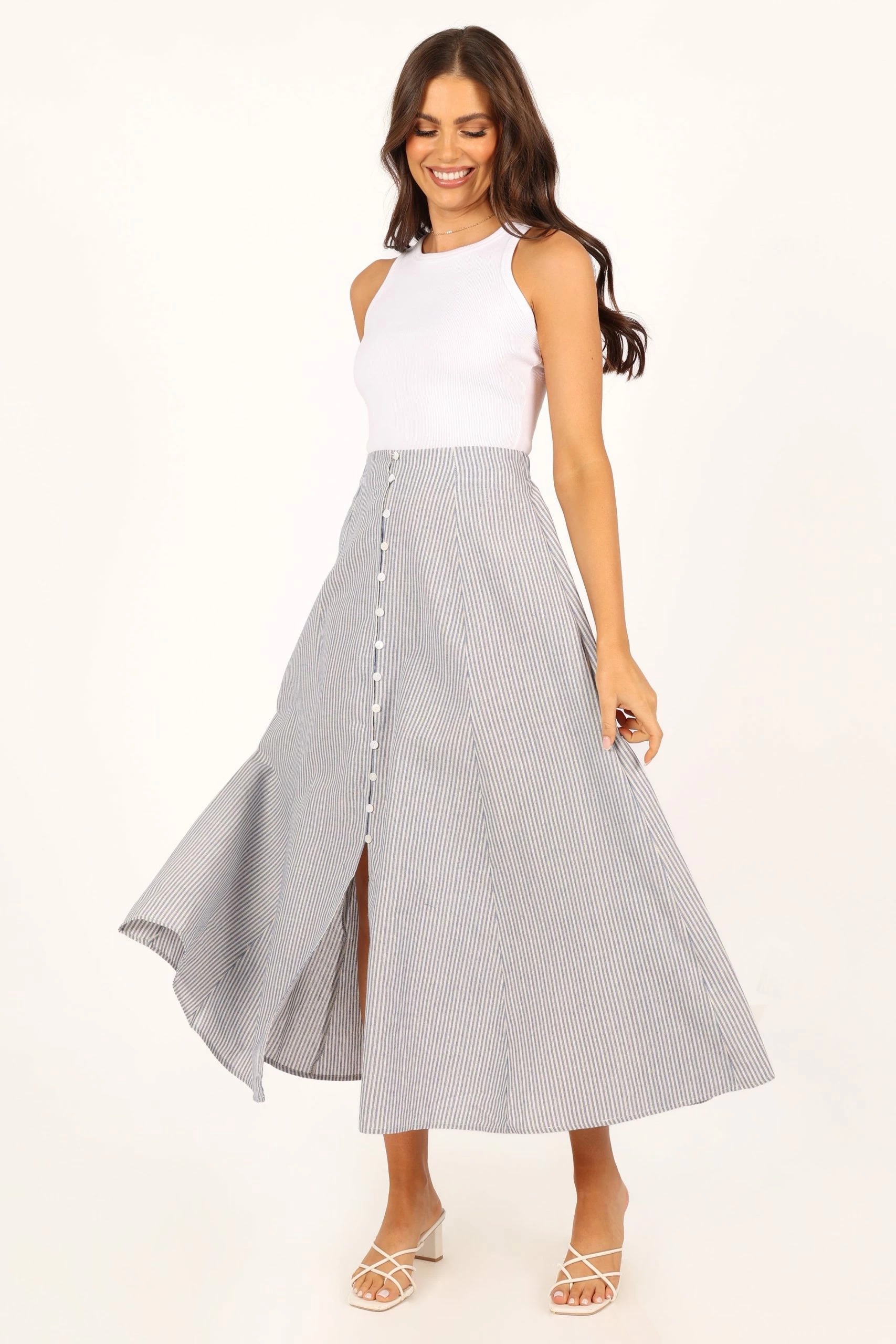 | DETAILS This midi length skirt is the perfect combination of style and sophistication. Crafted with an a-line design, front buttons and split and stripe fabrication with gold detailing, this look will turn heads wherever you go.