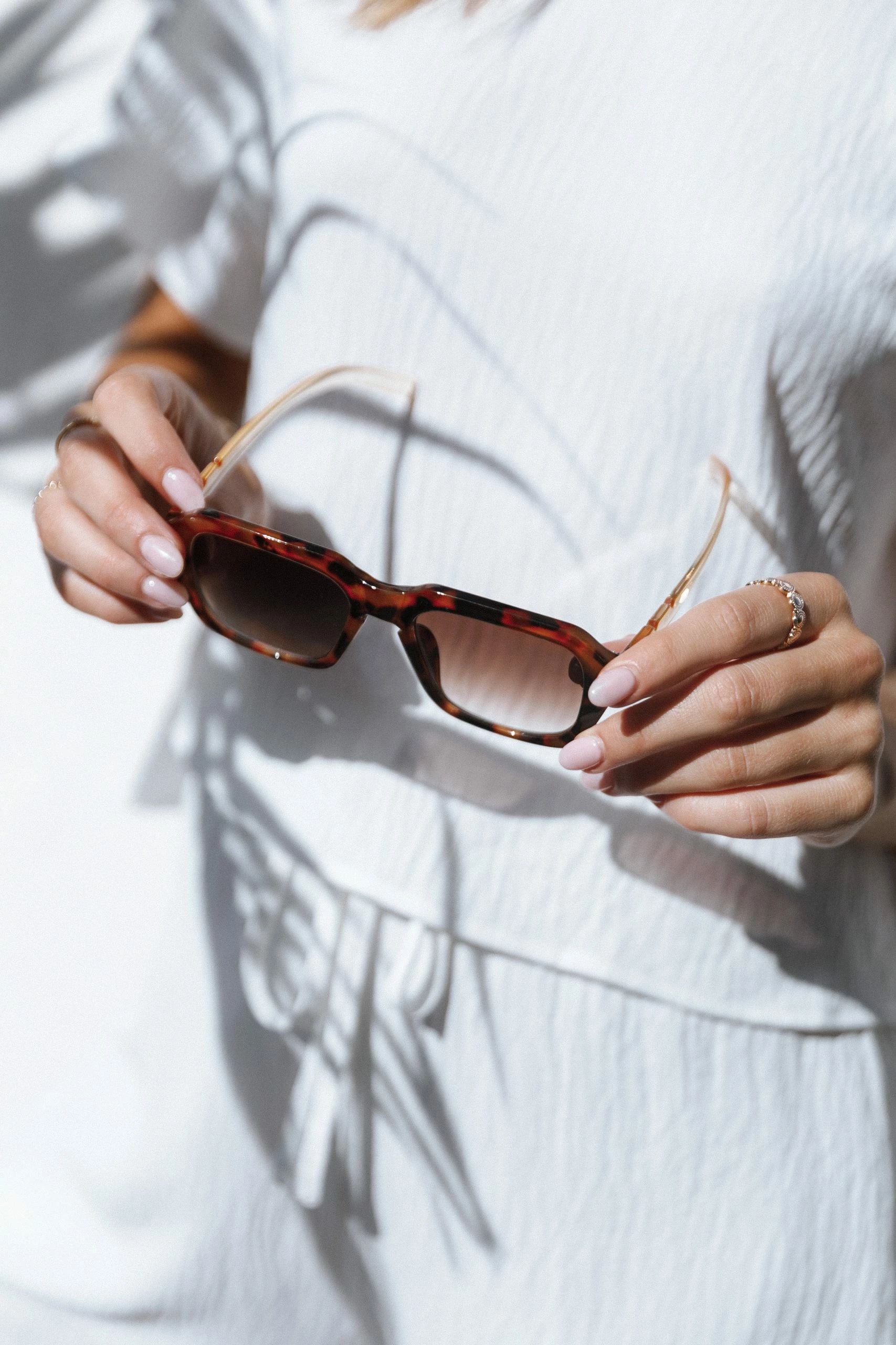Make summer chic with these stylish sunglasses! The square shape and thin frame are sure to make a statement, while the tortoiseshell frame color and brown lens color will bring out your summer glow.