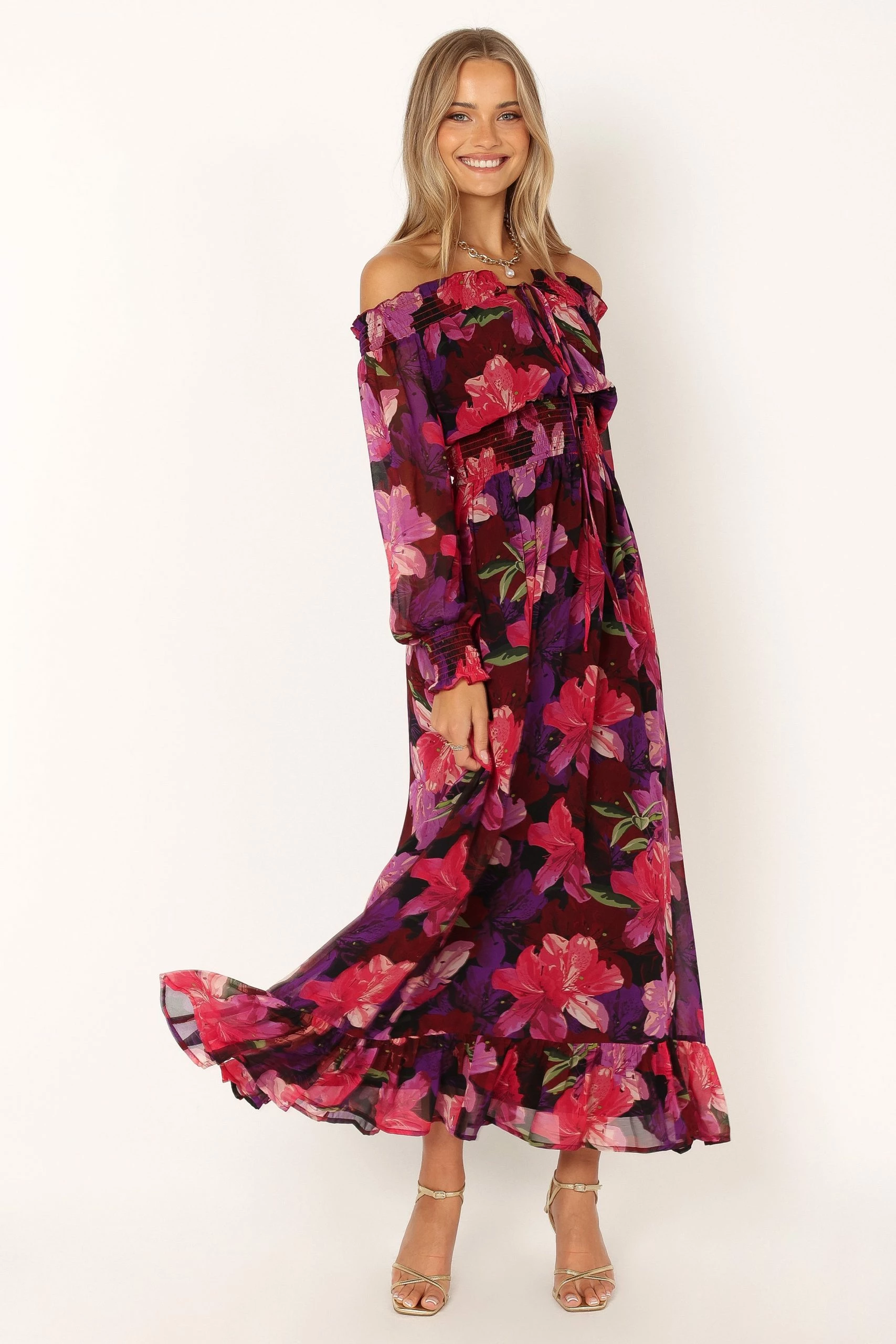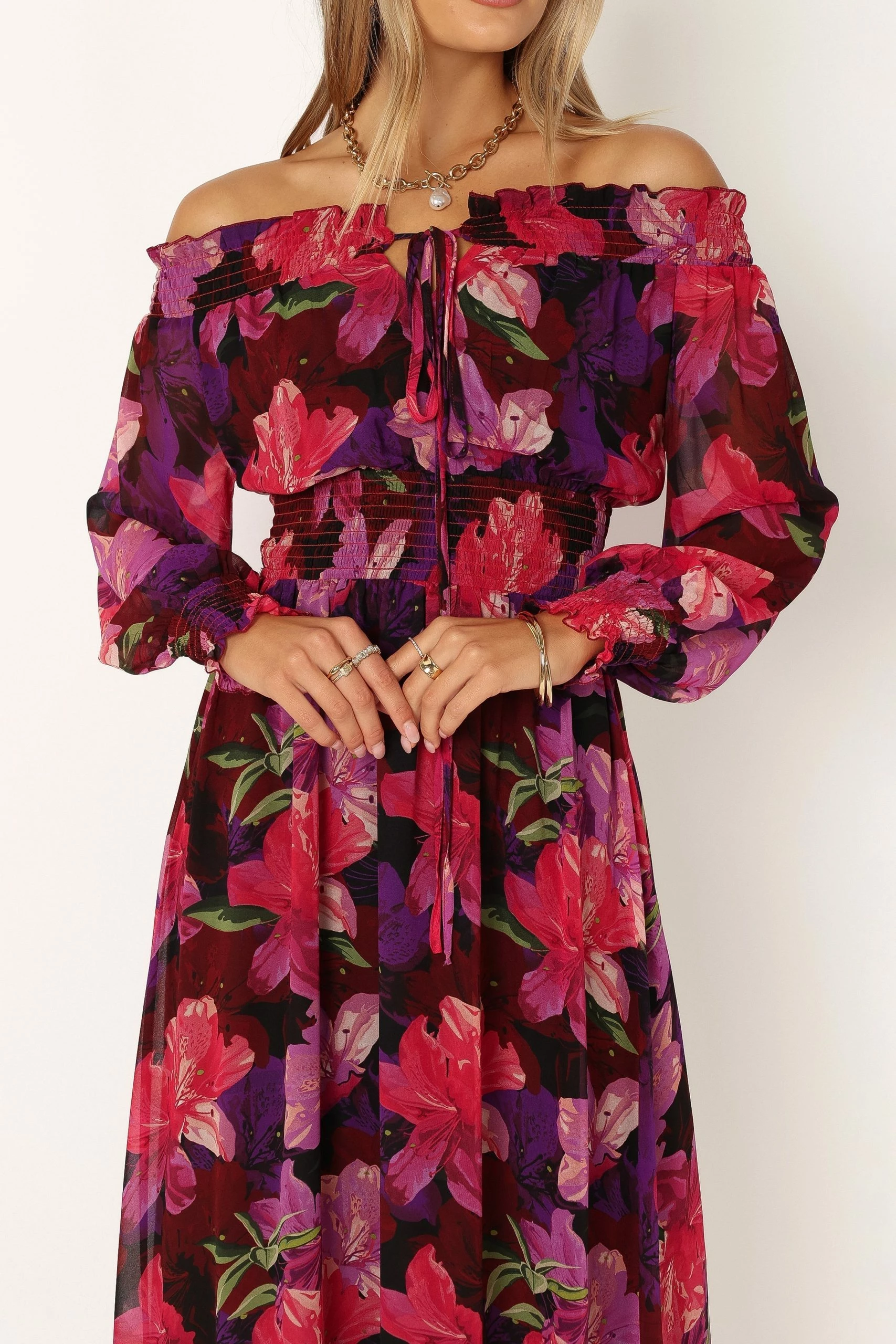 | DETAILS Introduce yourself to the new season with this maxi dress. Featuring a beautiful floral print, off shoulder style, shirred neckline and long sleeves with shirred cuffs, it’s perfect for sunny spring days. The unique bust cut out is designed with tie detail, giving it an extra feminine touch.