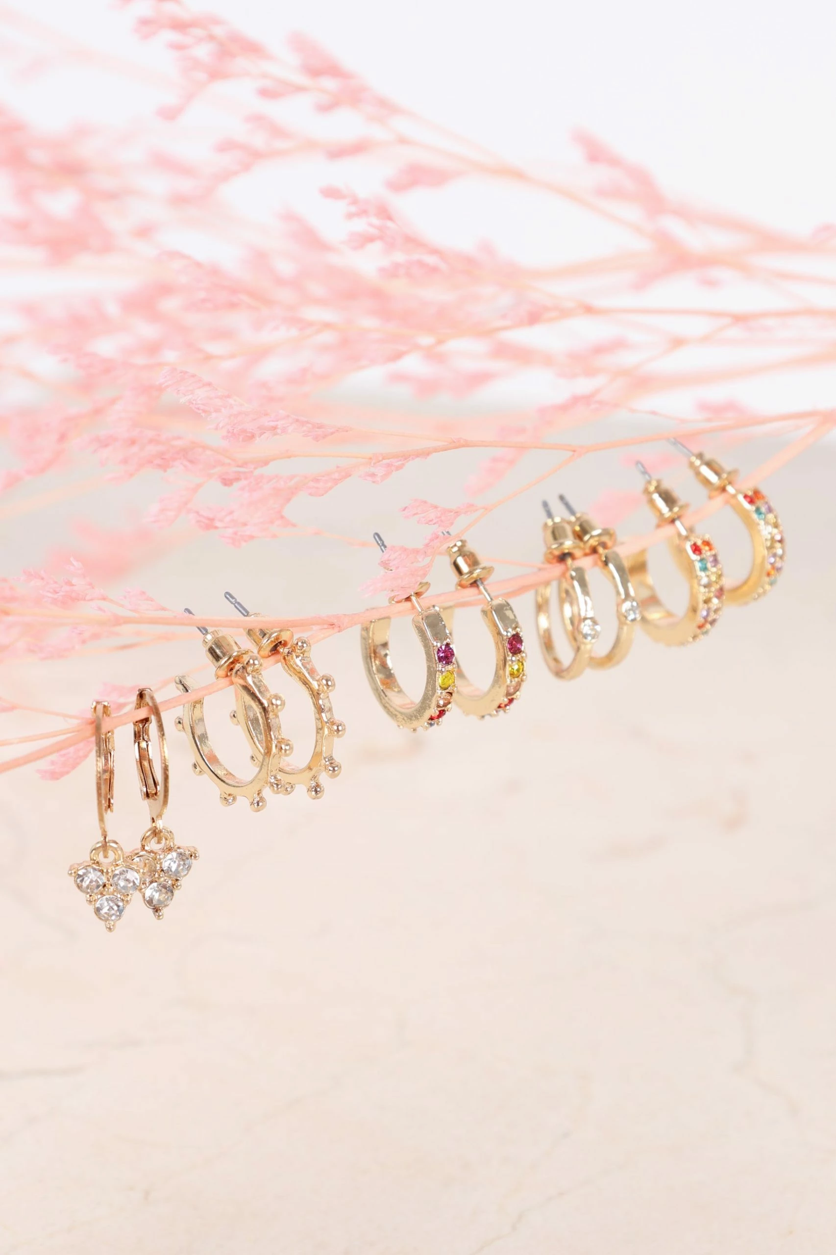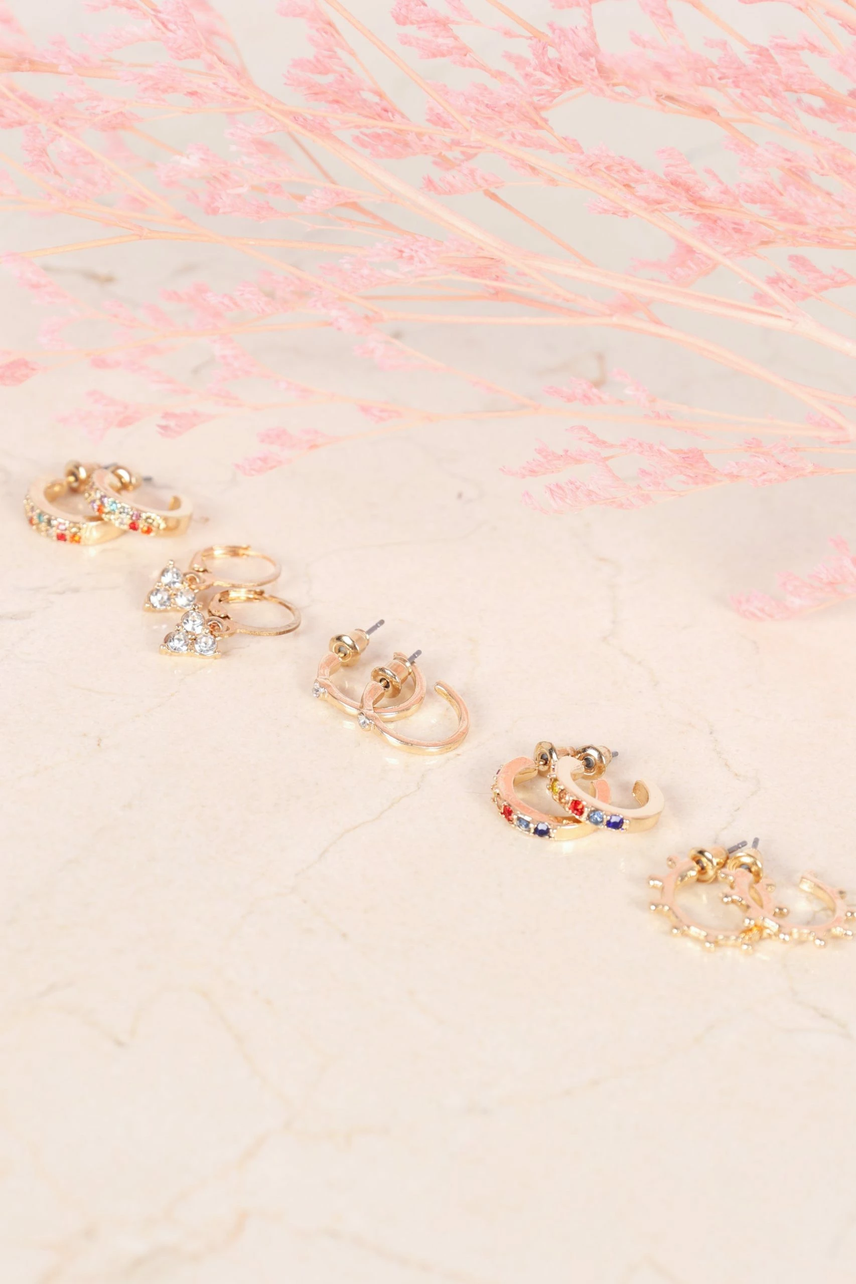 | DETAILS Add a pop of sparkle to your everyday look with these five dazzling earring designs. Featuring coloured crystal details, textured hoops and two different style closures, you’ll be sure to turn heads wherever you go!