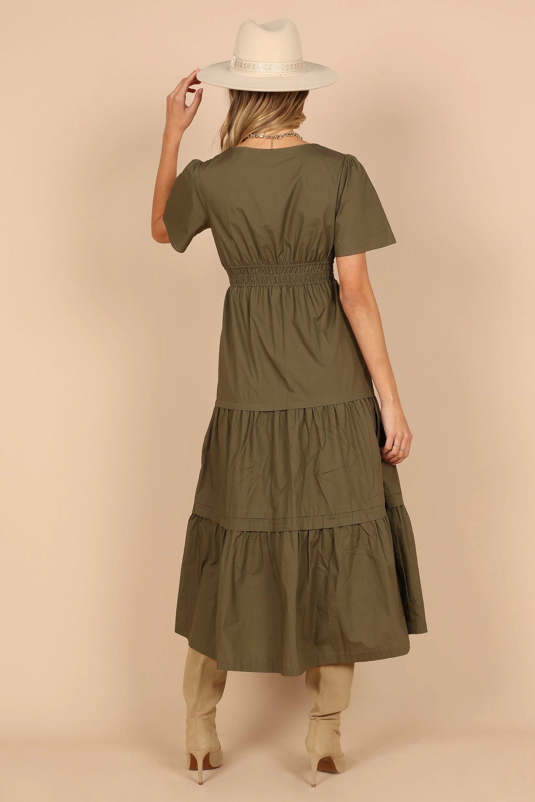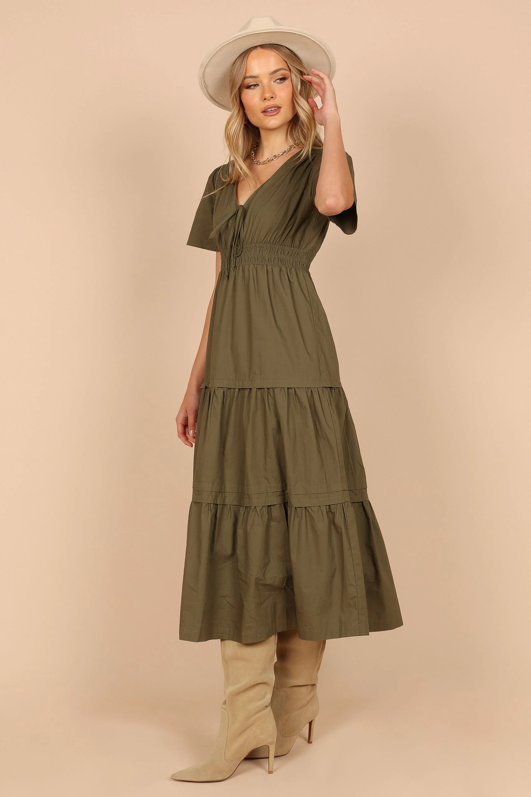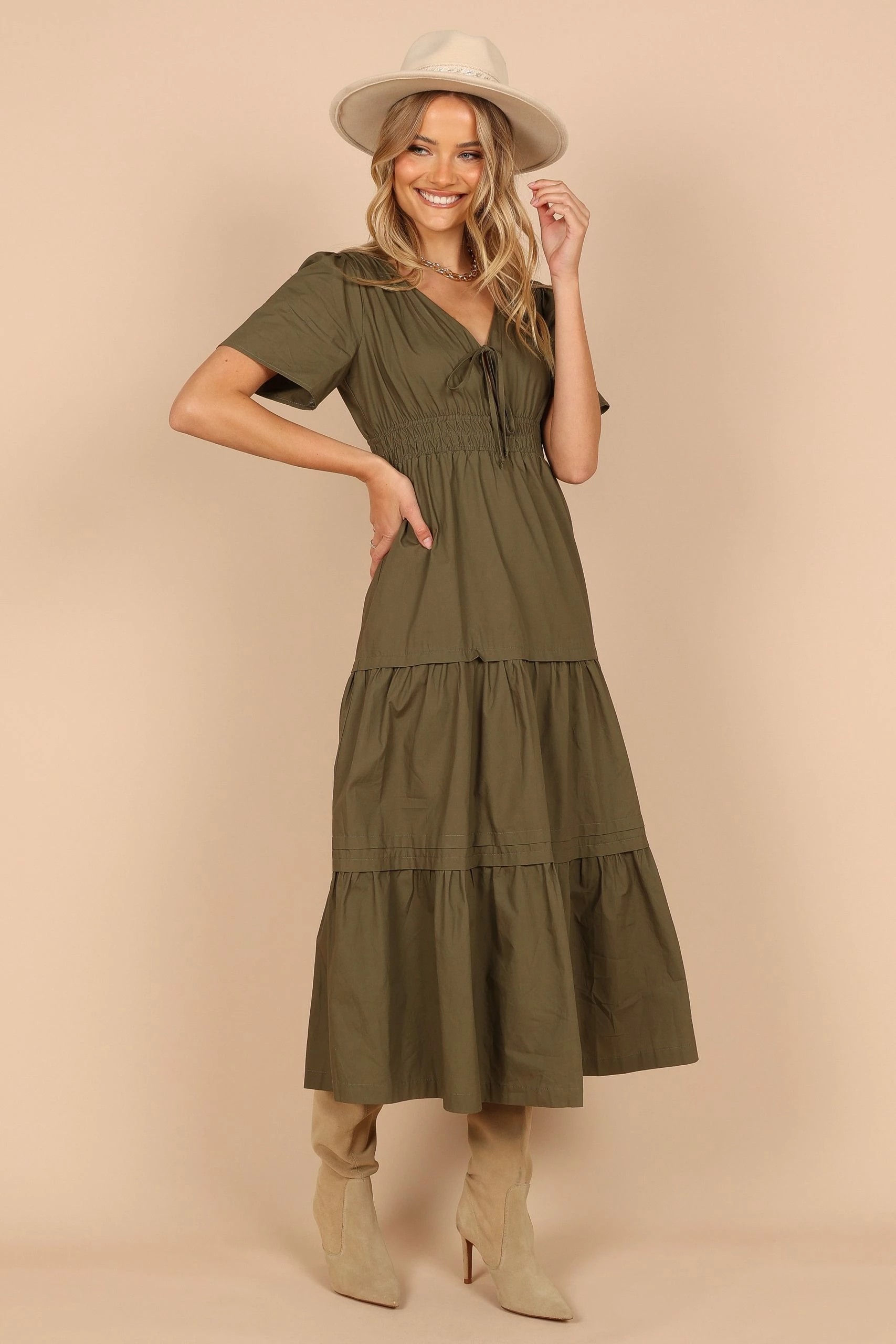 | DETAILS Make a statement in this olive maxi dress. This striking dress is perfect for your next special occasion or evening out on the town. Featuring a flattering v neckline with tie detail, short sleeves and an elasticised under bust, this beautiful maxi dress will ensure you look and feel fabulous all night long.