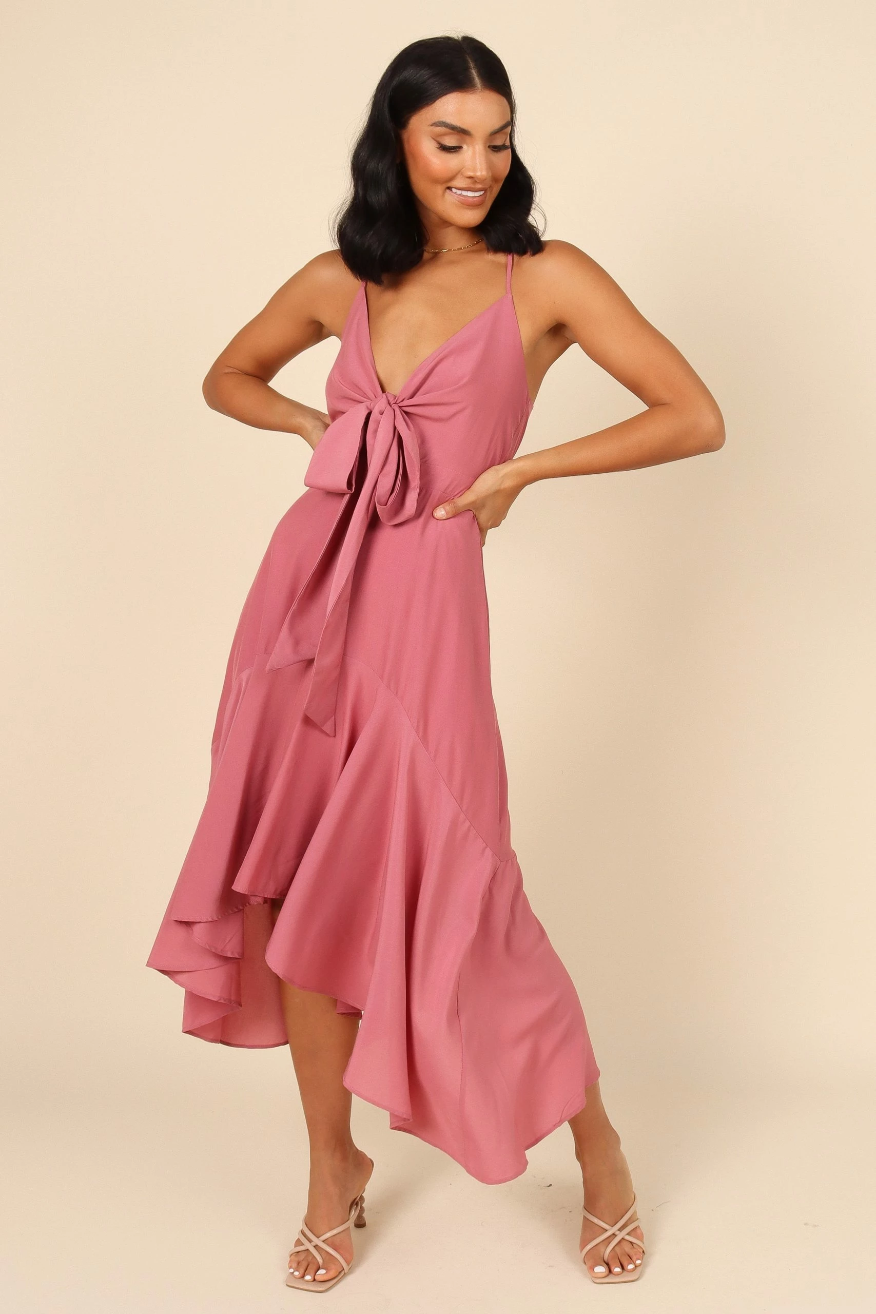 | DETAILS Looking for a show-stopping dress to make you stand out in the crowd? Look no further than this midi length beauty. It features a v neckline with stylish tie close detail, plus an eye-catching cut out under bust and thin adjustable shoulder straps.
