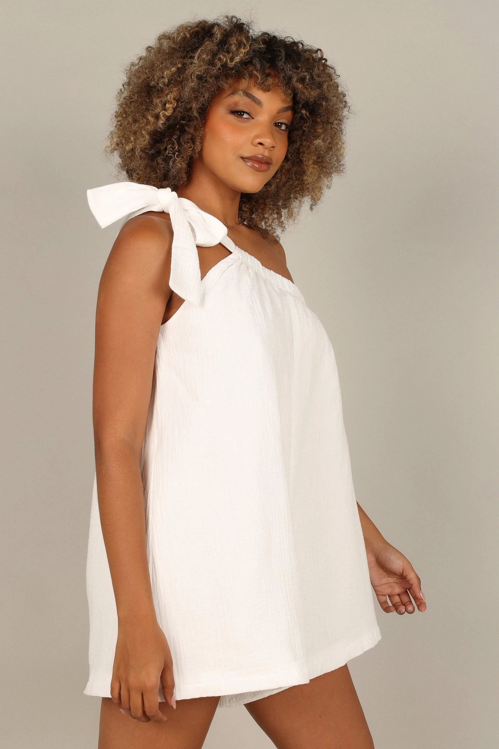 | DETAILS Feel the summer vibes in this fun and flirty playsuit! Featuring an asymmetric elasticised neckline, tie close shoulder strap and relaxed fit, you’ll stay comfortable all day long! Perfect for balmy days spent at the beach or those warm evening strolls in the city.